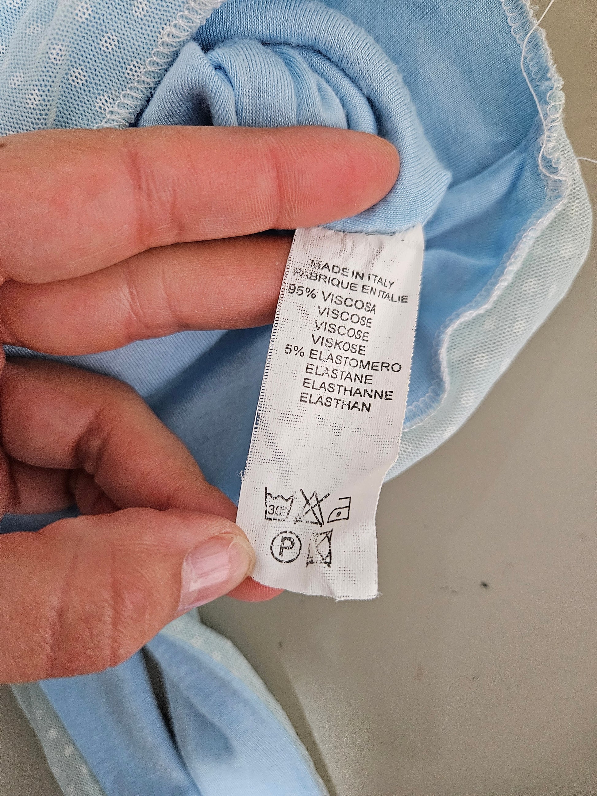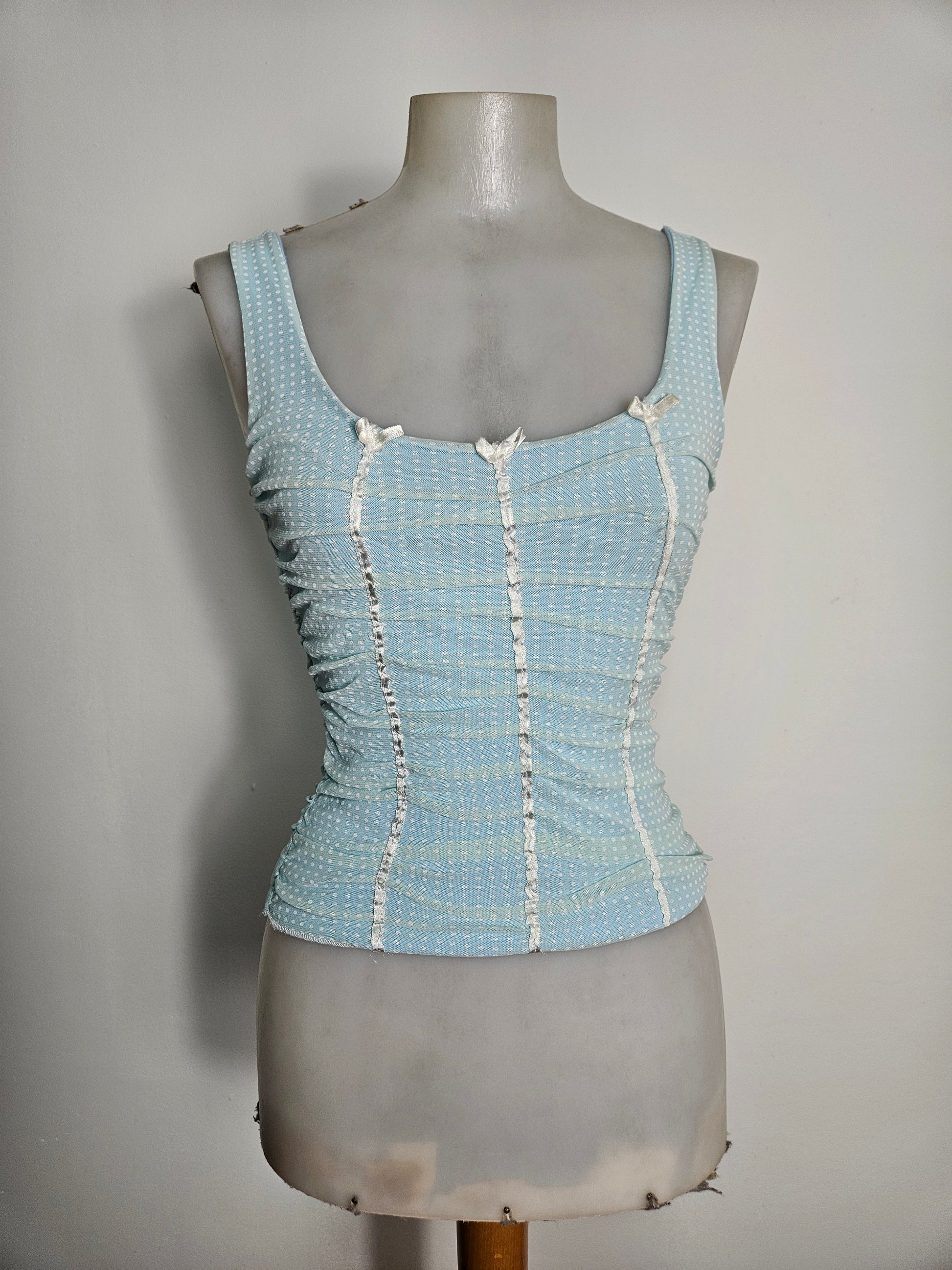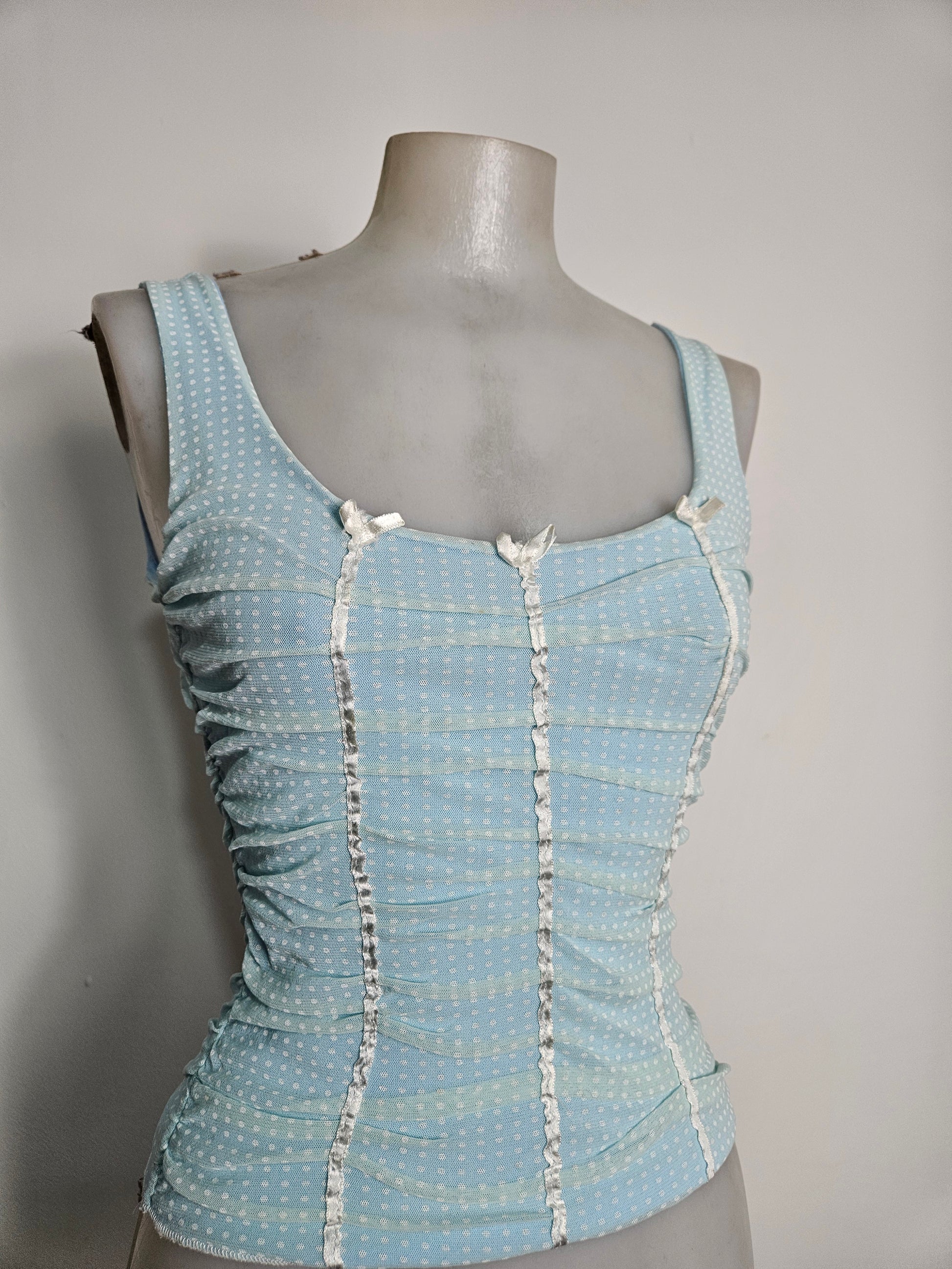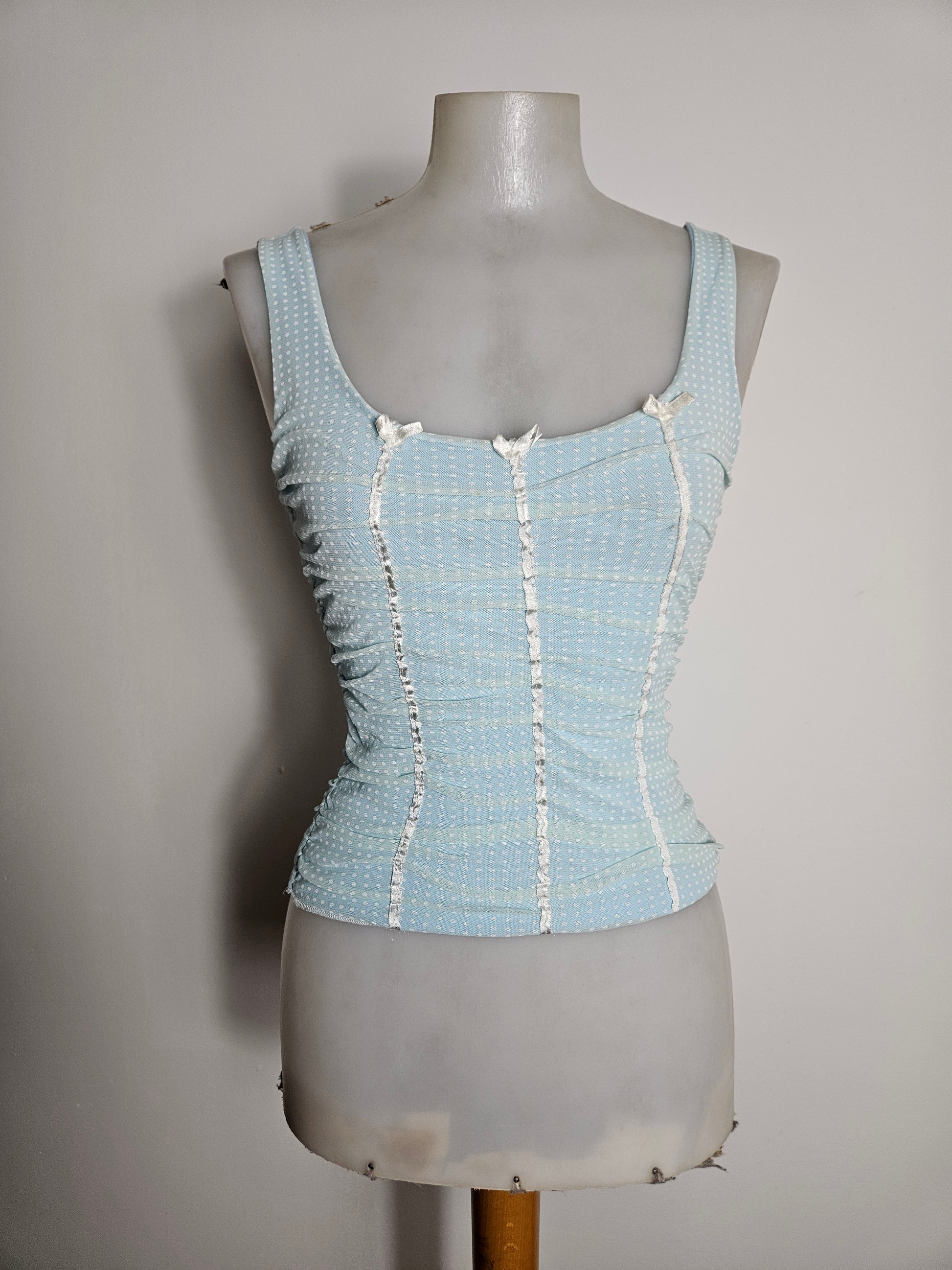 - Coutures apparentes avec finitions en ruban satiné blanc.