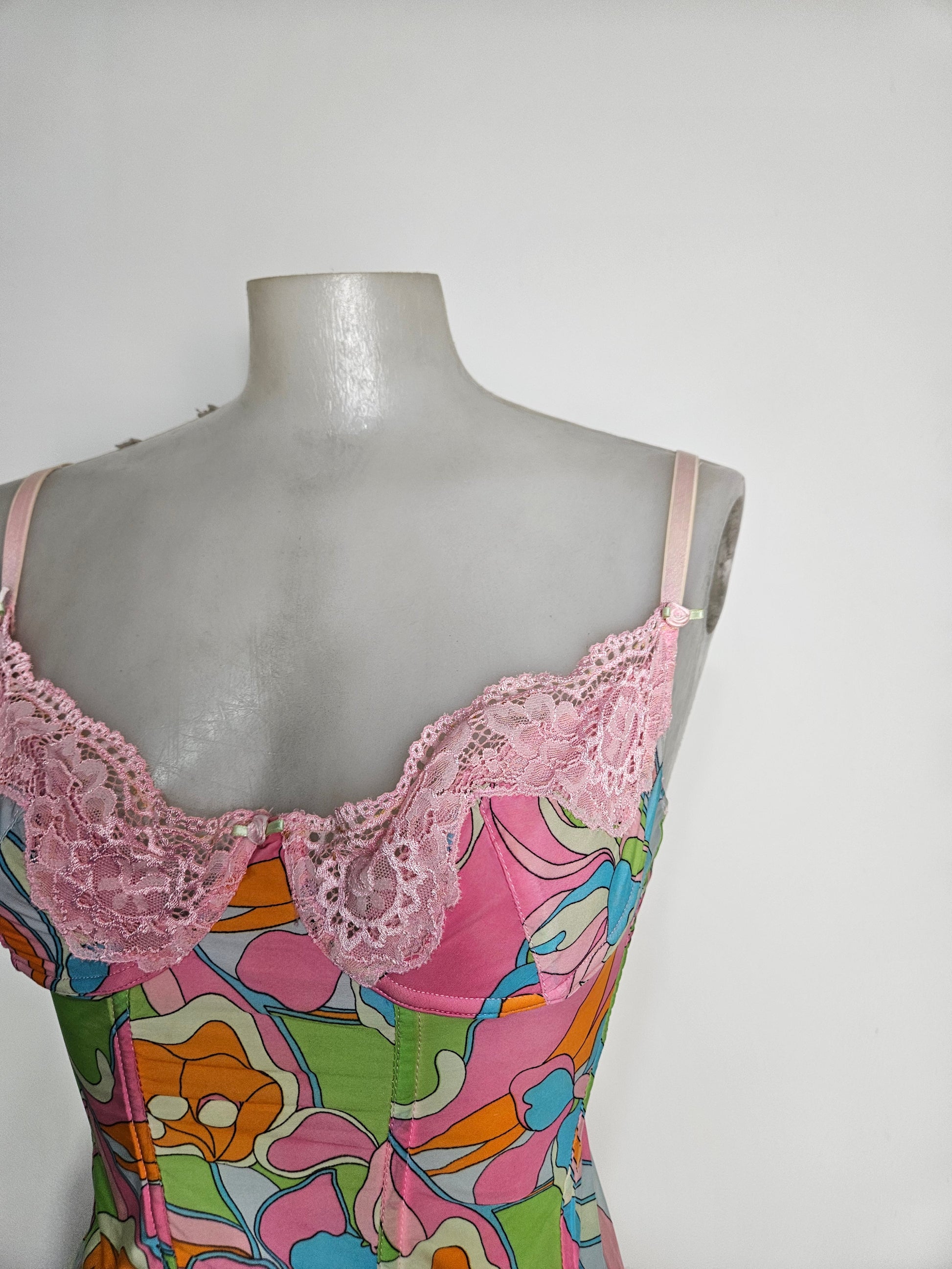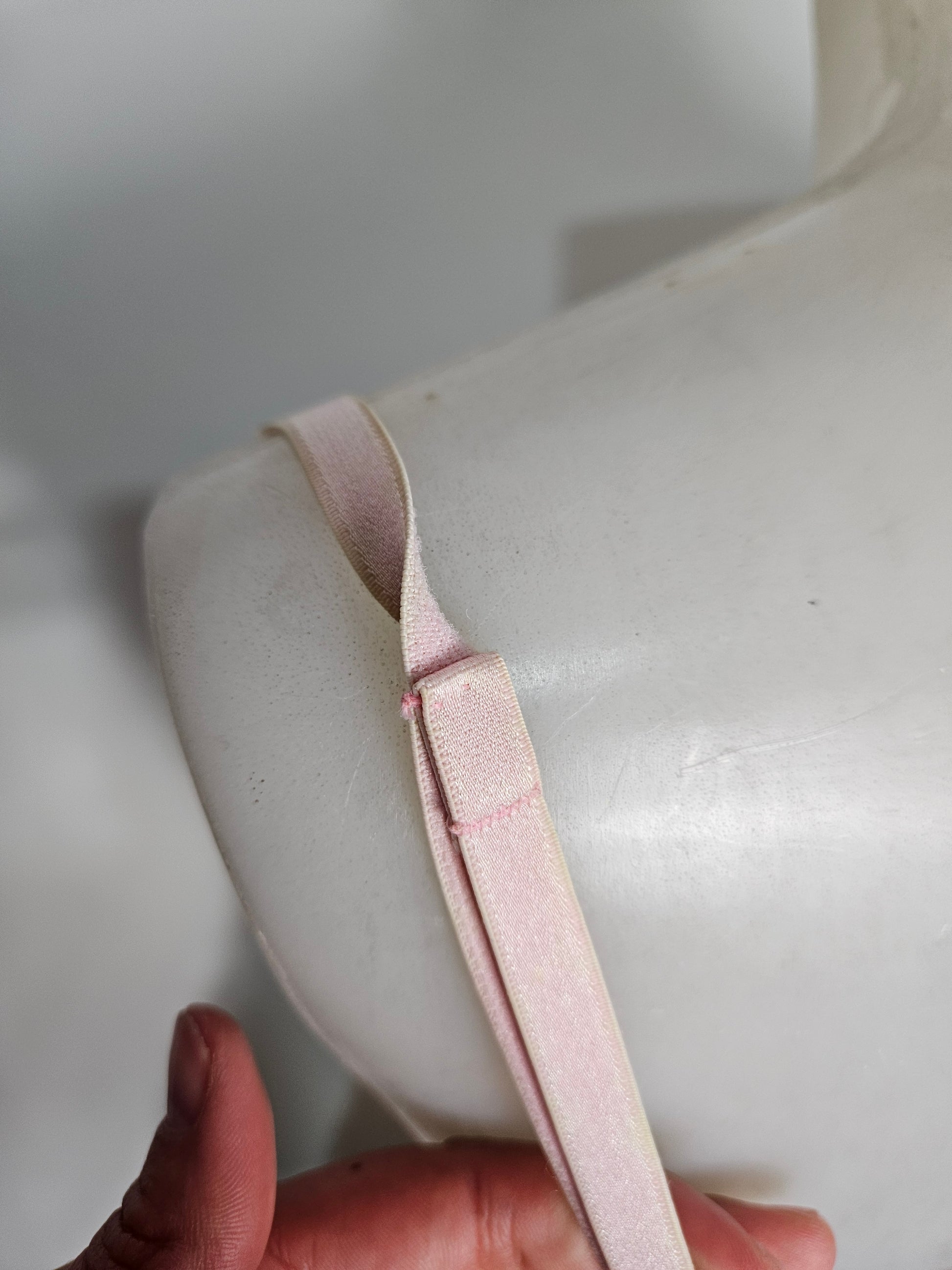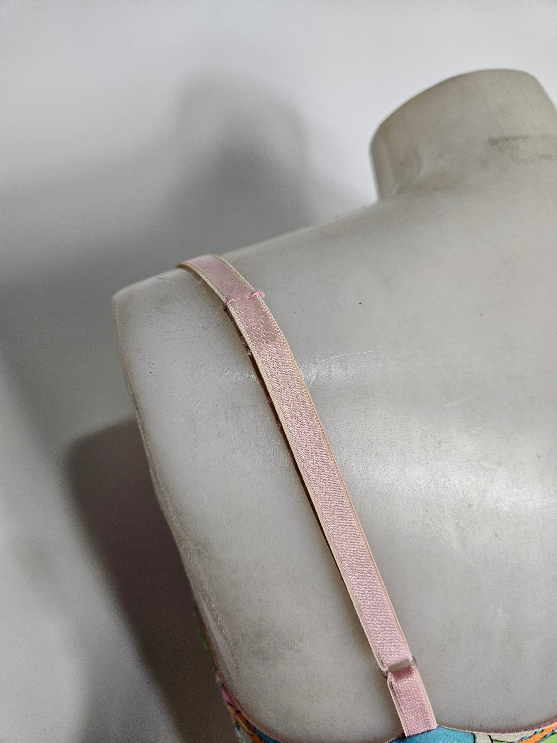 Les bonnets sont structurés par des armatures et bordés de dentelle rose sur le haut. La structure du bustier présente des coutures verticales (baleines souples).
