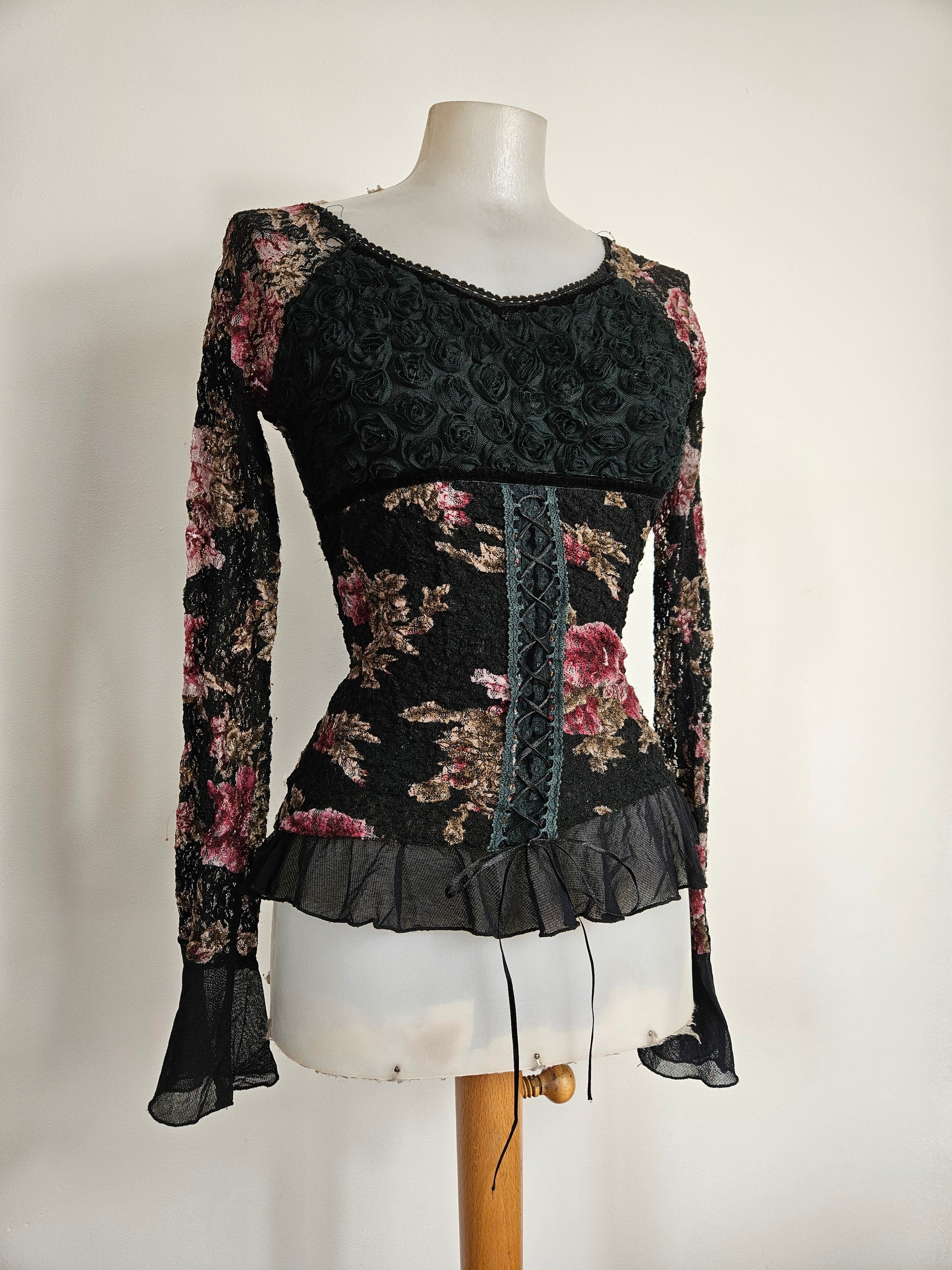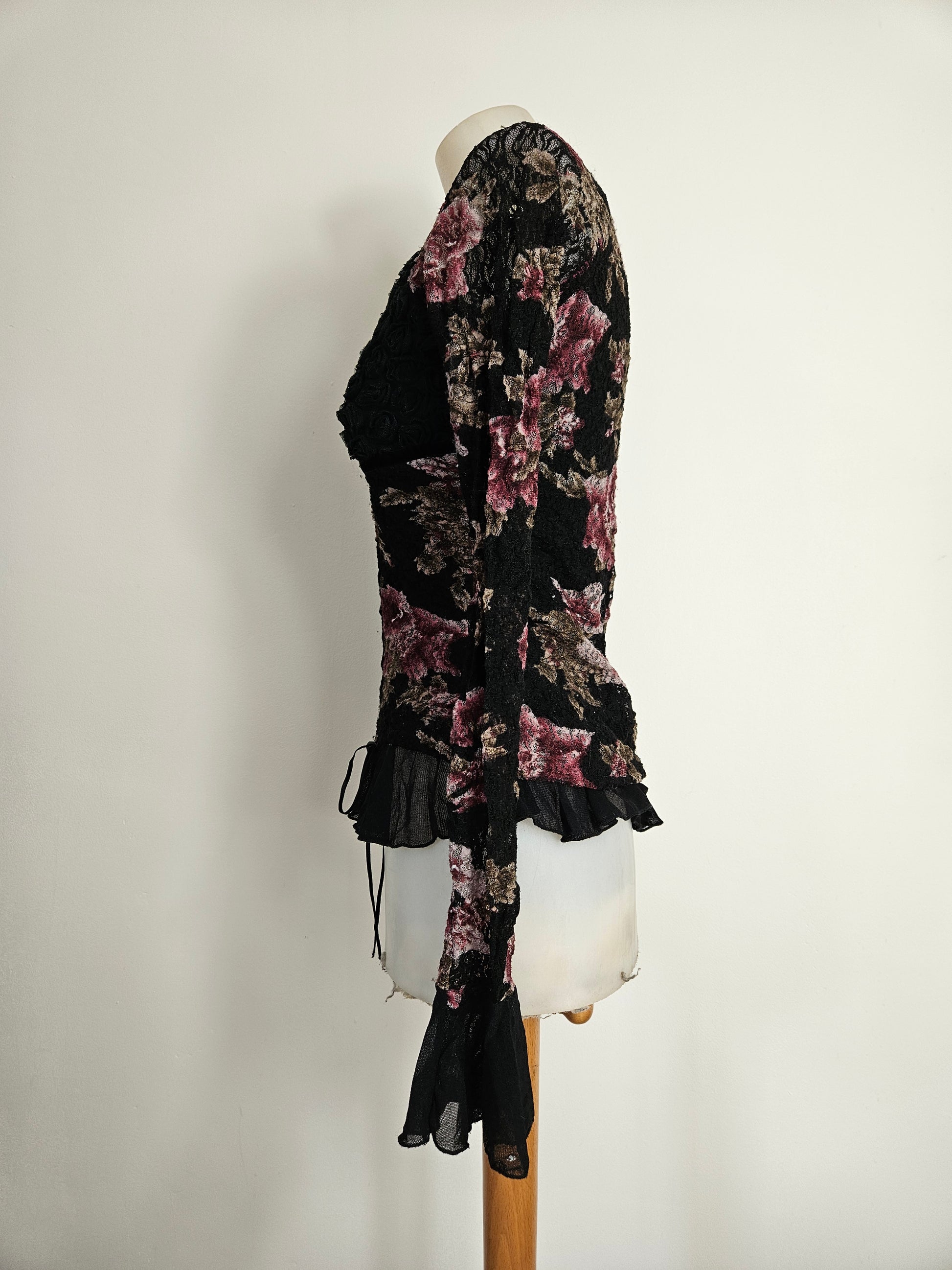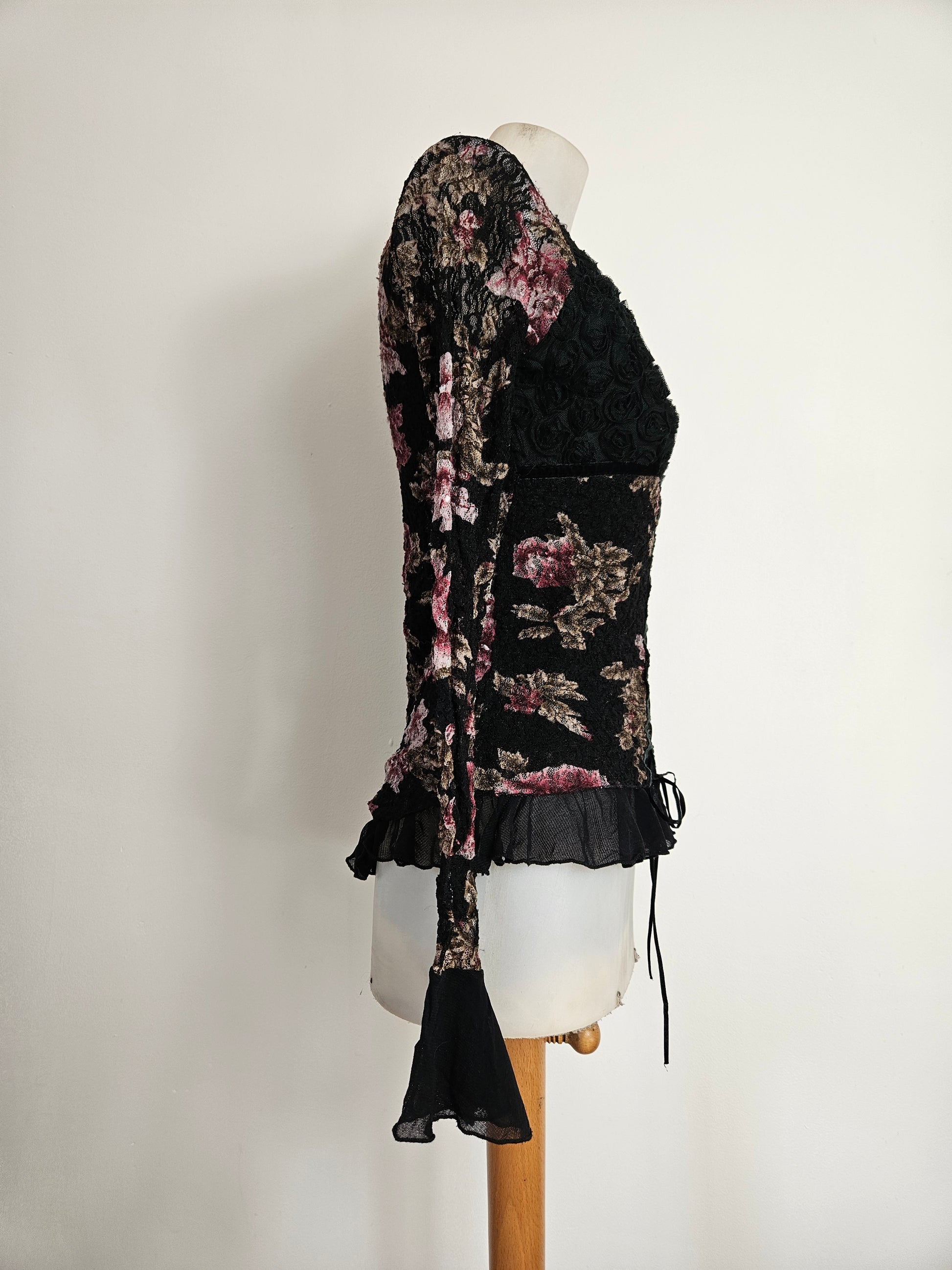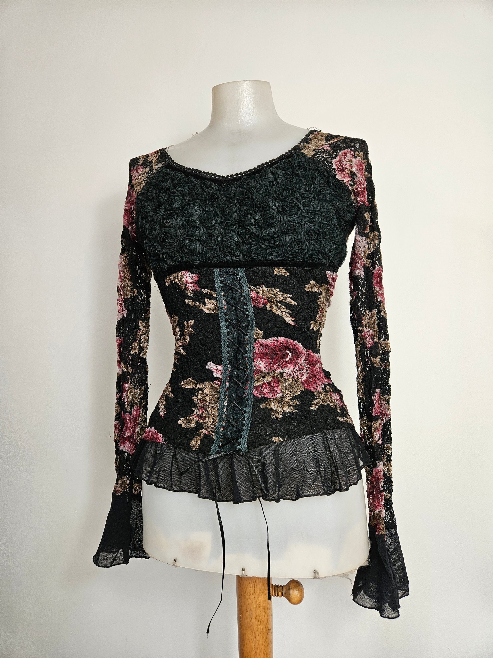 - Haut gothique fleuri noir avec motifs floraux bordeaux et beige