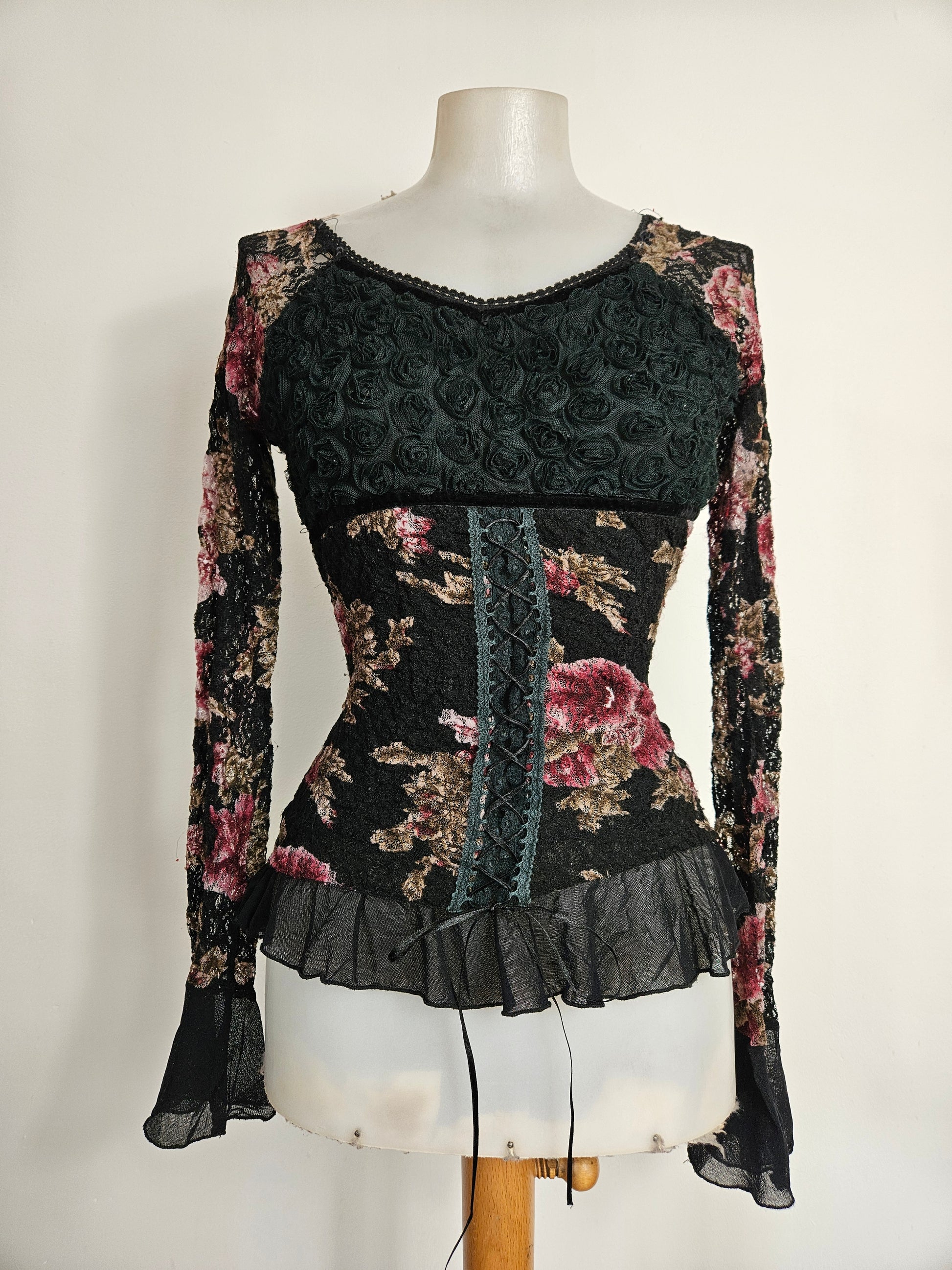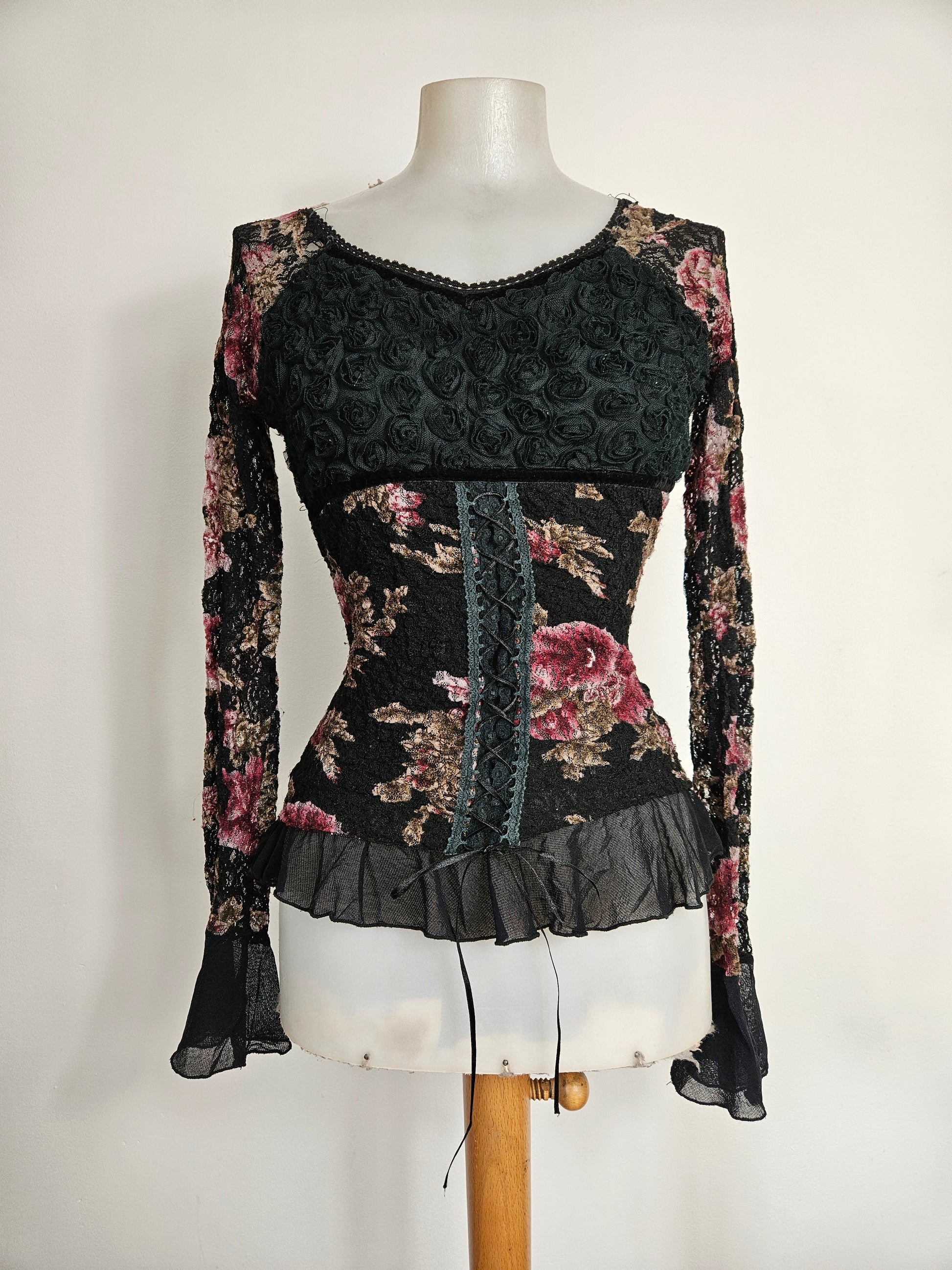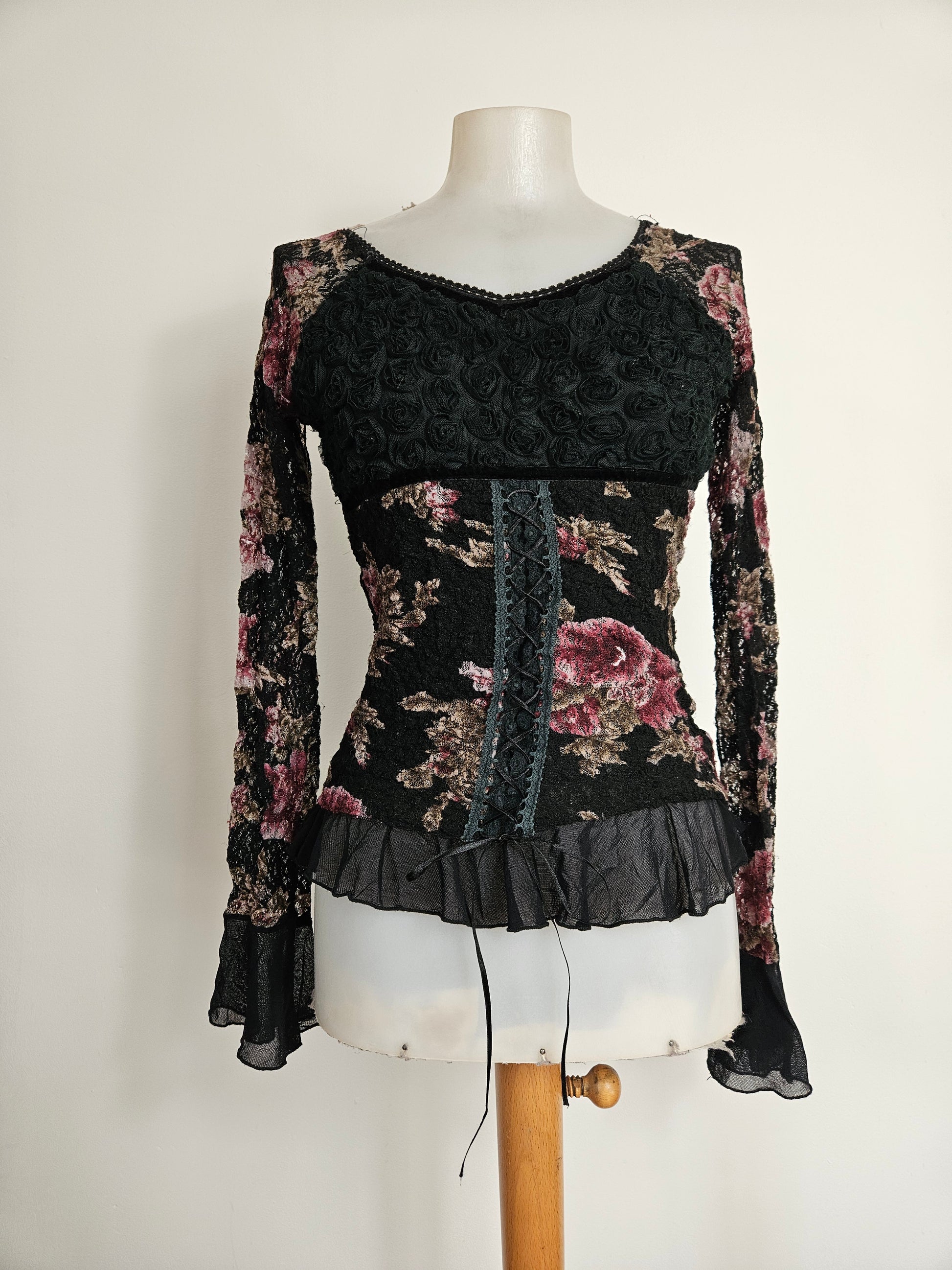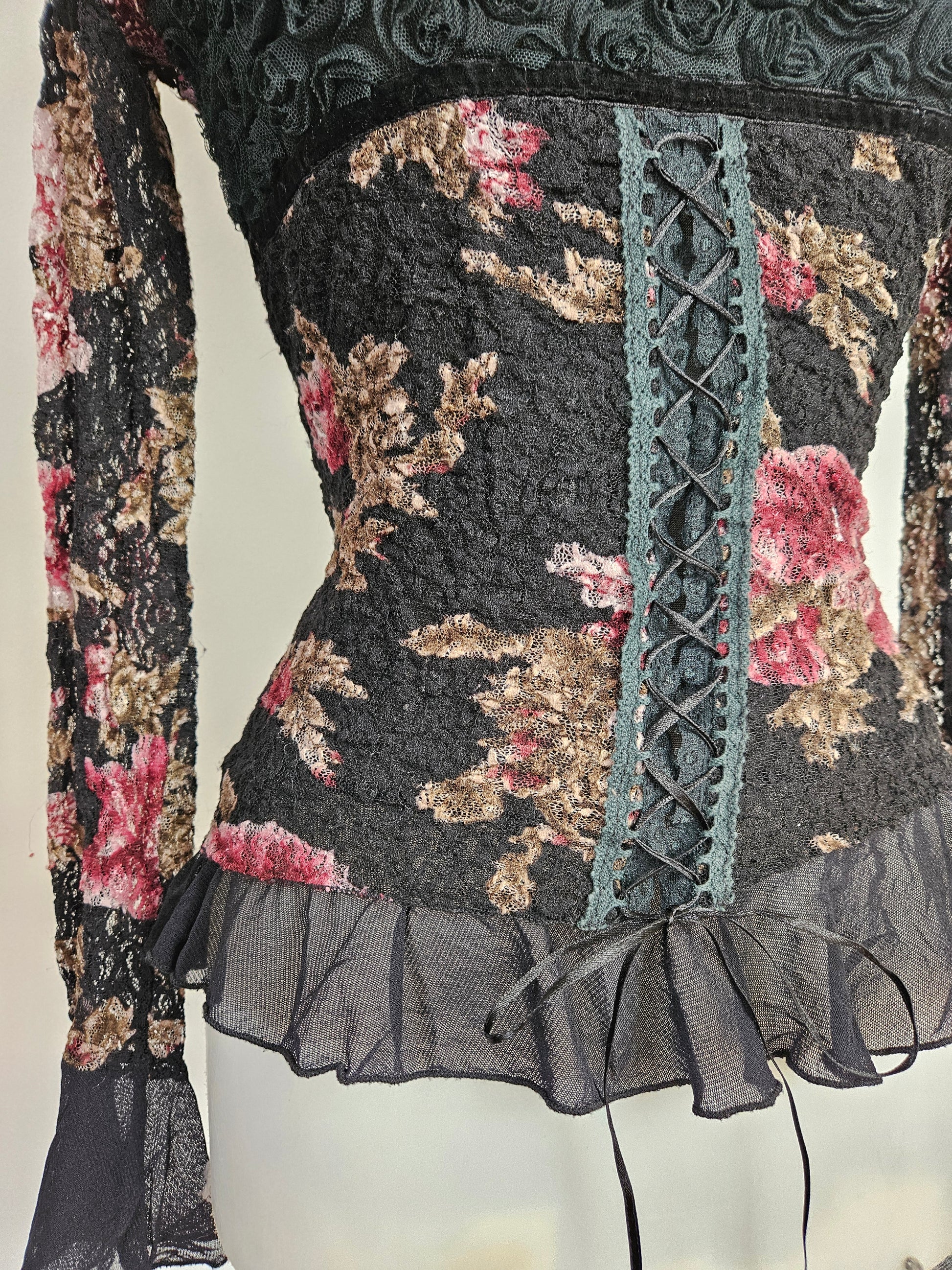 - Haut gothique fleuri noir avec motifs floraux bordeaux et beige