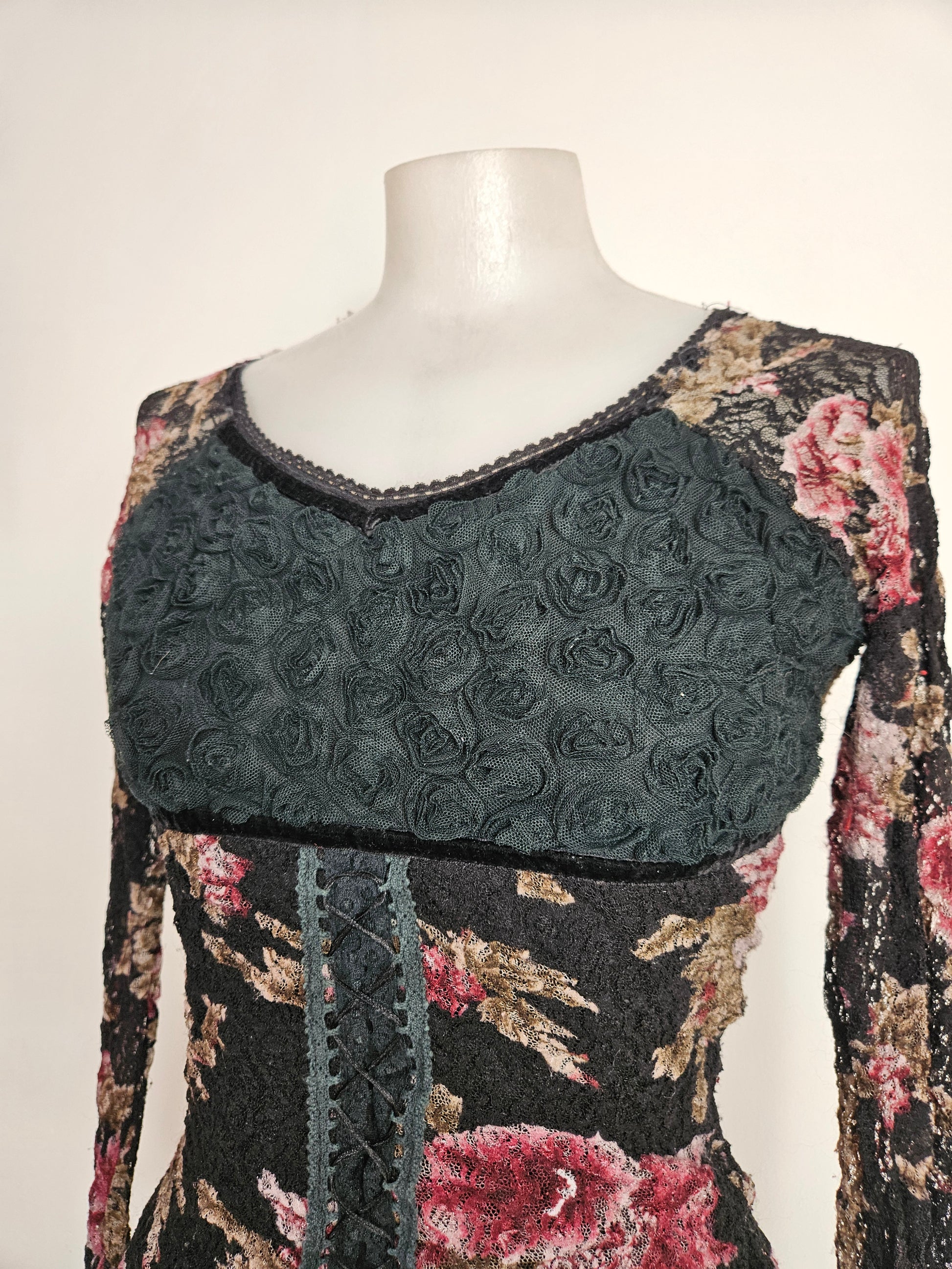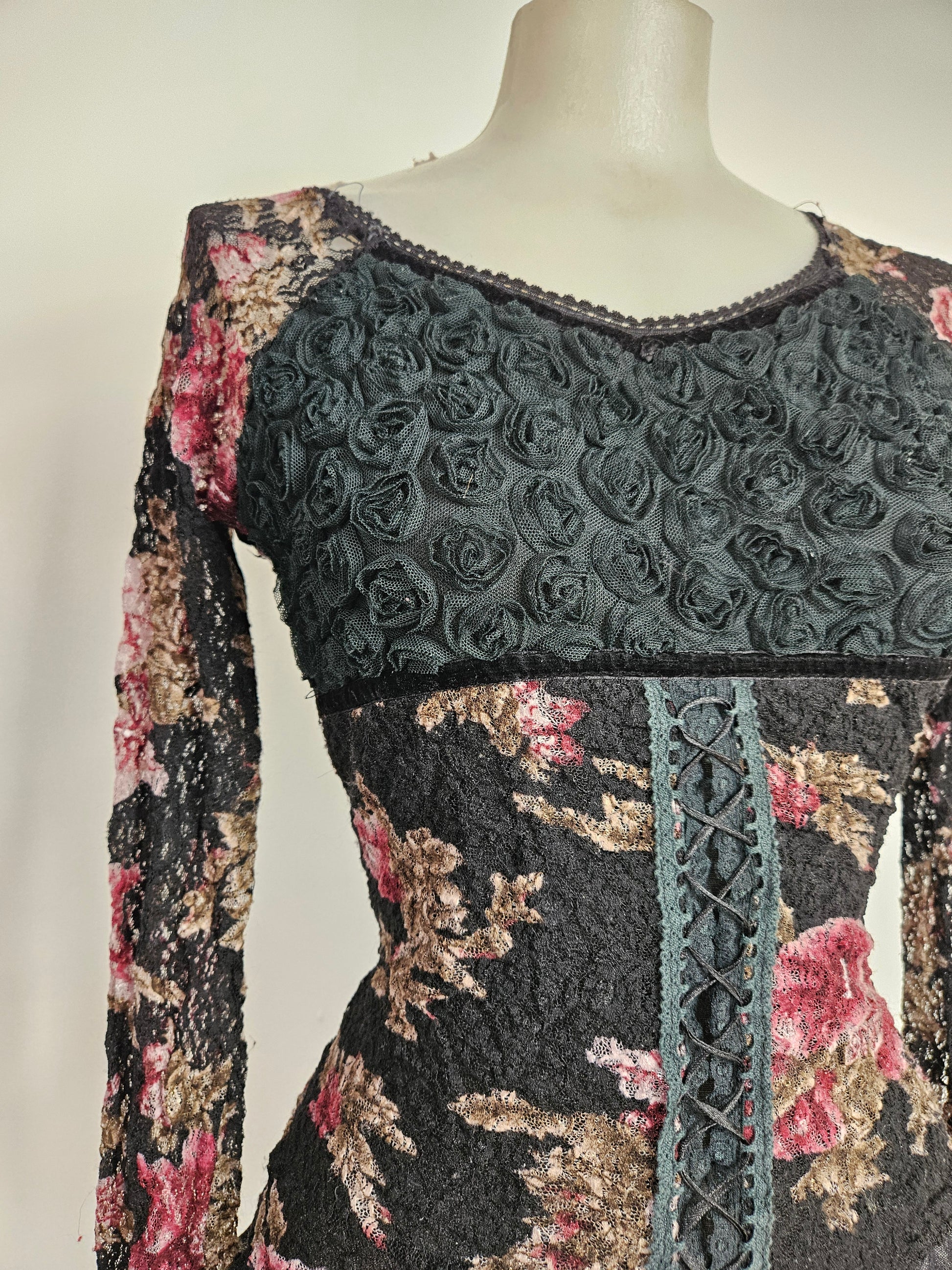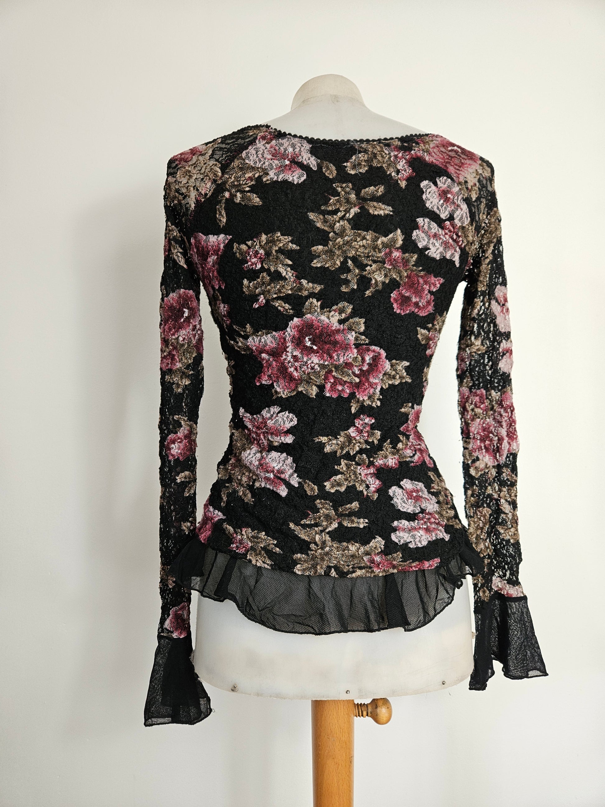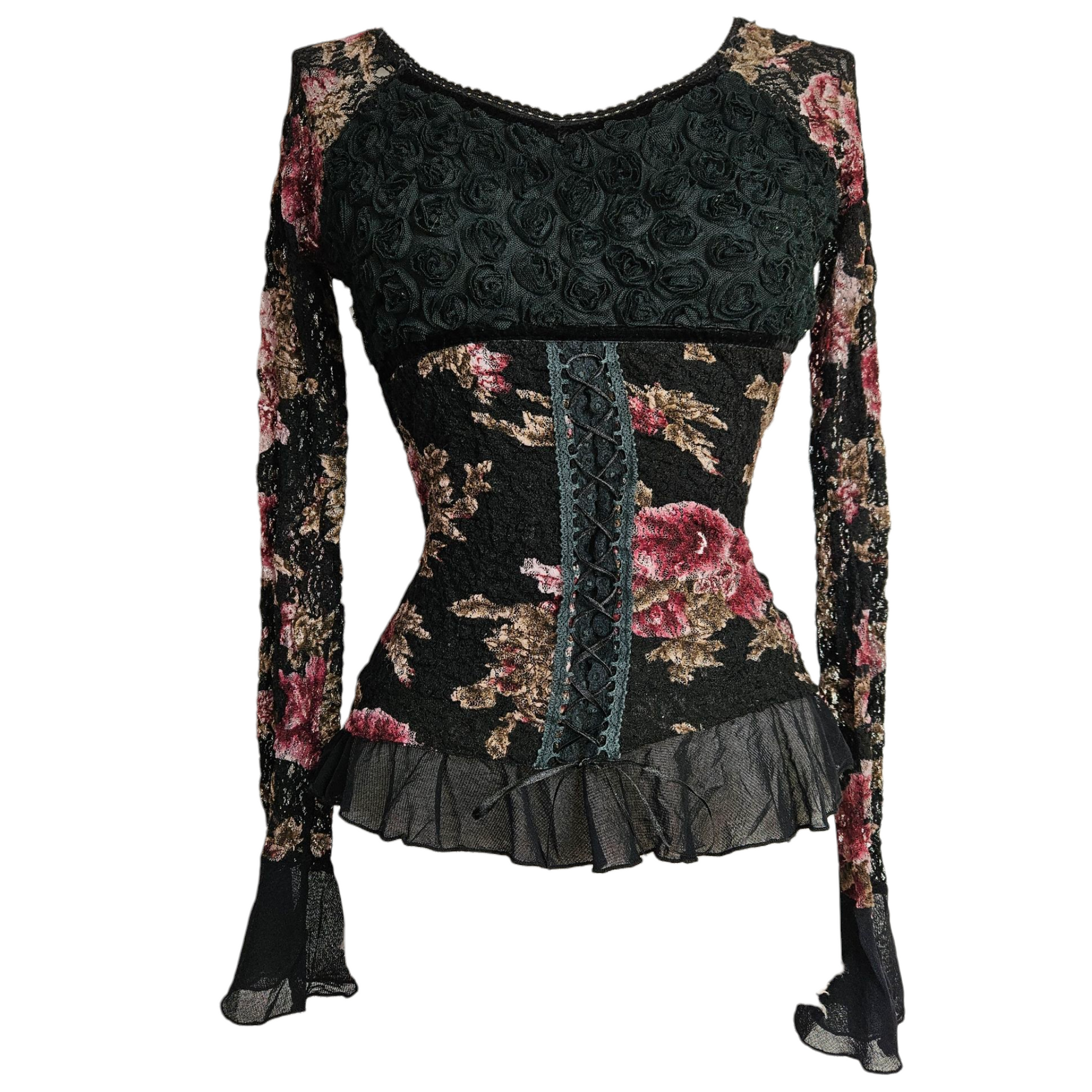 - Haut gothique fleuri noir avec motifs floraux bordeaux et beige