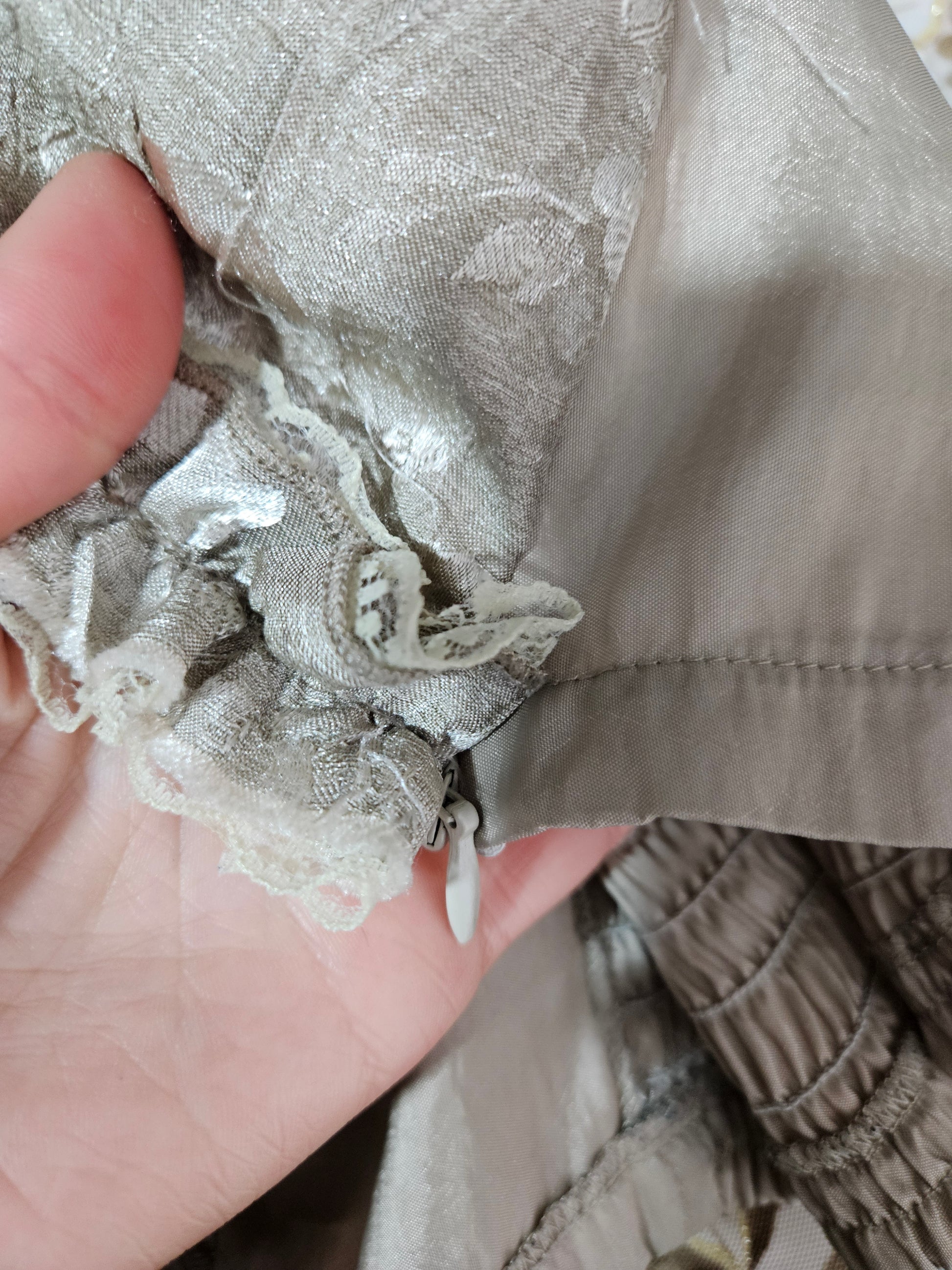 - Détails en dentelle crème et fronces délicates