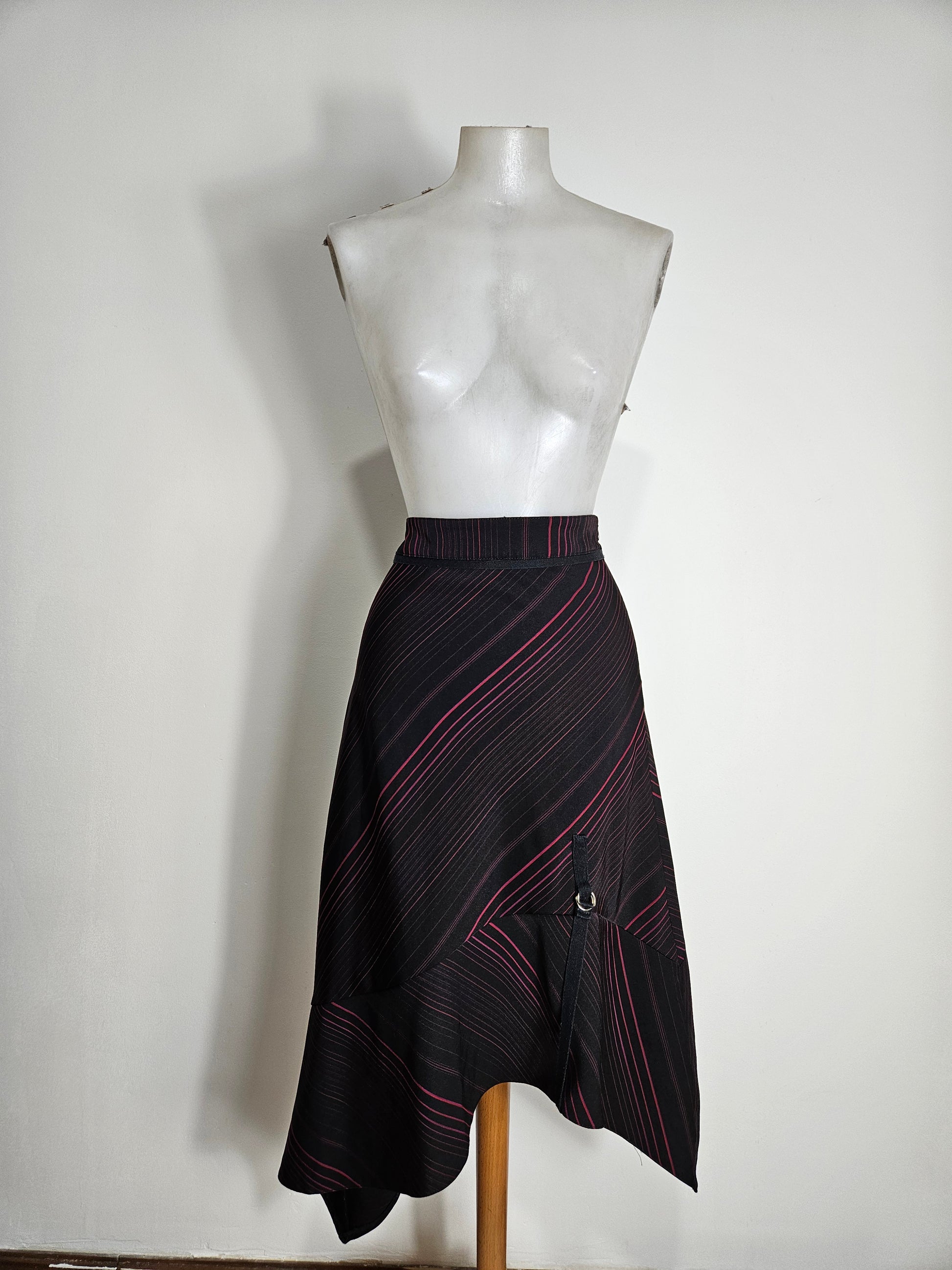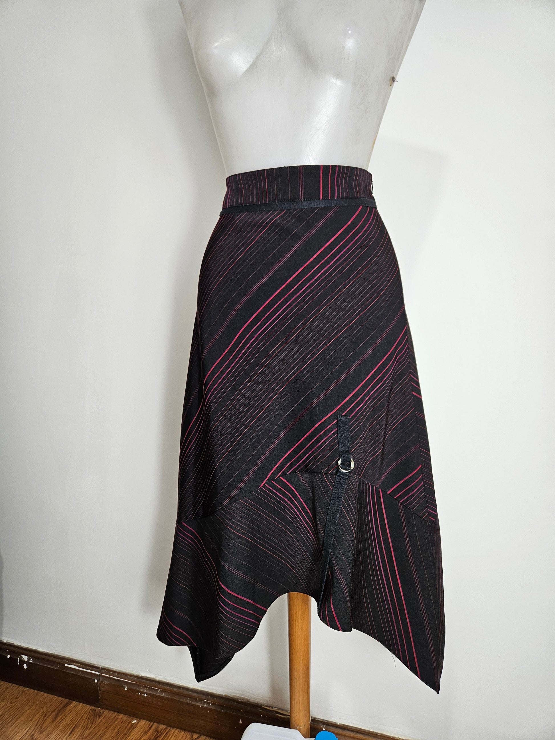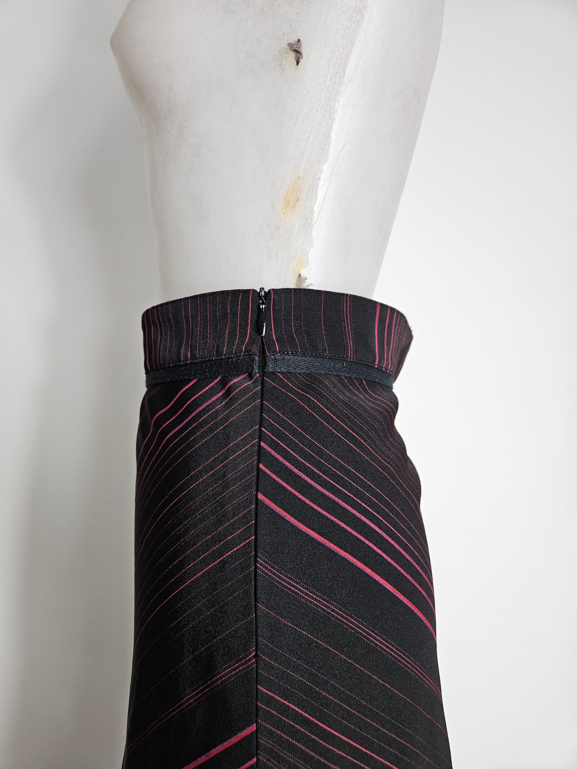 - Jupe asymétrique noire avec rayures rouges et violettes.