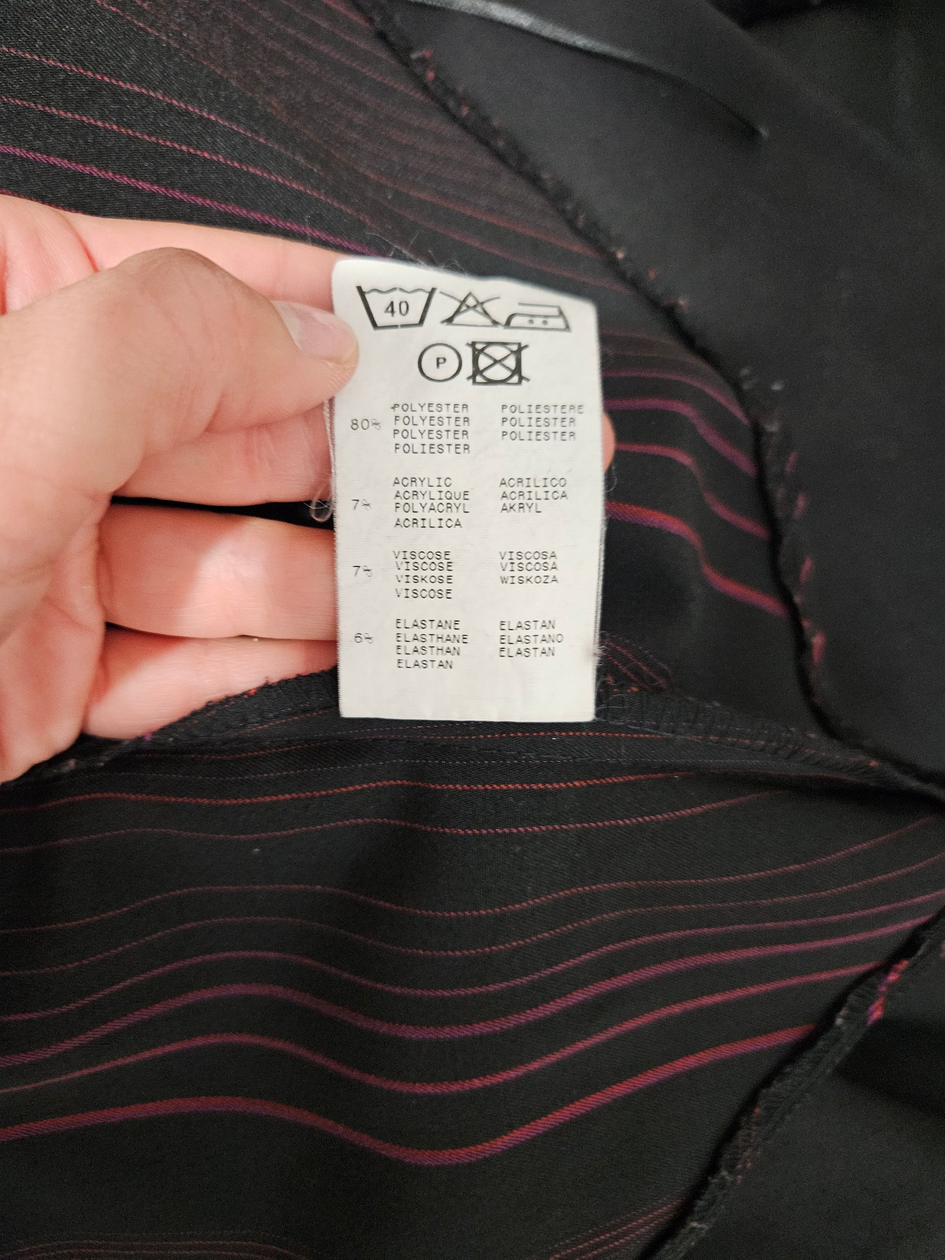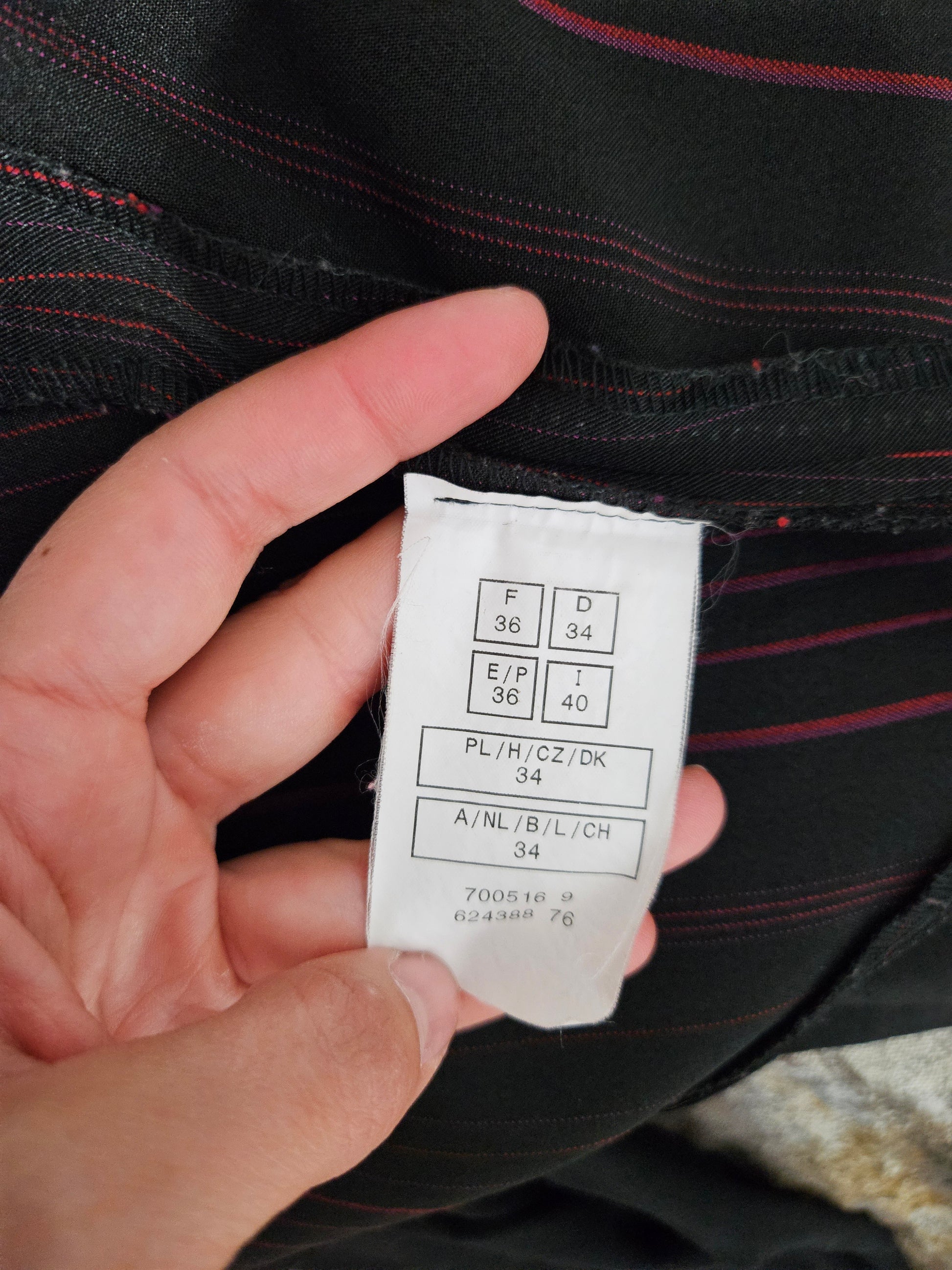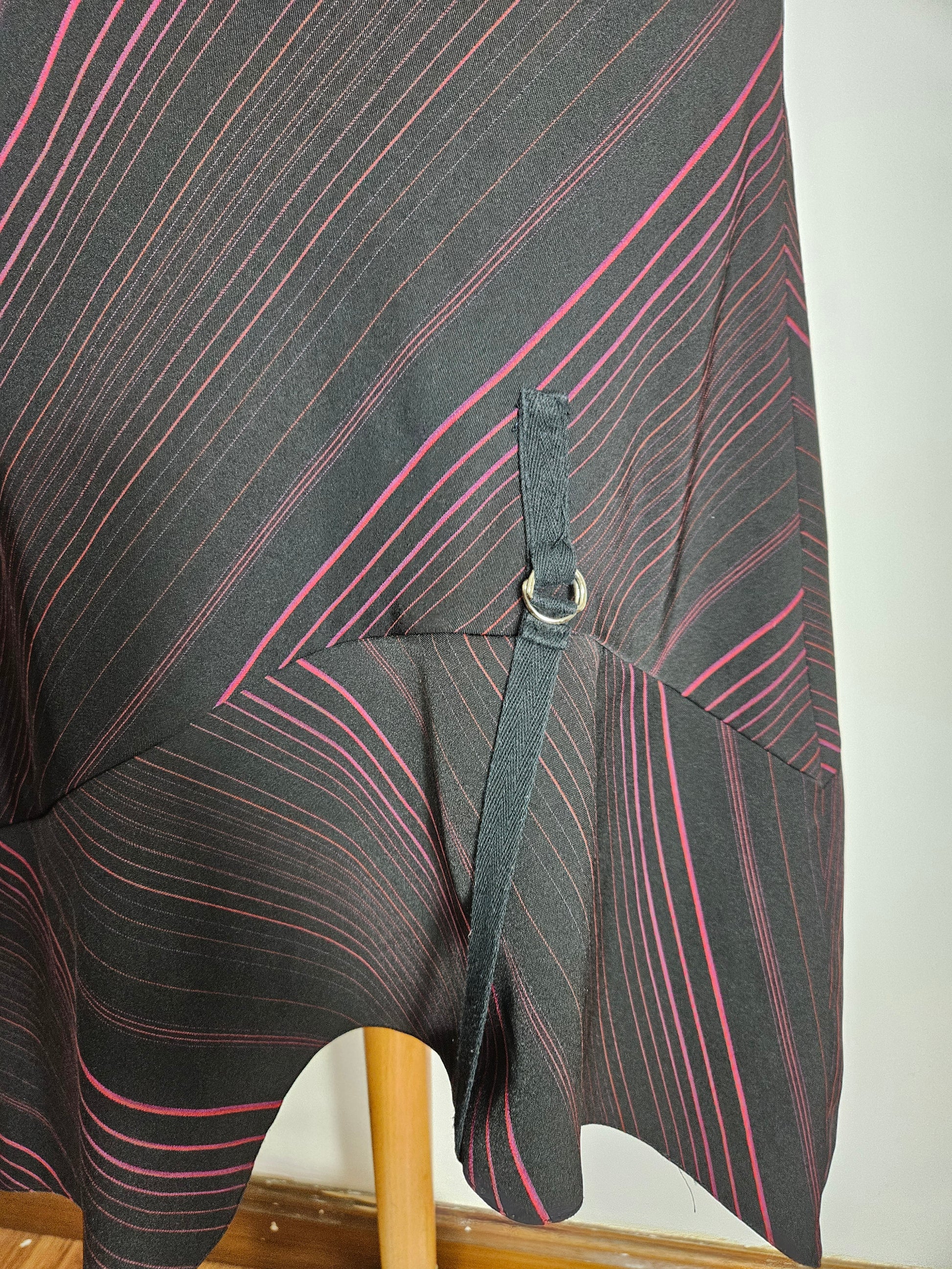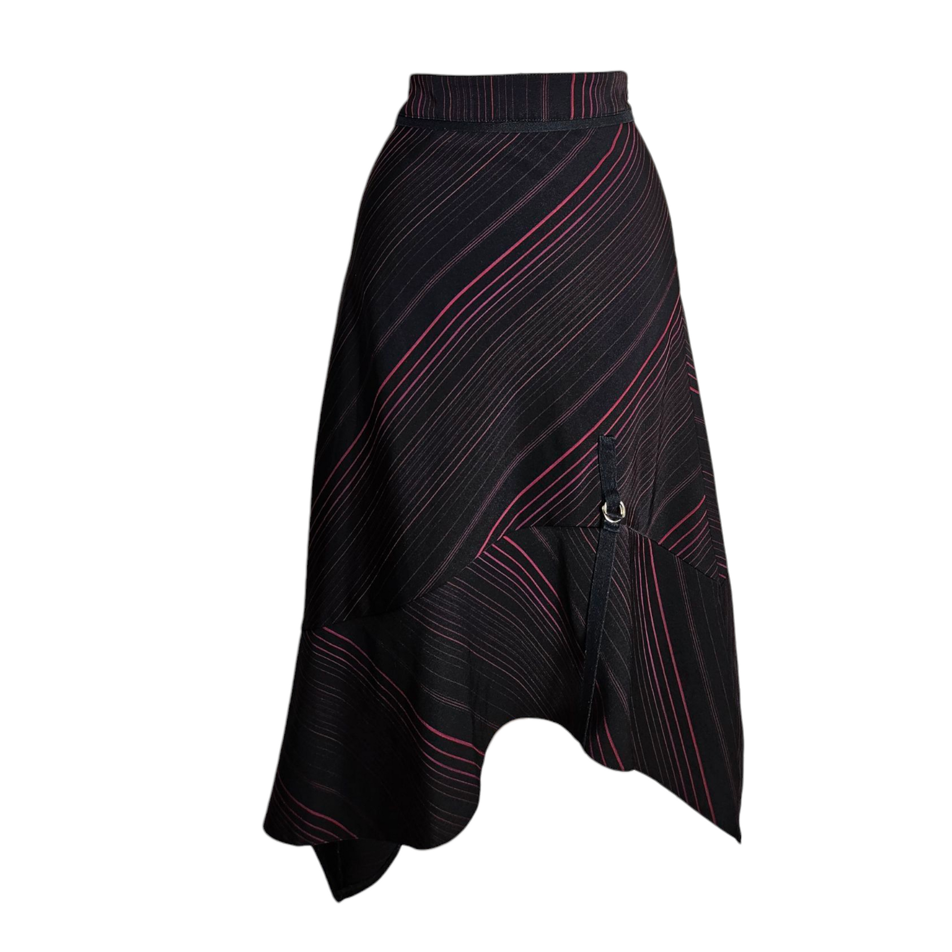 - Jupe asymétrique noire avec rayures rouges et violettes.