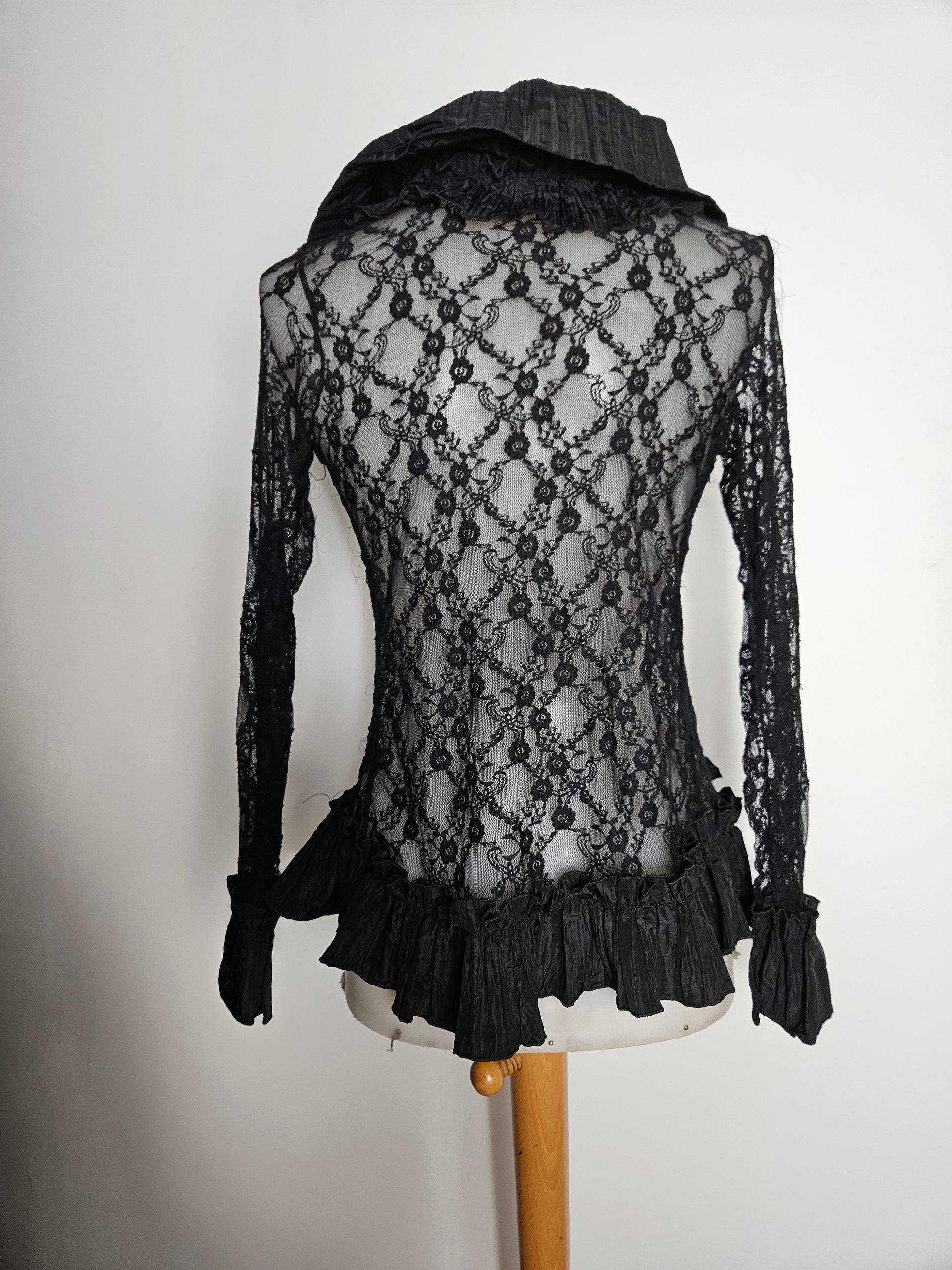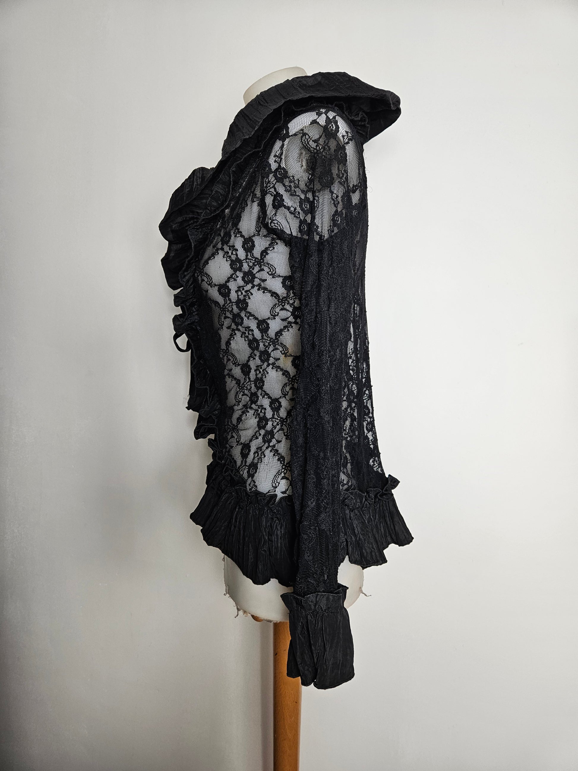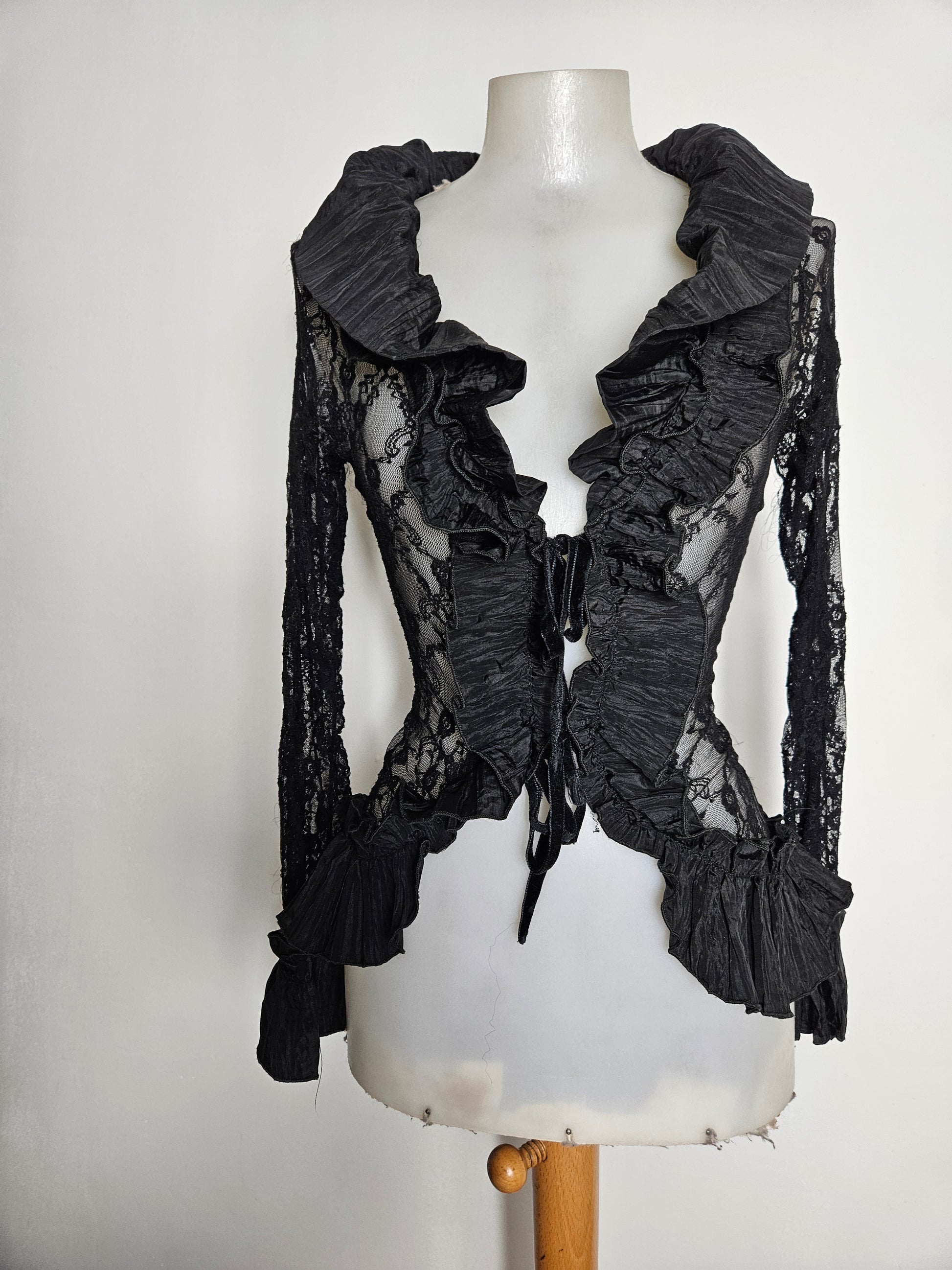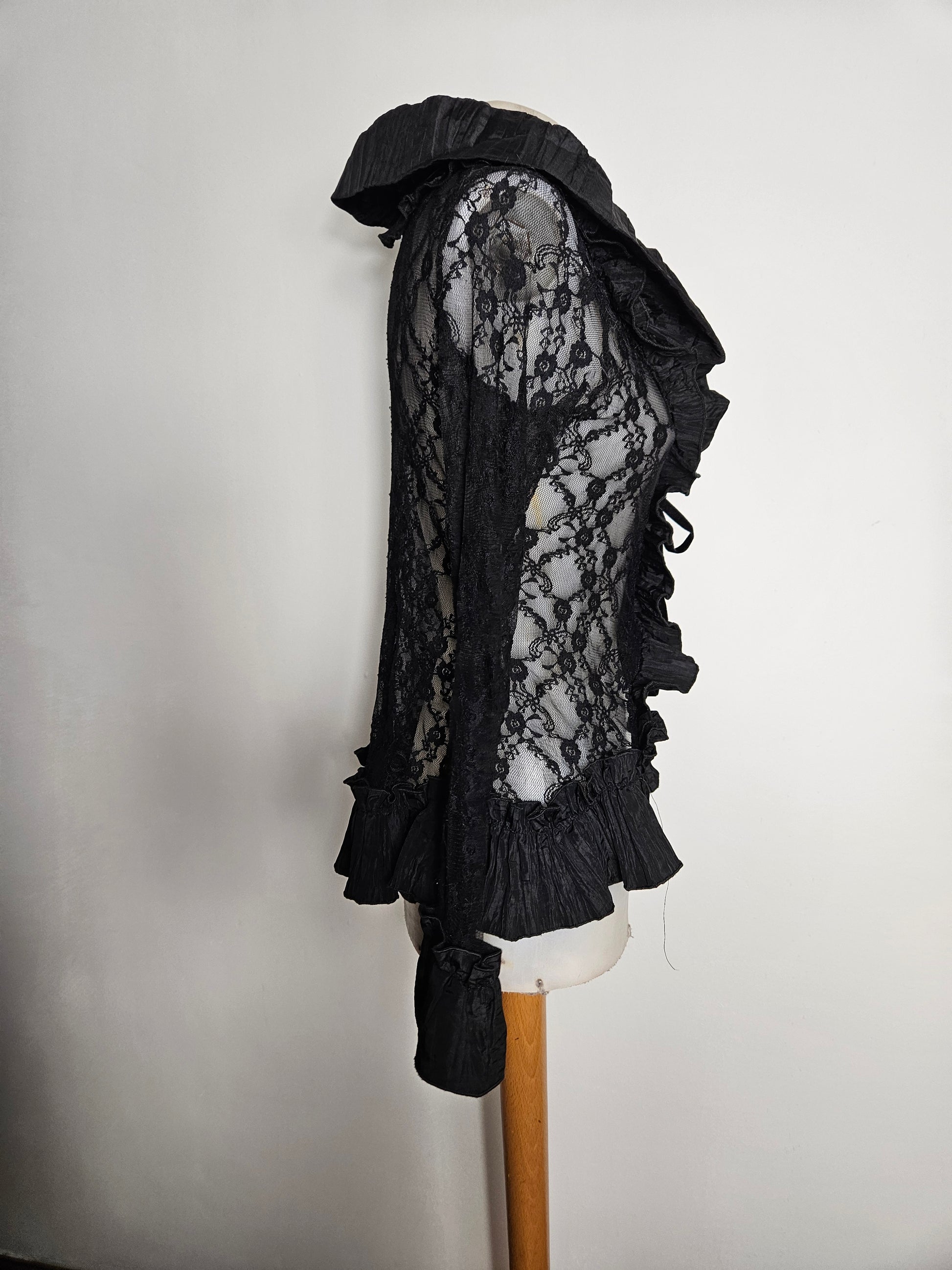 Chemisier noir à manches longues en dentelle transparente. Le modèle présente un col large avec volants structurés et une ouverture sur le devant avec lien à nouer. Des empiècements plissés décorent le col, le buste et les poignets. Les manches sont entièrement en dentelle florale. Coupe ajustée à la taille avec bas légèrement asymétrique. Fermeture par laçage à l'avant.