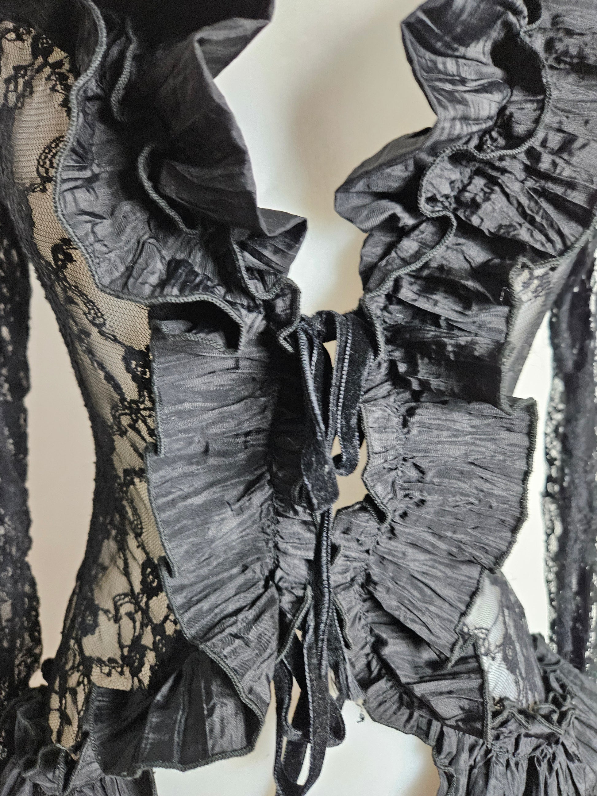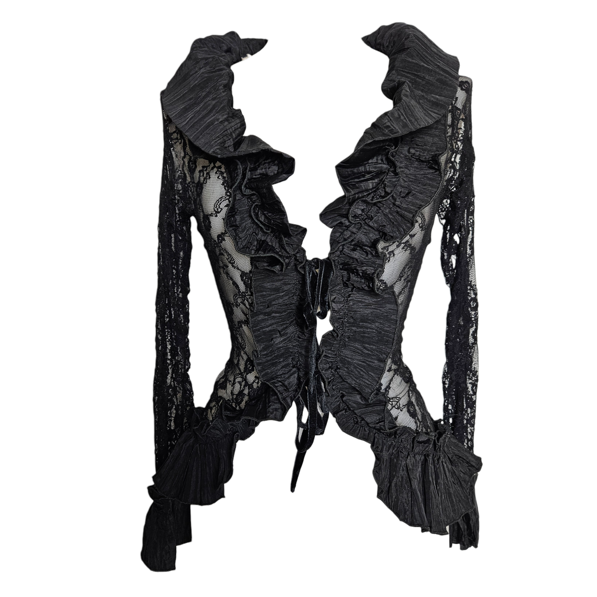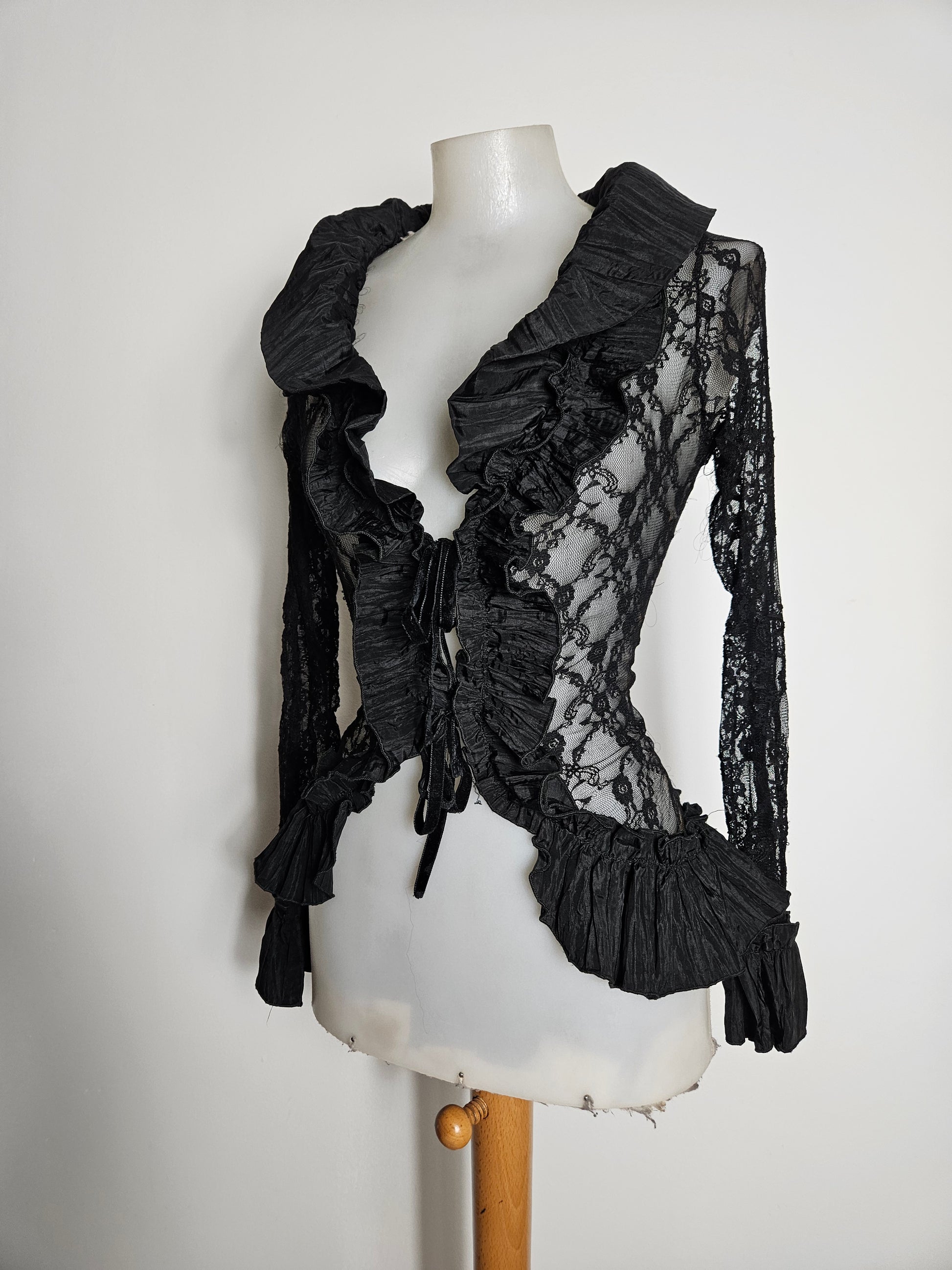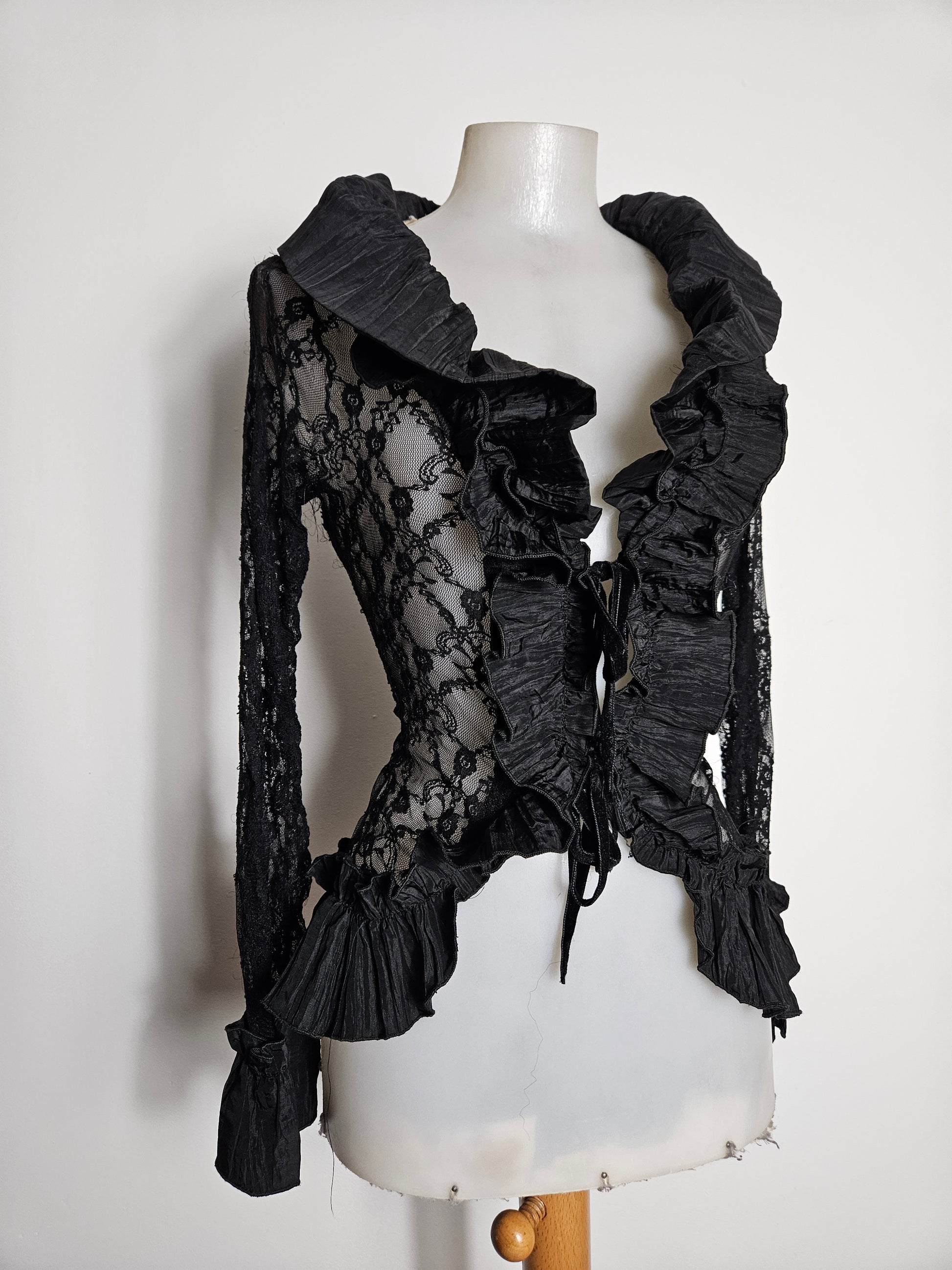 Chemisier noir à manches longues en dentelle transparente. Le modèle présente un col large avec volants structurés et une ouverture sur le devant avec lien à nouer. Des empiècements plissés décorent le col, le buste et les poignets. Les manches sont entièrement en dentelle florale. Coupe ajustée à la taille avec bas légèrement asymétrique. Fermeture par laçage à l'avant.