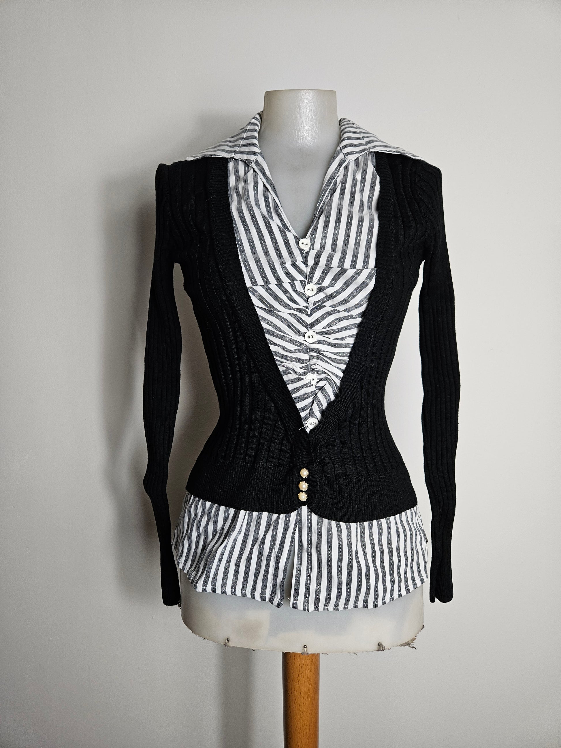 Haut deux-en-un composé d’une chemise blanche à rayures grises intégrée à un cardigan noir. La chemise présente un col classique et une patte de boutonnage à l’avant avec effet légèrement froncé au centre. Le cardigan est en maille côtelée noire avec une coupe cintrée et des manches longues.