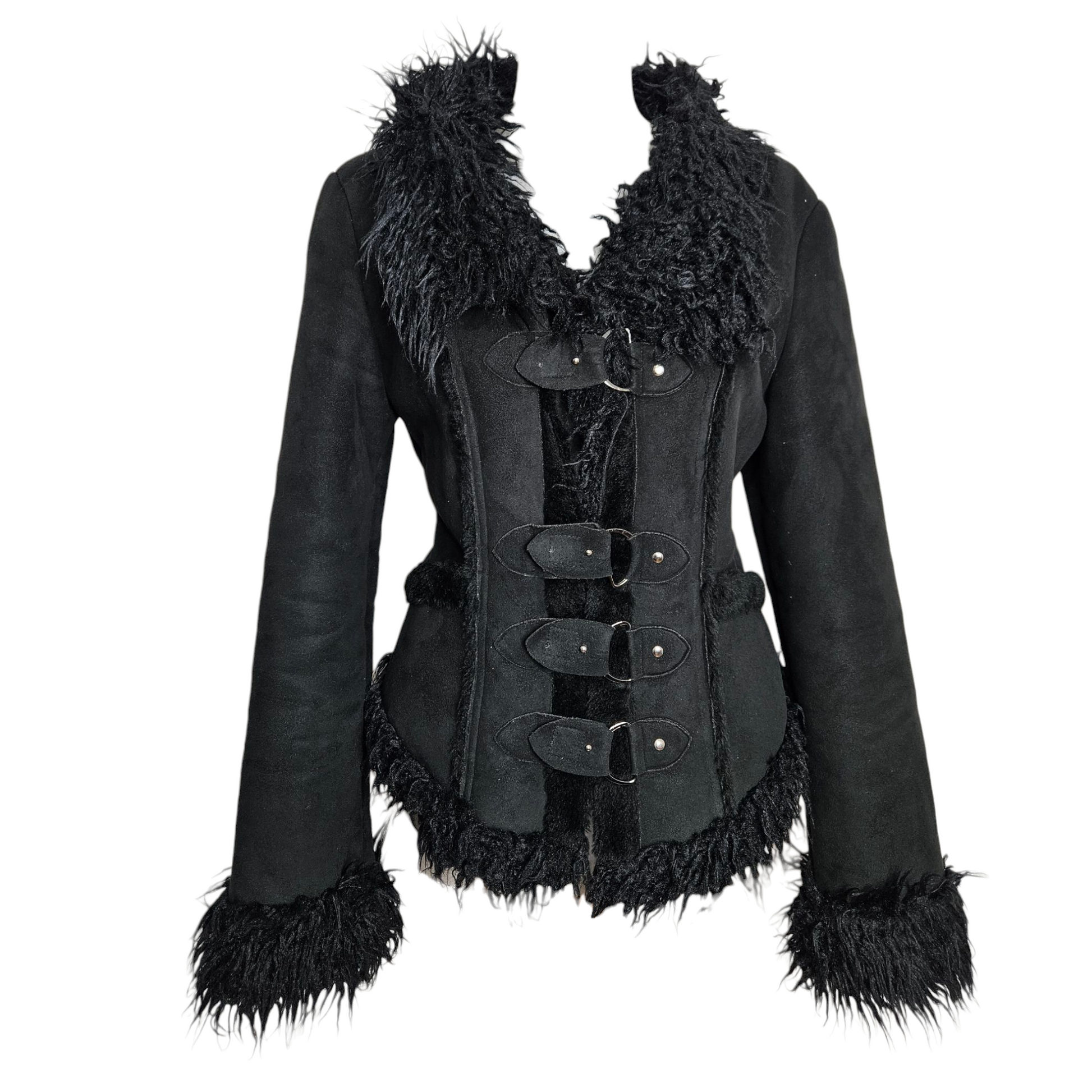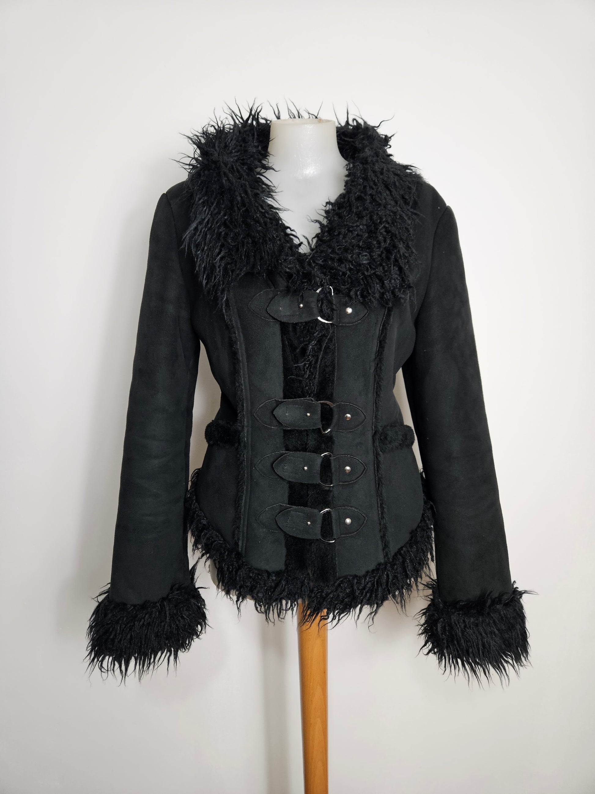 - Manteau court noir à fausse fourrure et boucles métalliques