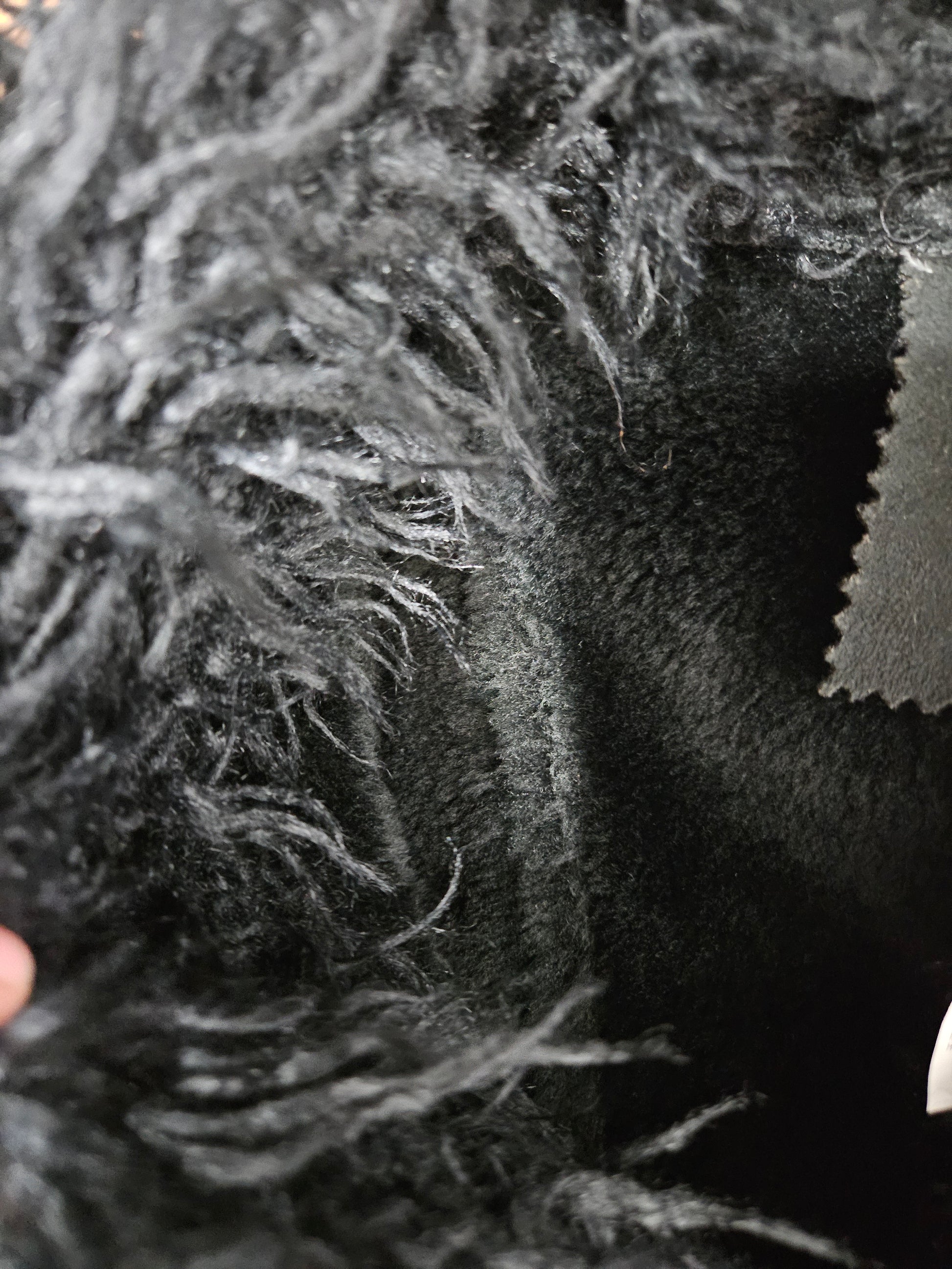 - Fausse fourrure noire effet duveteux au col, poignets et ourlet