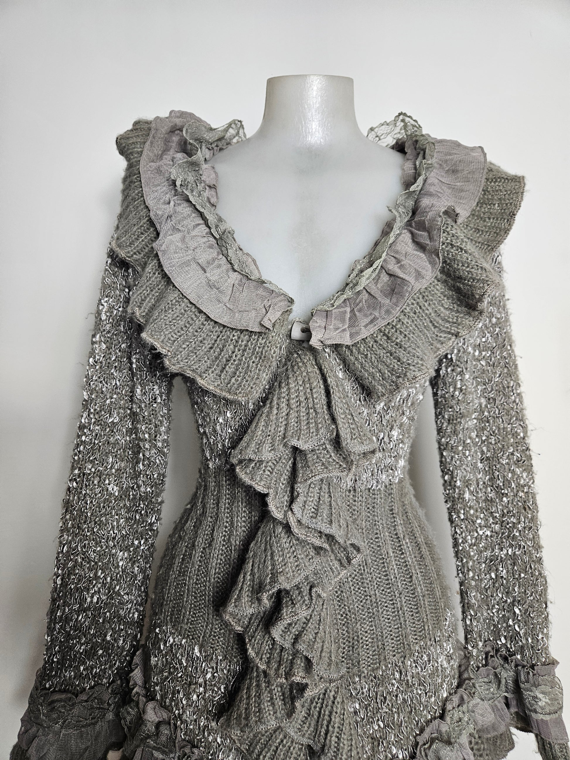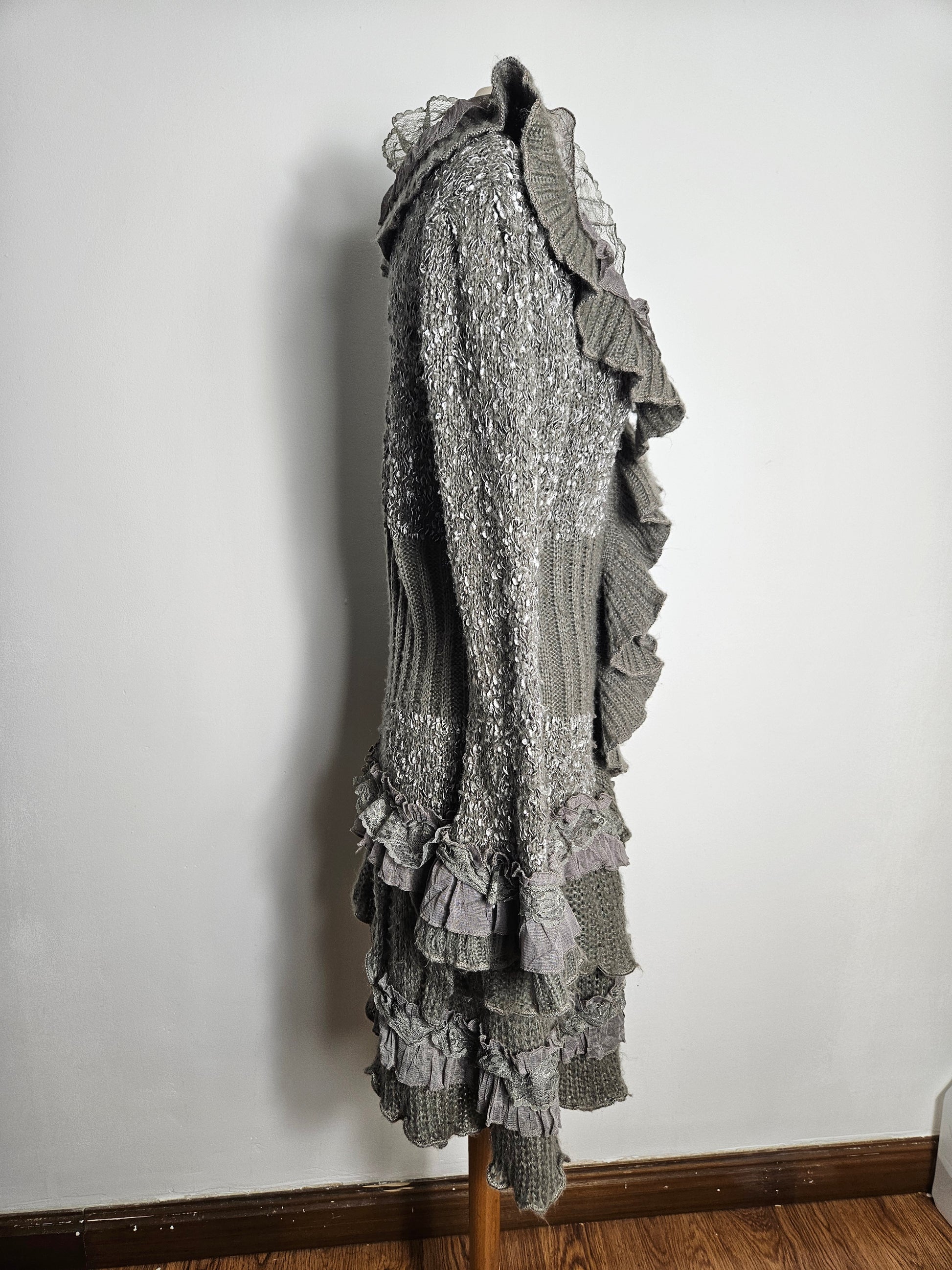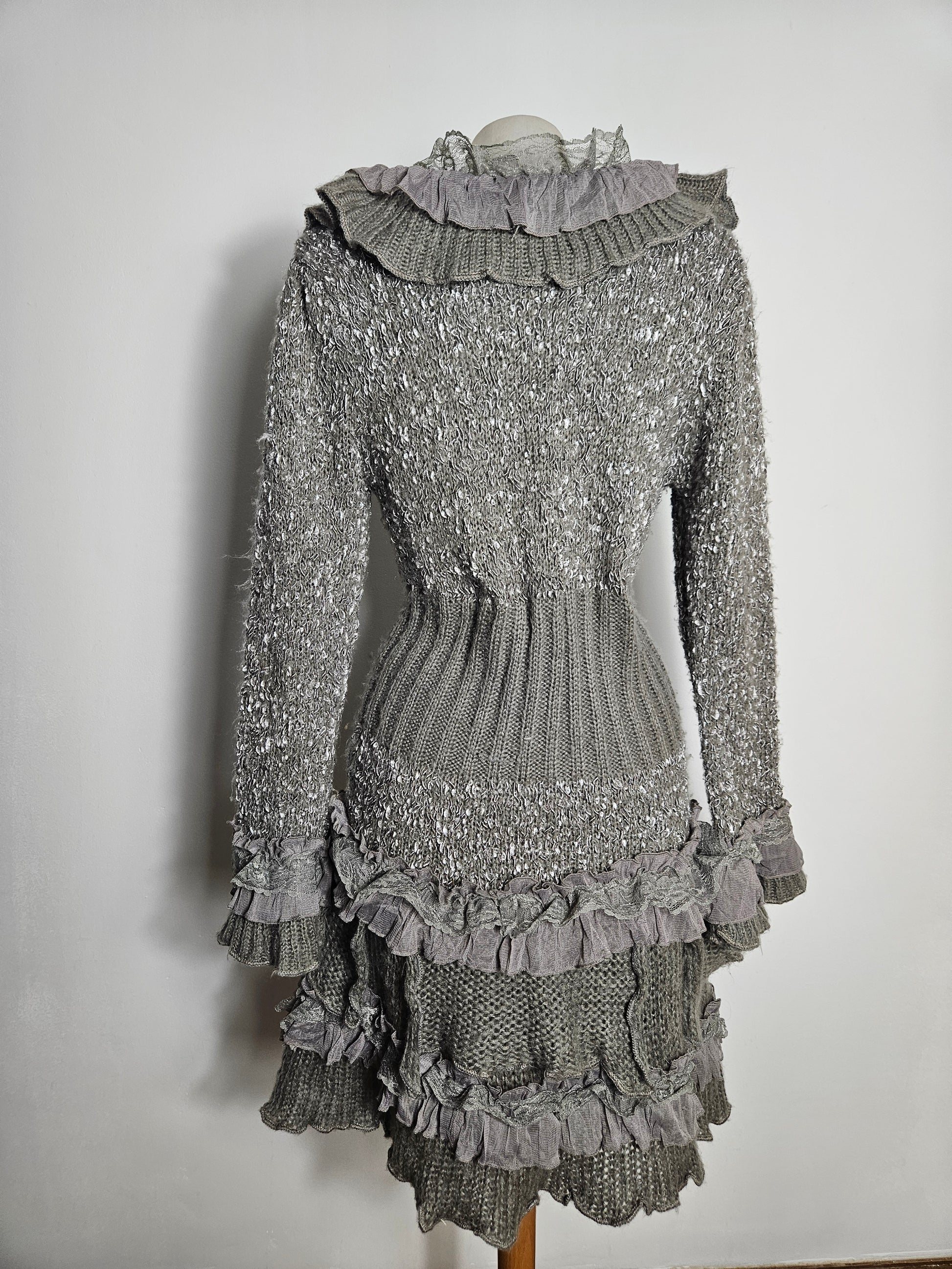 - Mélange de textures (maille bouclée, liserés brillants, et volants en tissu)