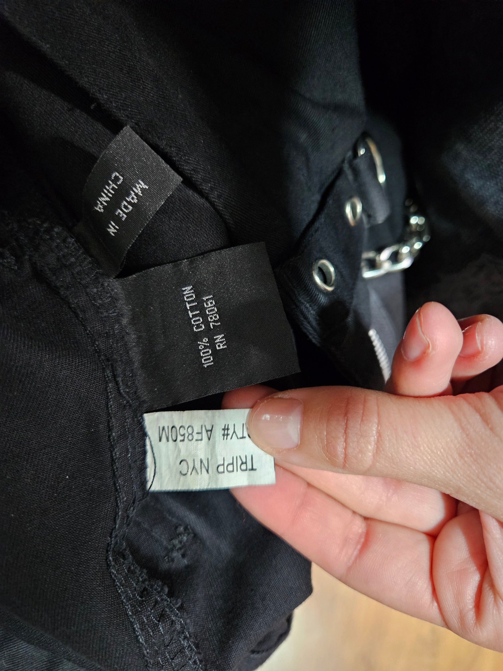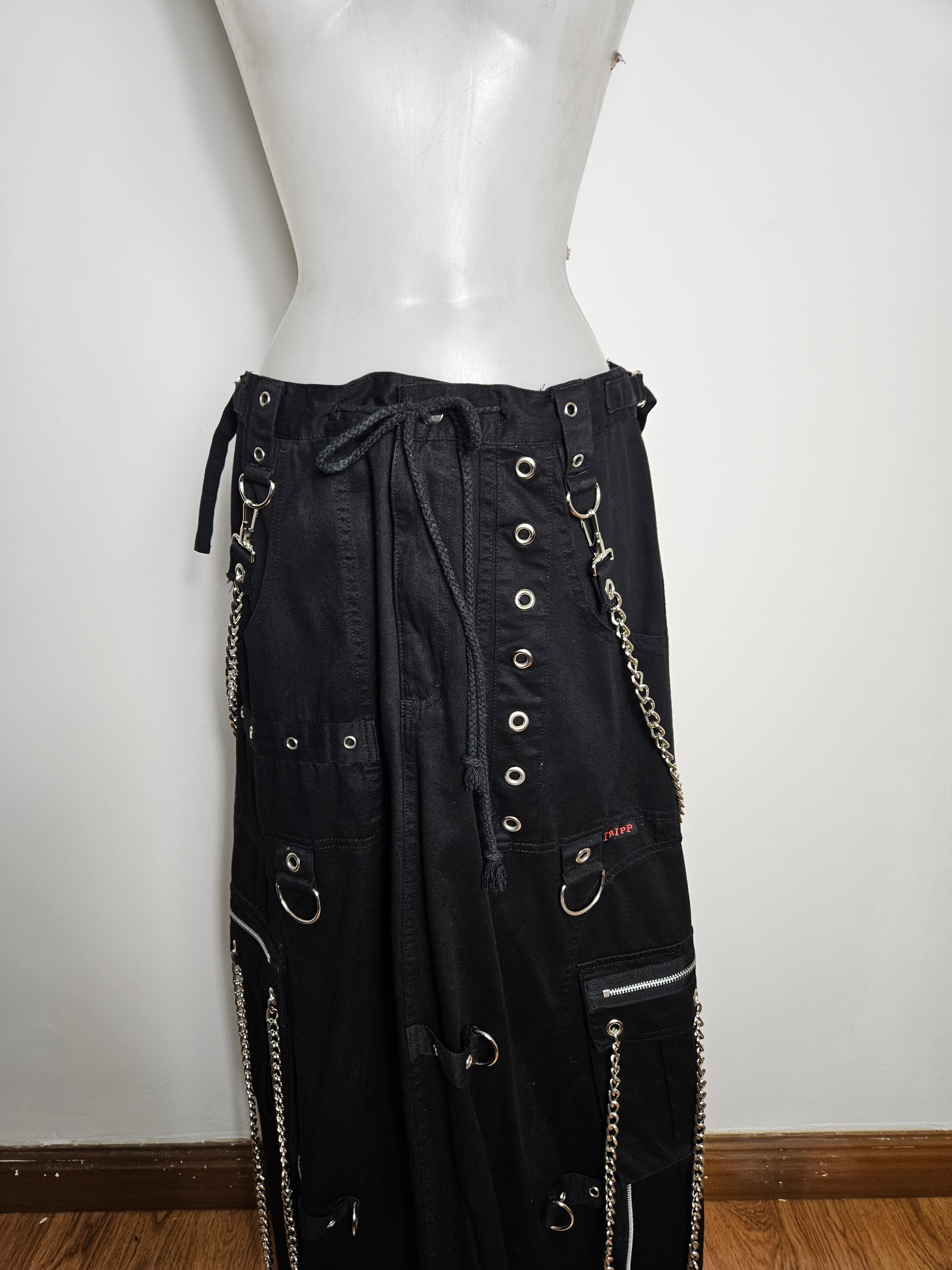 - Jupe cargo noire à chaînes et fermetures argentées de la marque Tripp NYC à l’esthétique cyber-goth et industrielle