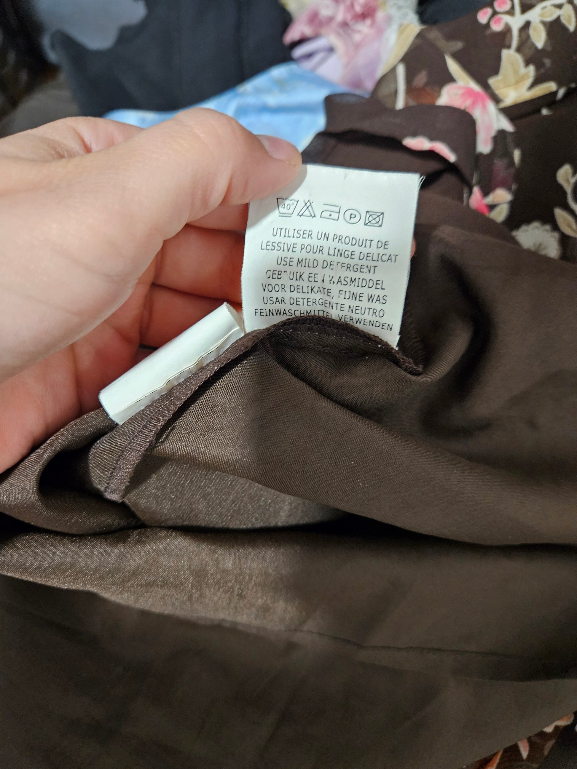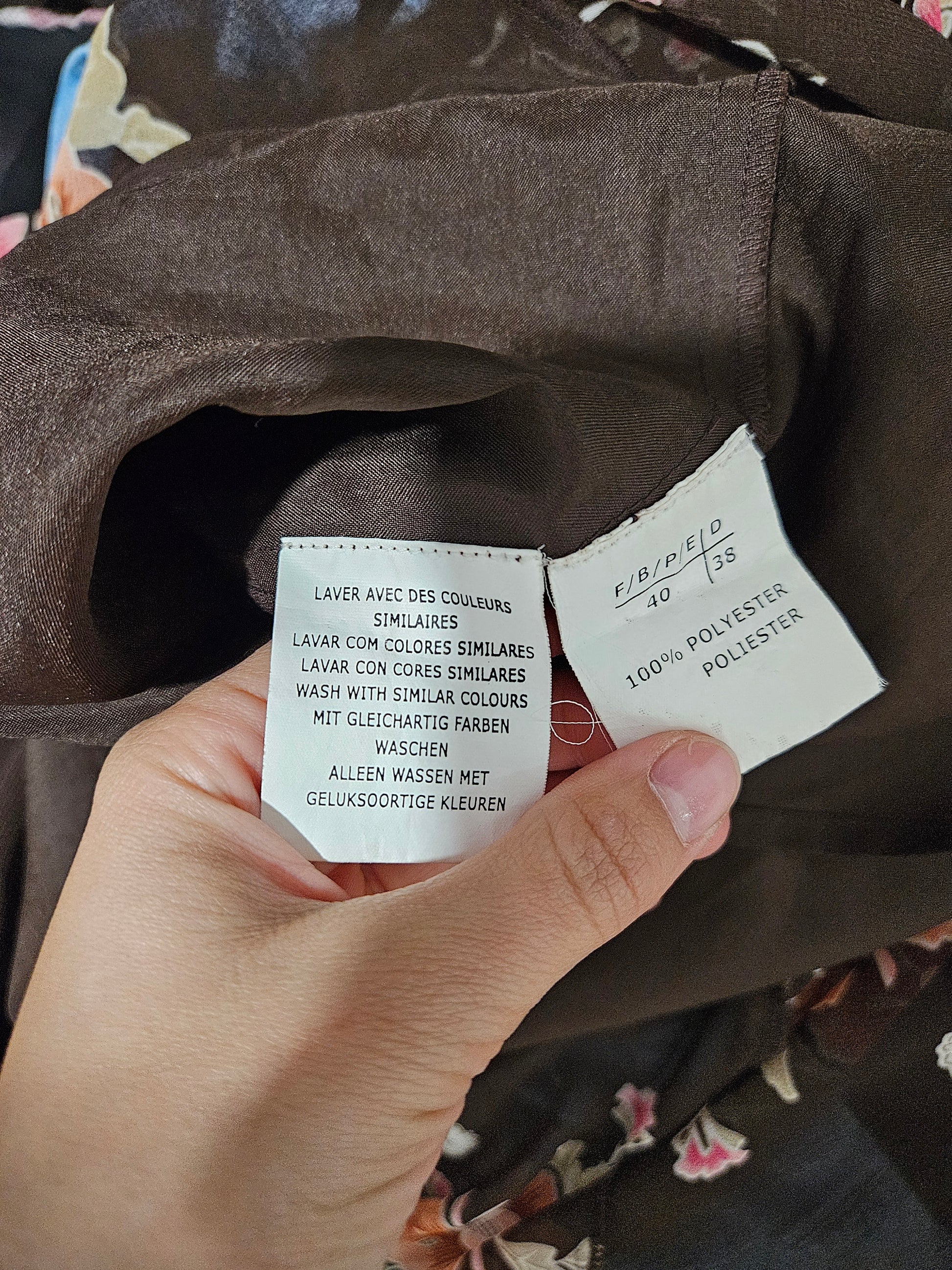 - Fond marron avec imprimé fleuri multicolore (rose, orange, beige)