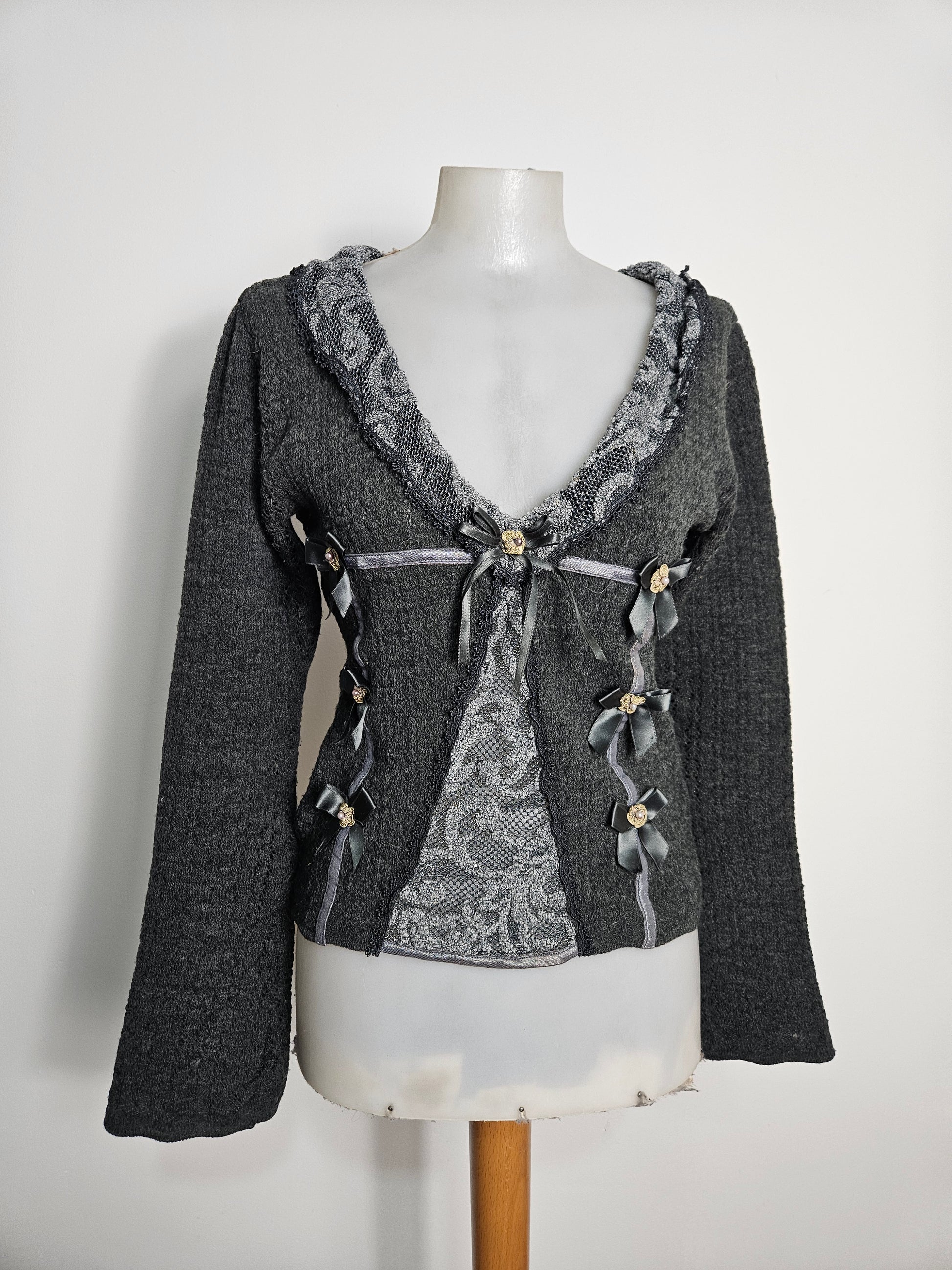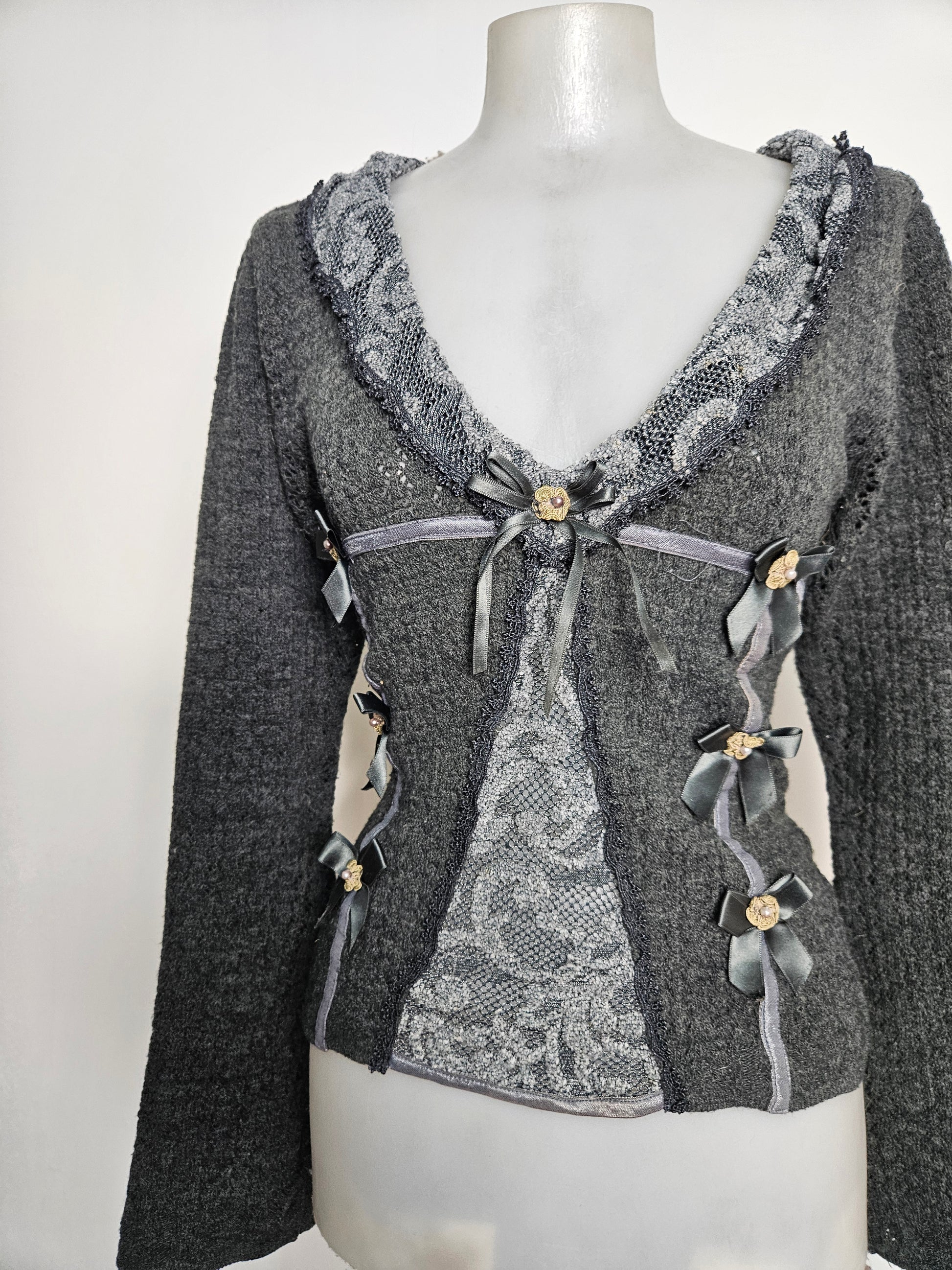 - Rubans satinés sur les côtés et à l’encolure, décorés de petites fleurs