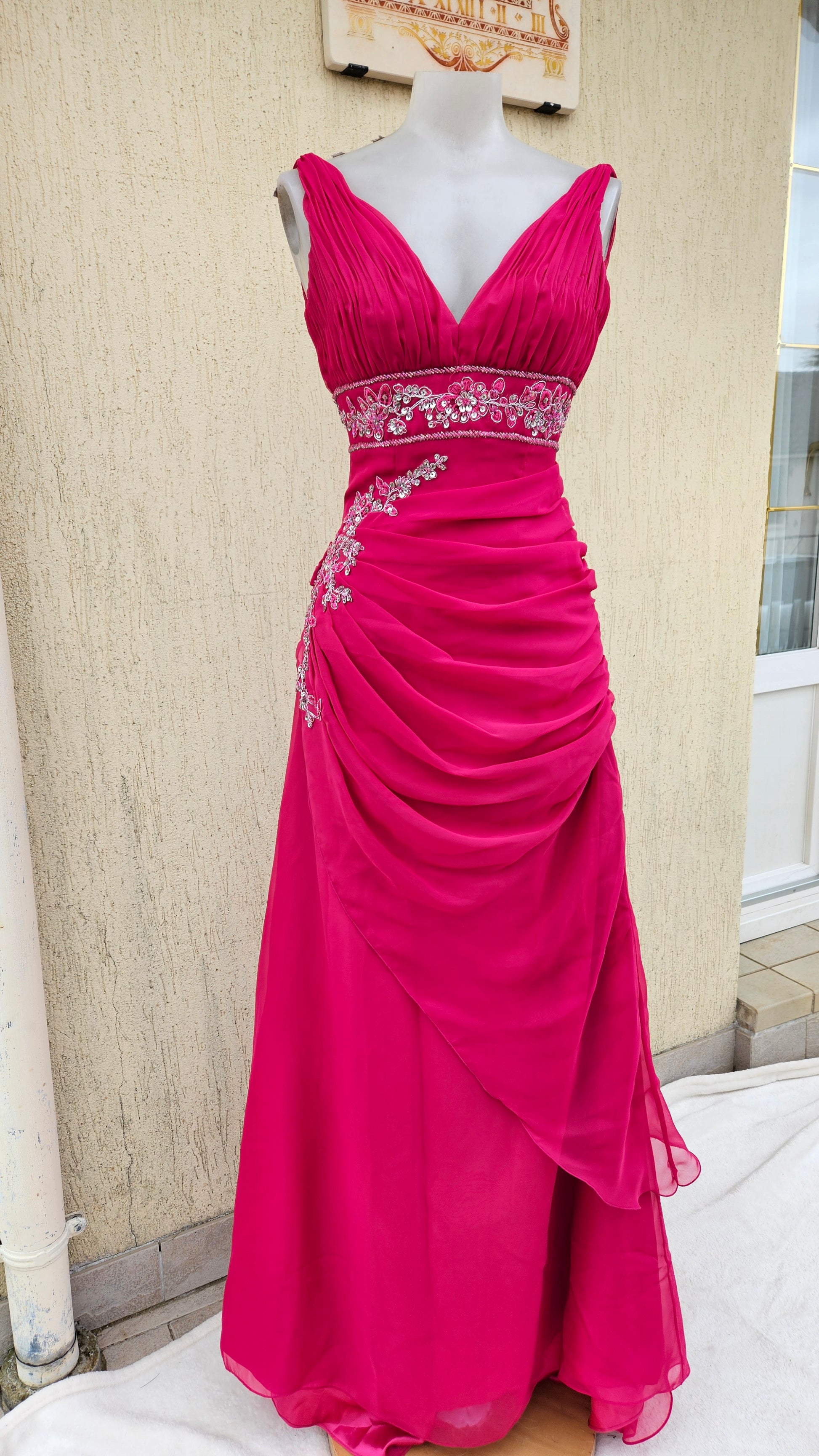 Robe longue vintage de couleur rose A larges bretelles et décolleté profond en V. Le buste est structuré par des plis verticaux et une bande sous la poitrine ornée de broderies et perles ton blanc et argent. La jupe est fluide, avec un drapé asymétrique sur le devant et des applications brodées sur un côté. Un voile également brodé est attaché sur l'autre hanche. Matière stretch.