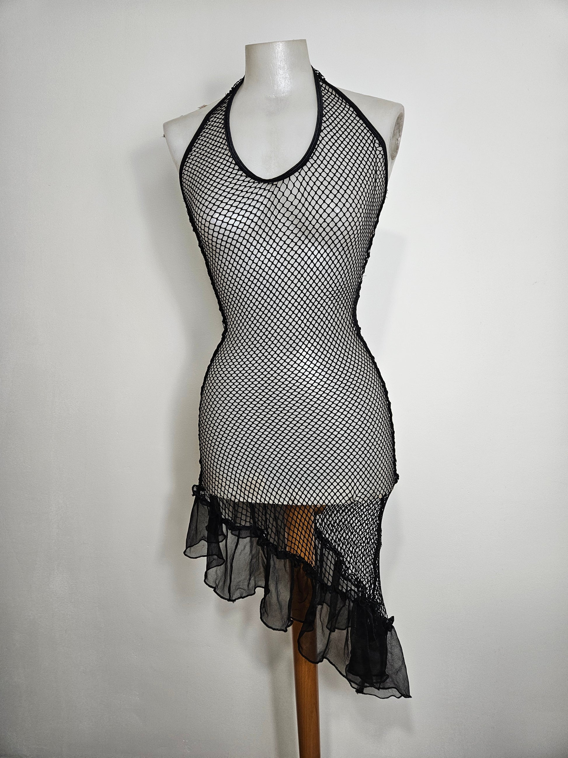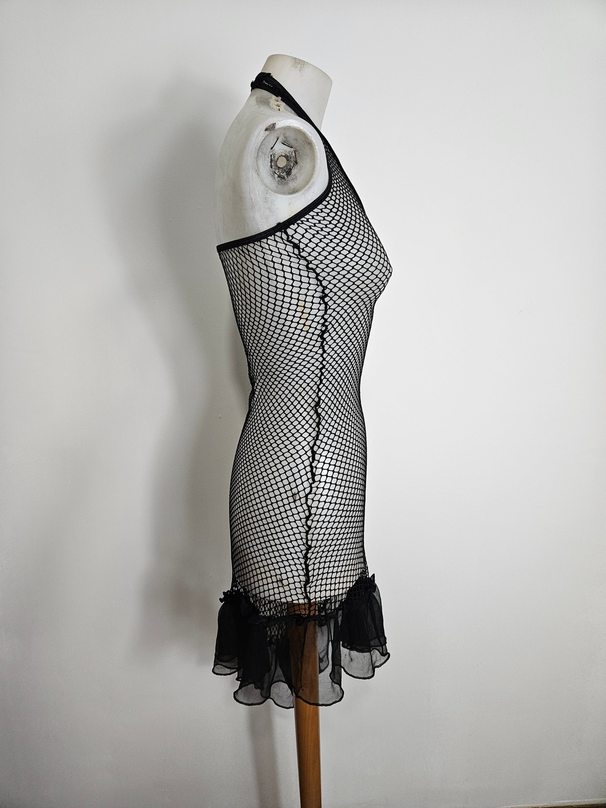 - Robe noire asymétrique en résille à larges mailles, totalement transparente.