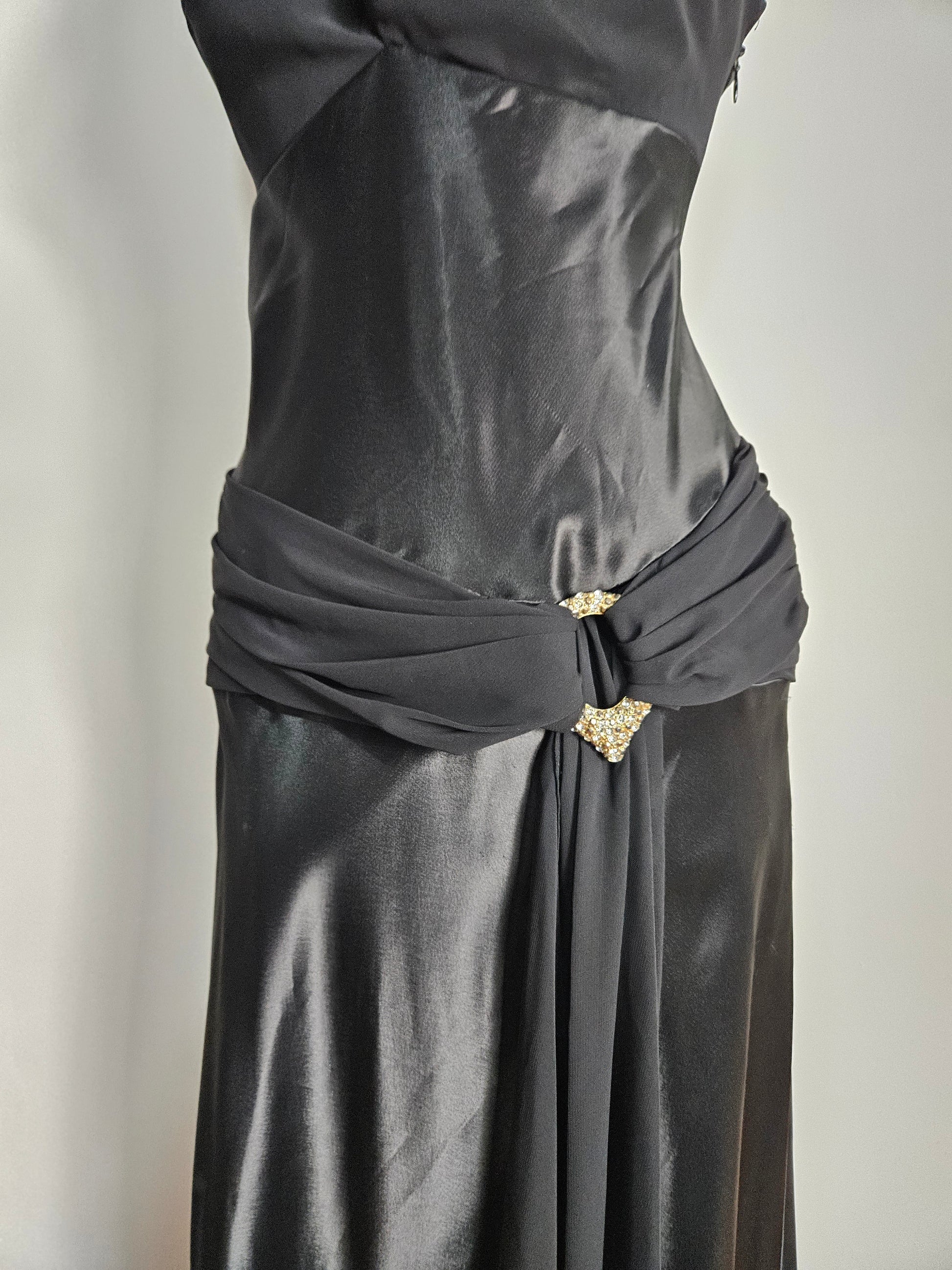 Robe longue noire à col halter. Coupe ajustée au buste avec décolleté en V. Taille marquée par un drapé croisé sur le devant, orné de petits éléments décoratifs. Jupe longue fluide avec effet satiné. Dos nu avec lien à nouer au cou. Fermeture par zip au dos.