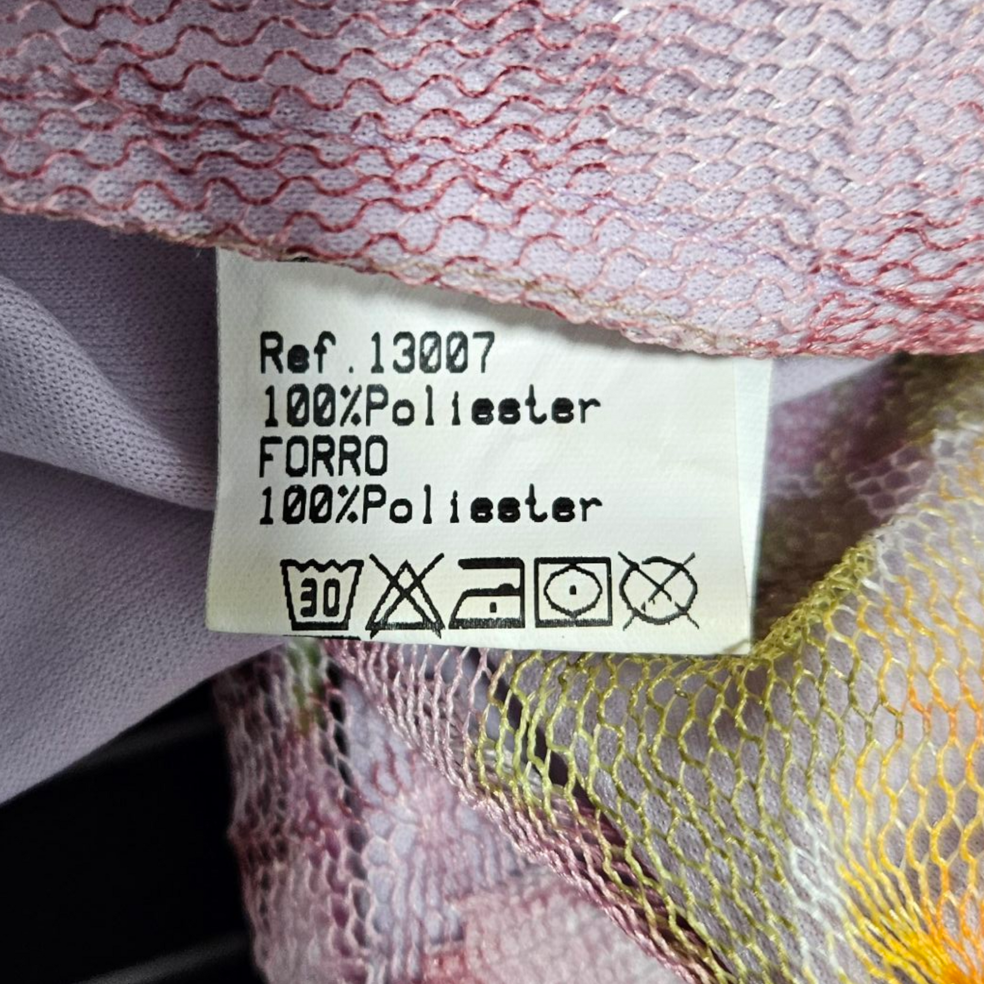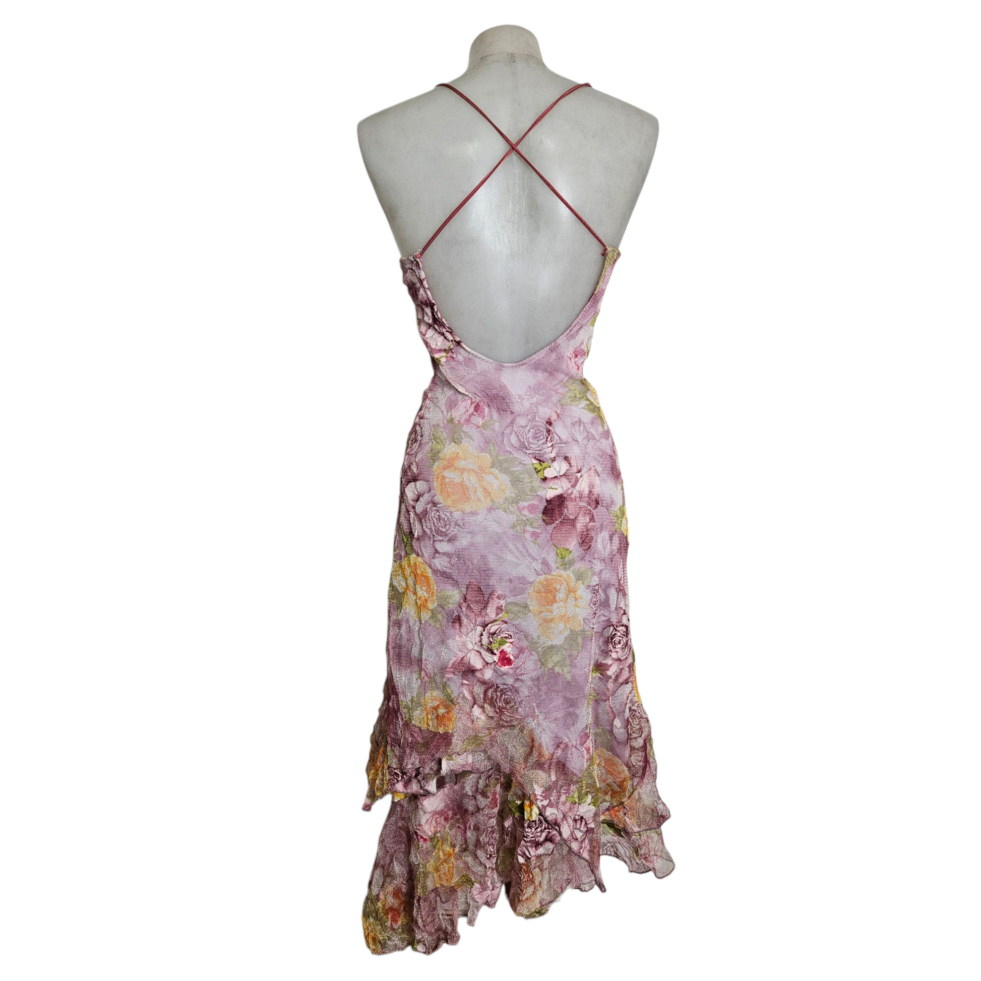 - Robe longue dos nu en dentelle dans les tons rose, orange et vert à motifs floraux