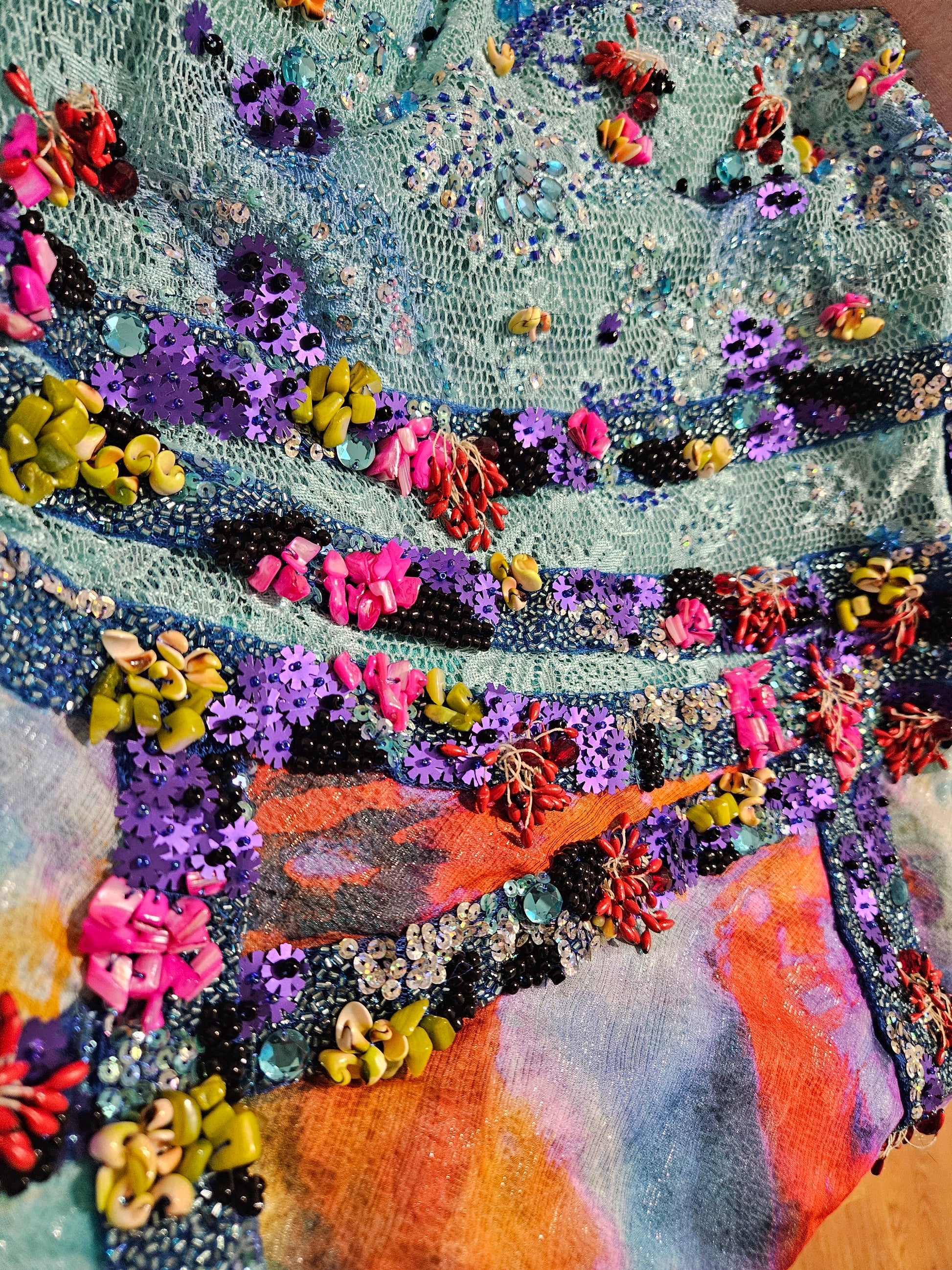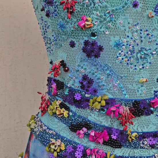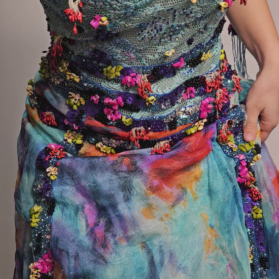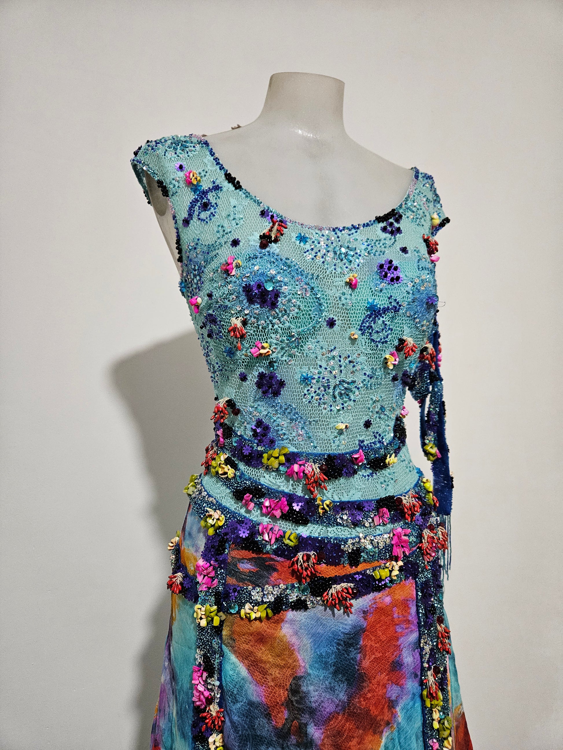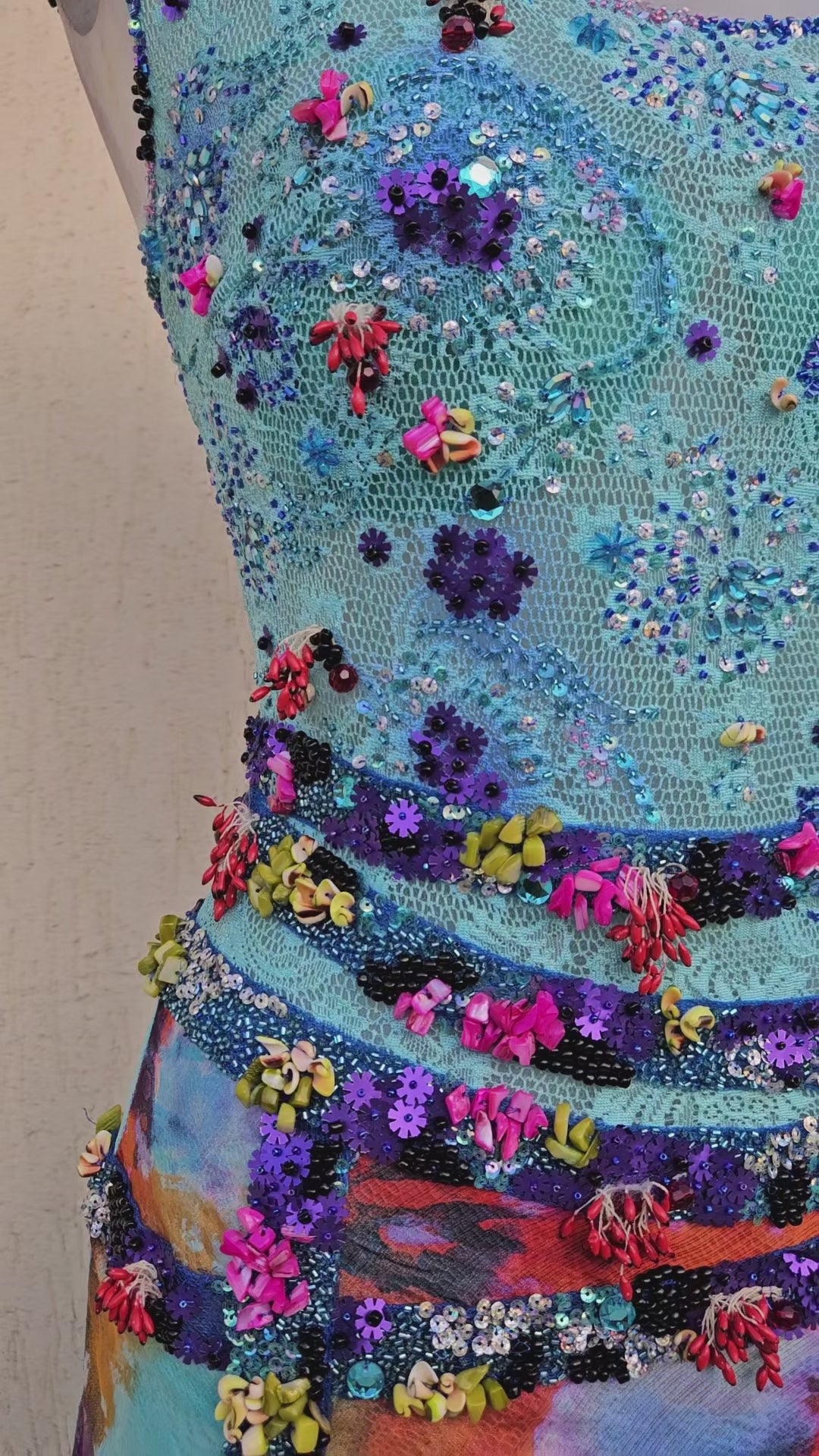 Robe longue multicolore dominante turquoise, avec encolure arrondie et larges bretelles. Haut entièrement décoré de perles, sequins et broderies en relief avec motifs floraux. Le tout est brodé sur une base en résille. Le haut possède des renforts au niveau de la poitrine pour pouvoir être porté sans rien.