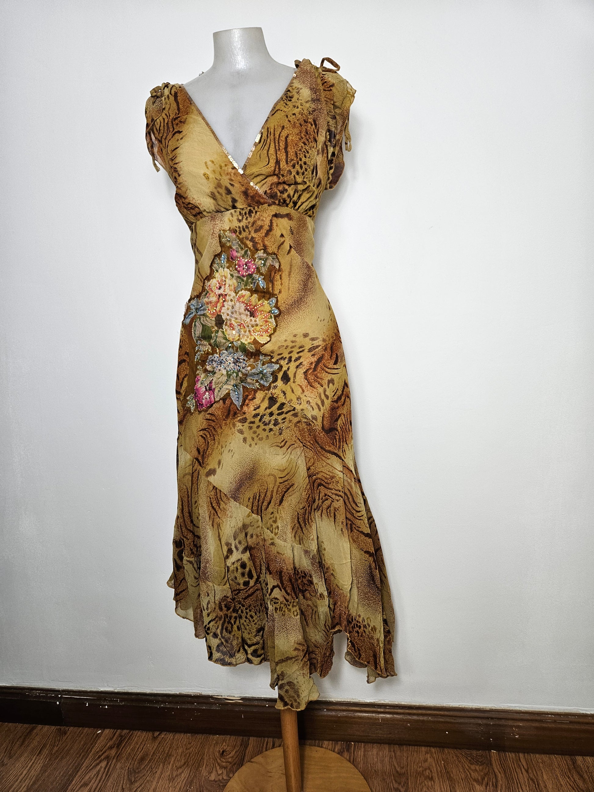 - Robe longue fluide à imprimé animal et floral.