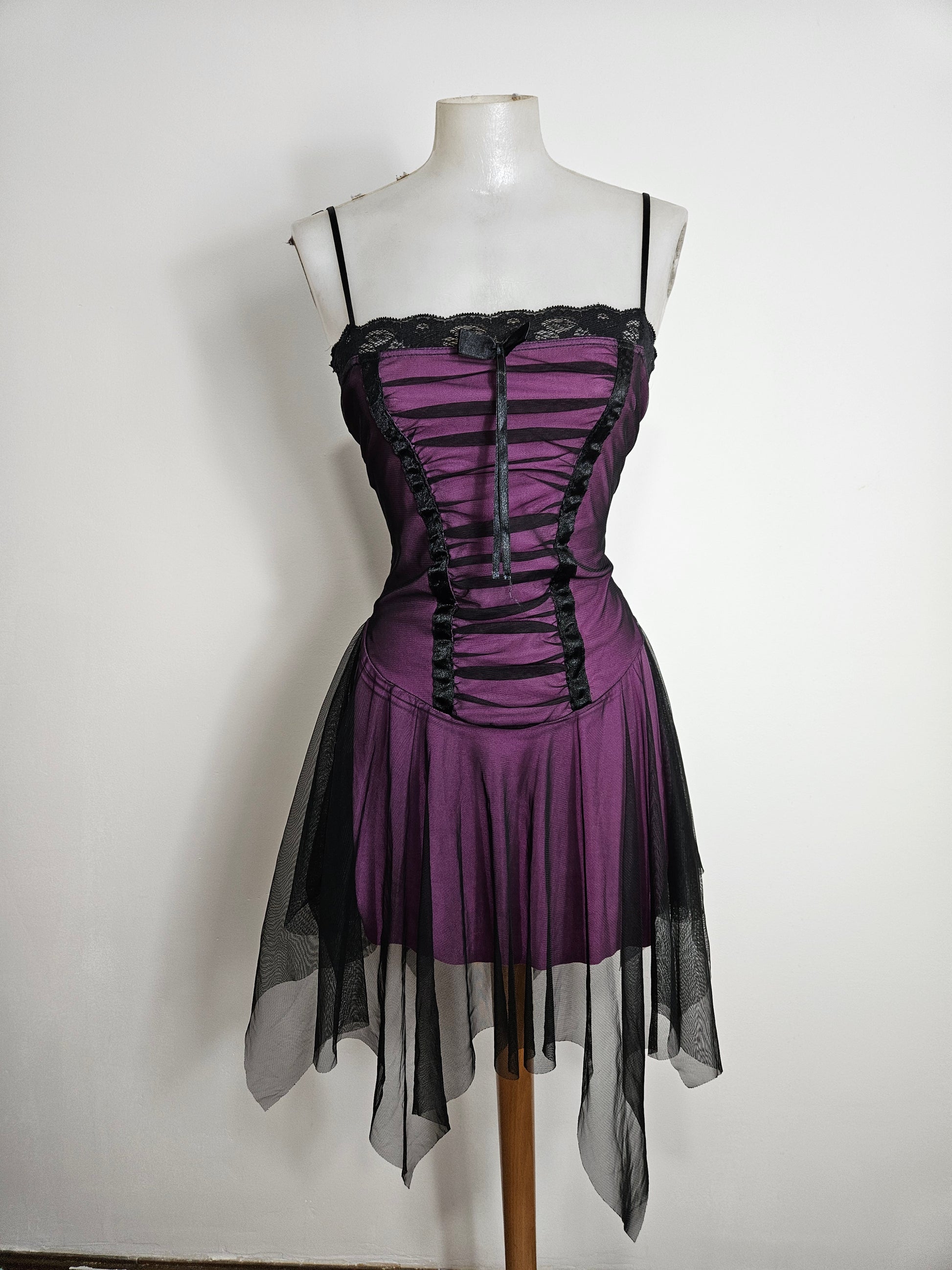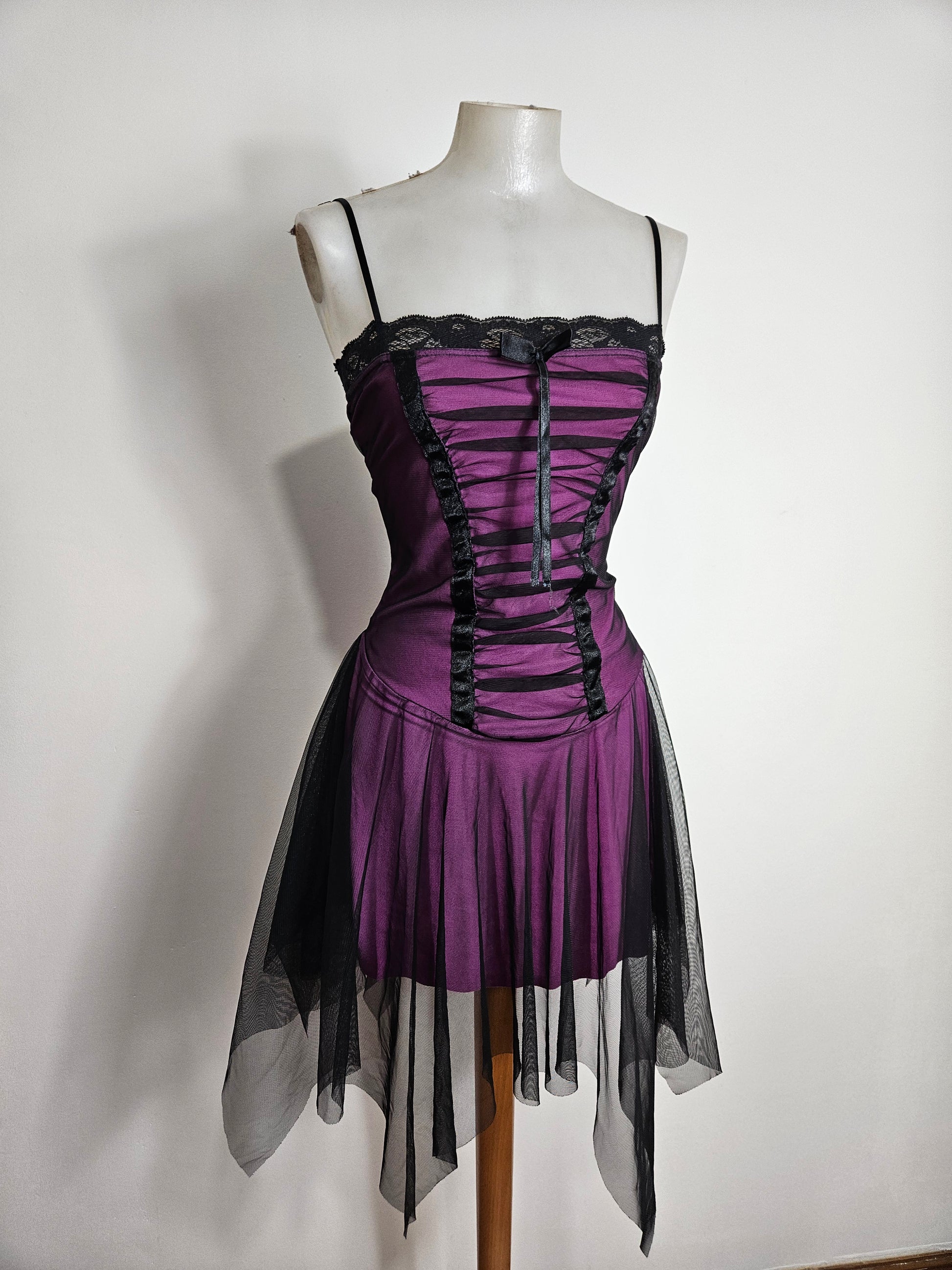 - Jupe fluide asymétrique avec superposition de tulle noir transparent.