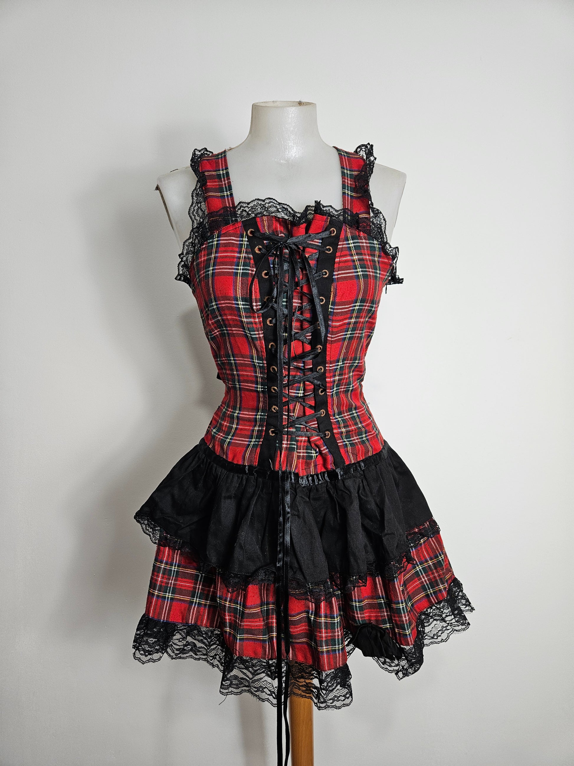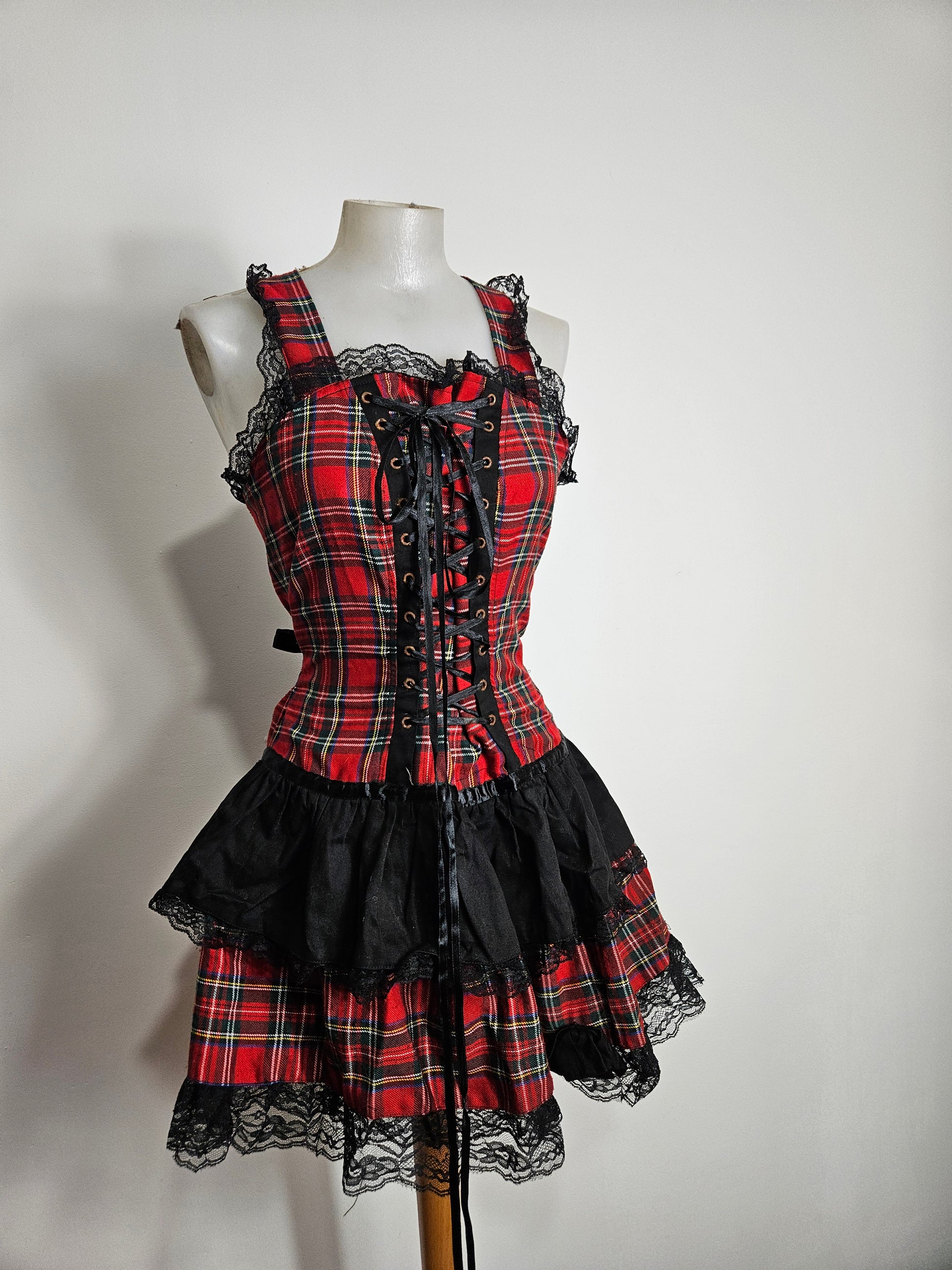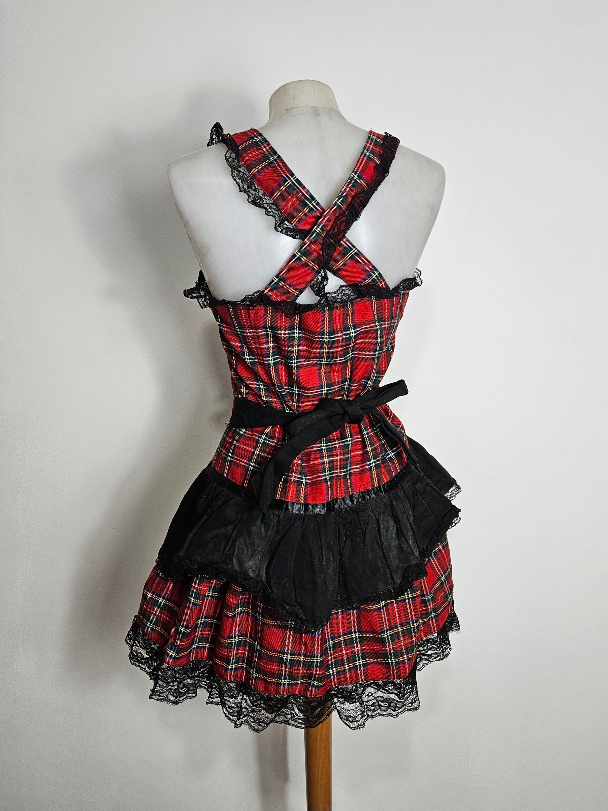 - Robe à bretelles croisées, motif tartan rouge et noir avec dentelle noire.