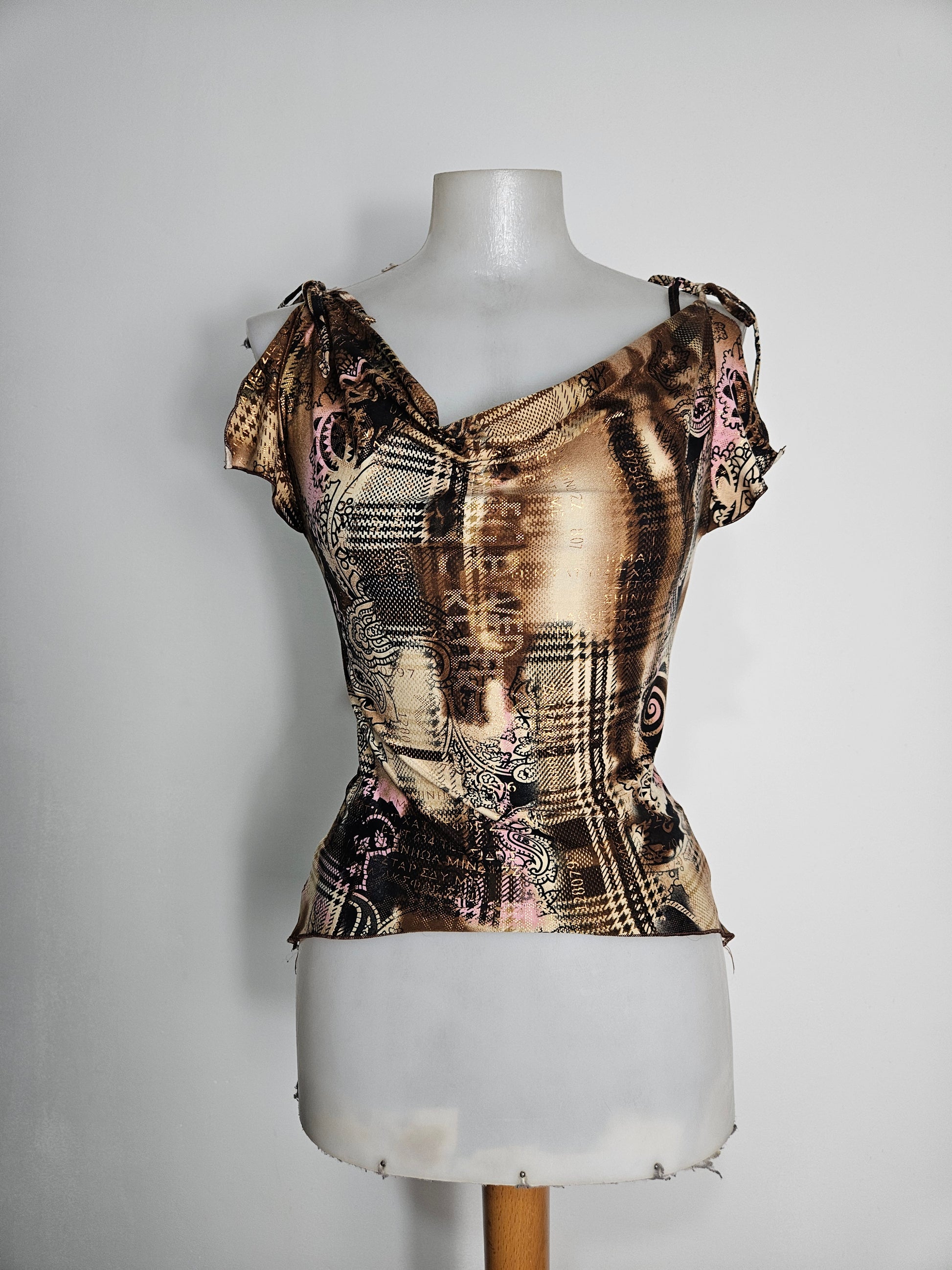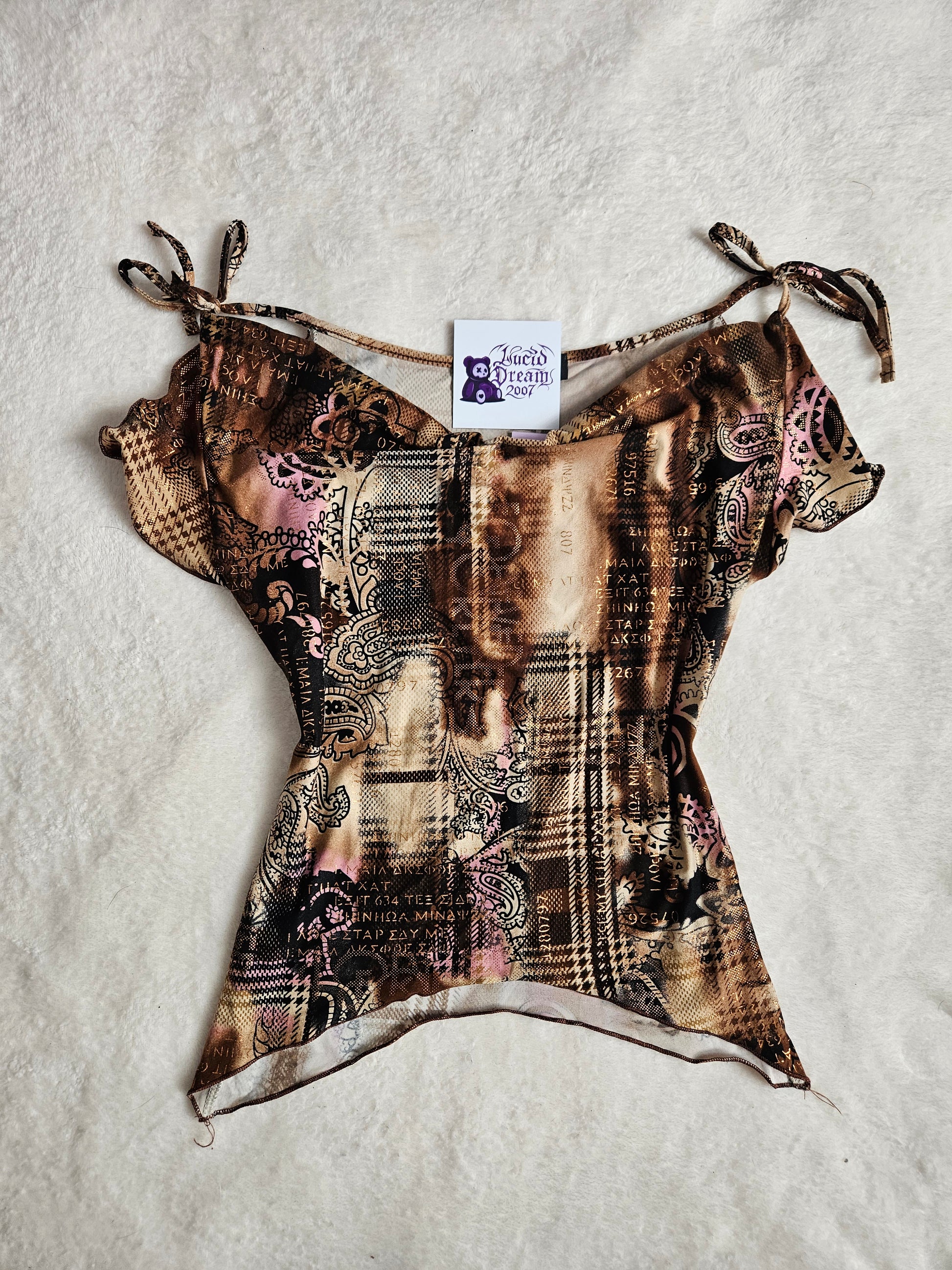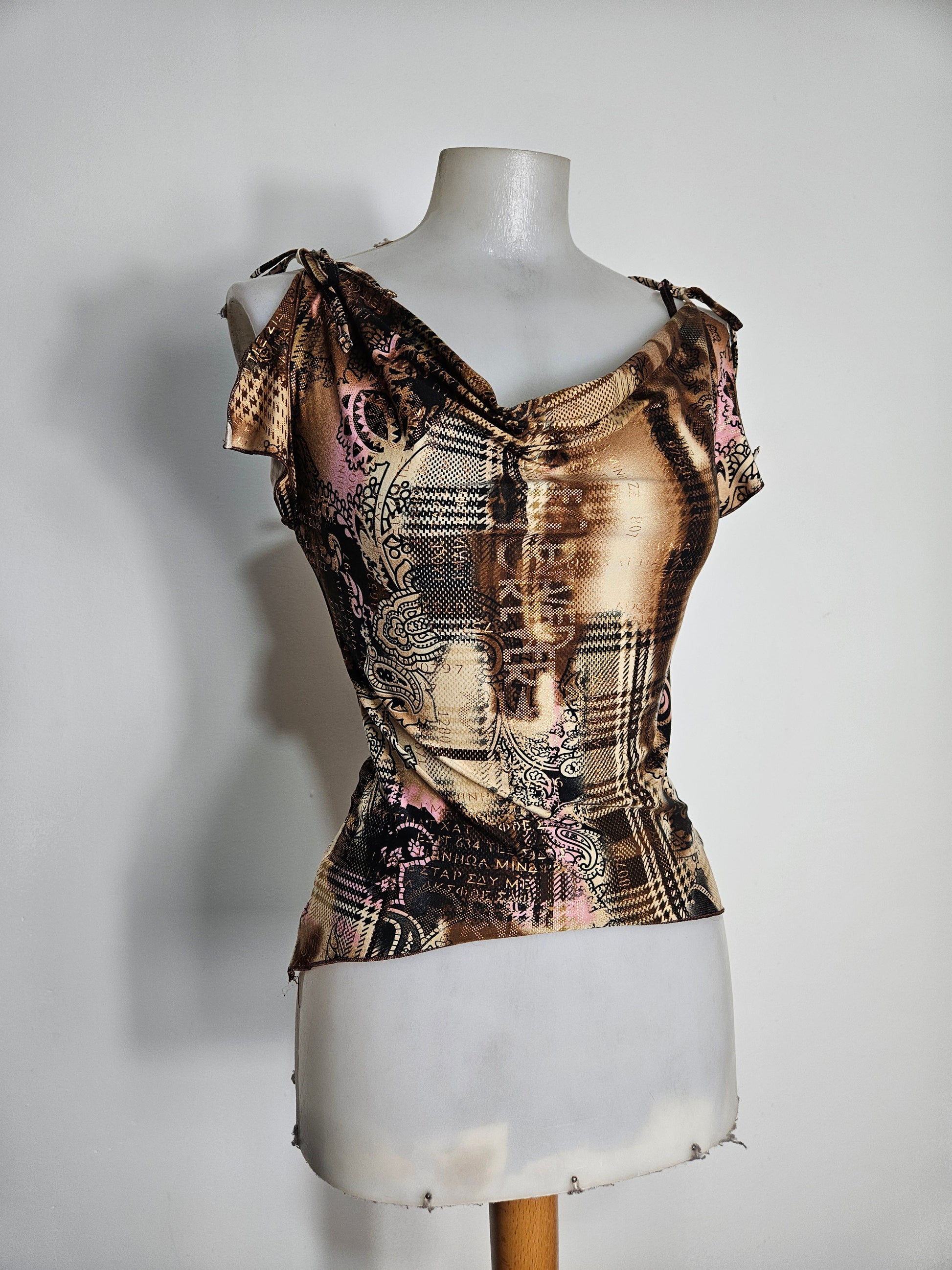 Top à manches courtes avec encolure dégagée. Coupe ajustée. Tissu extensible. Imprimé all-over dans des tons marron, beige, noir et rose, avec motifs abstraits et effets de superposition. Avec des brtelles réglablent qui se nouent et des manches courtes fendues qui forments des voalnts. Finition bord franc au bas.