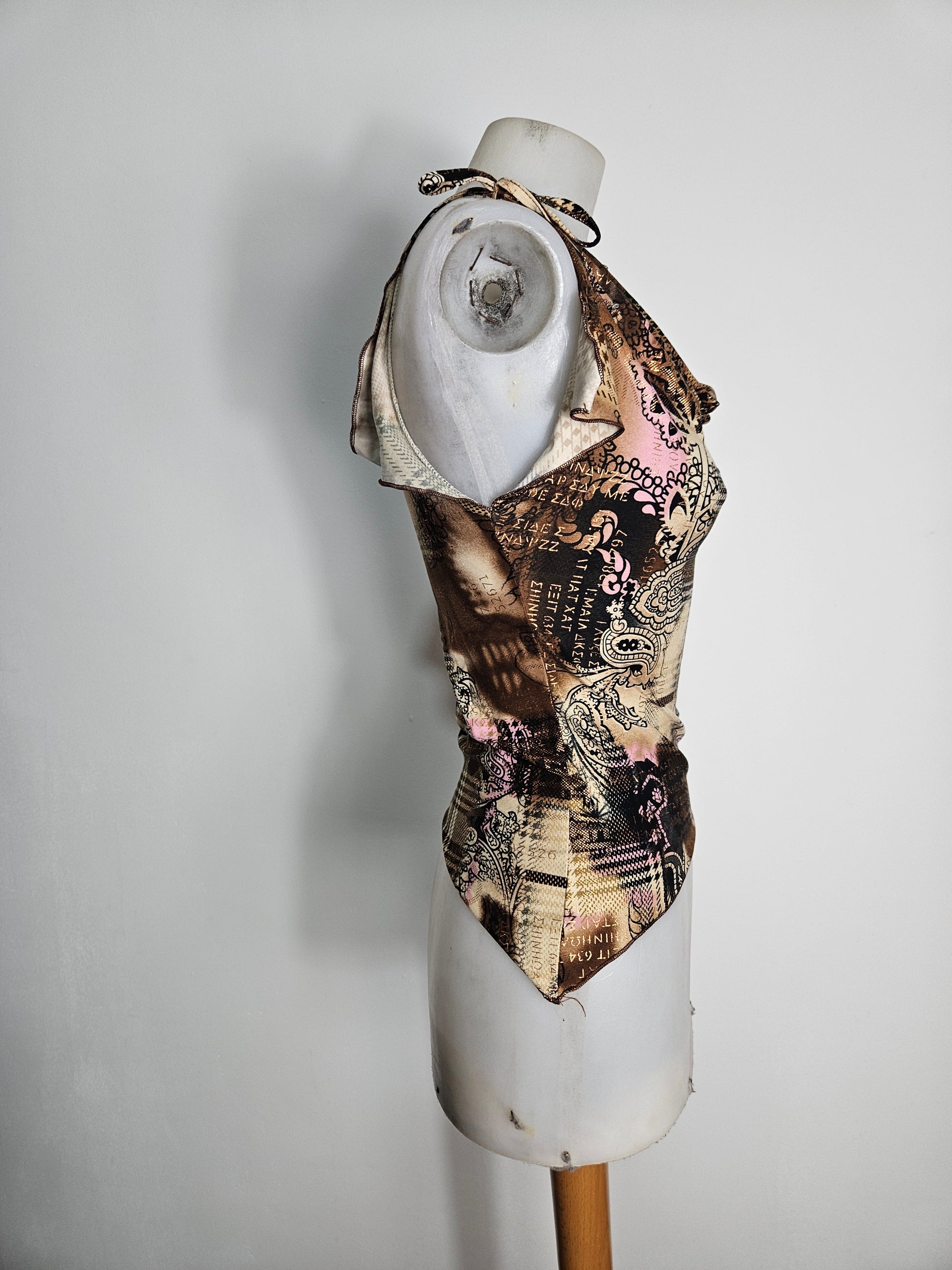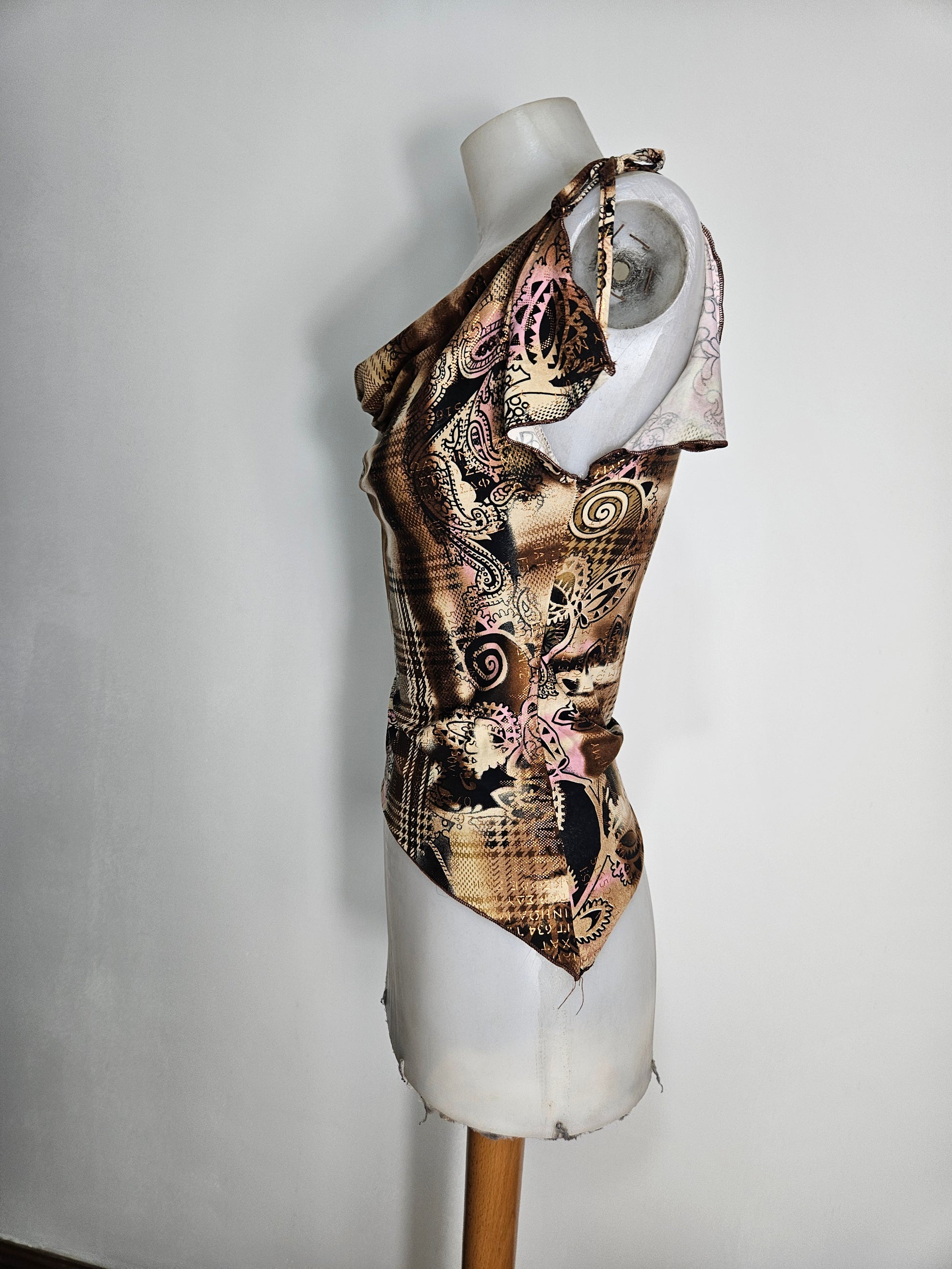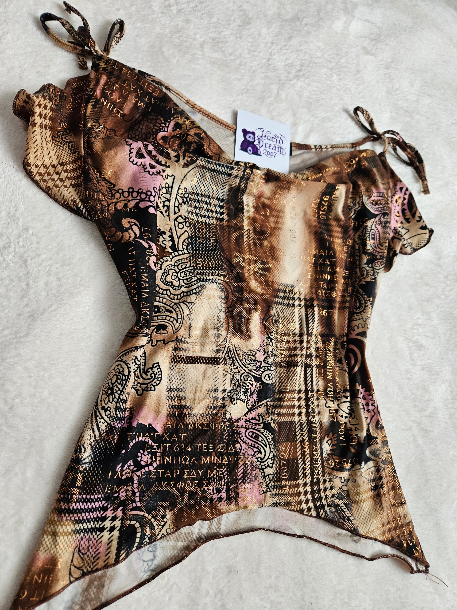 Top à manches courtes avec encolure dégagée. Coupe ajustée. Tissu extensible. Imprimé all-over dans des tons marron, beige, noir et rose, avec motifs abstraits et effets de superposition. Avec des brtelles réglablent qui se nouent et des manches courtes fendues qui forments des voalnts. Finition bord franc au bas.