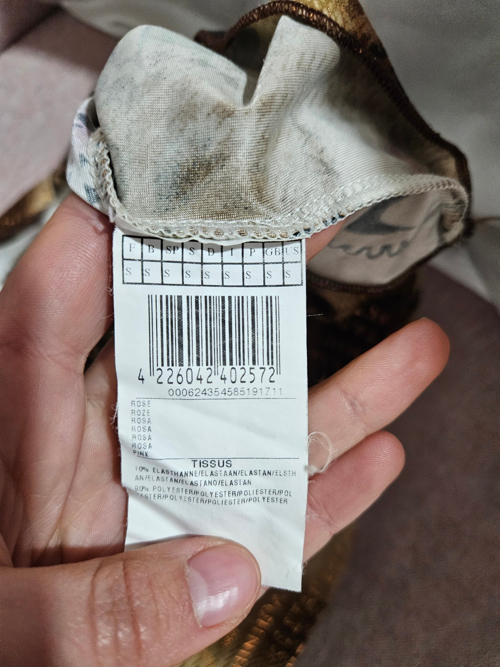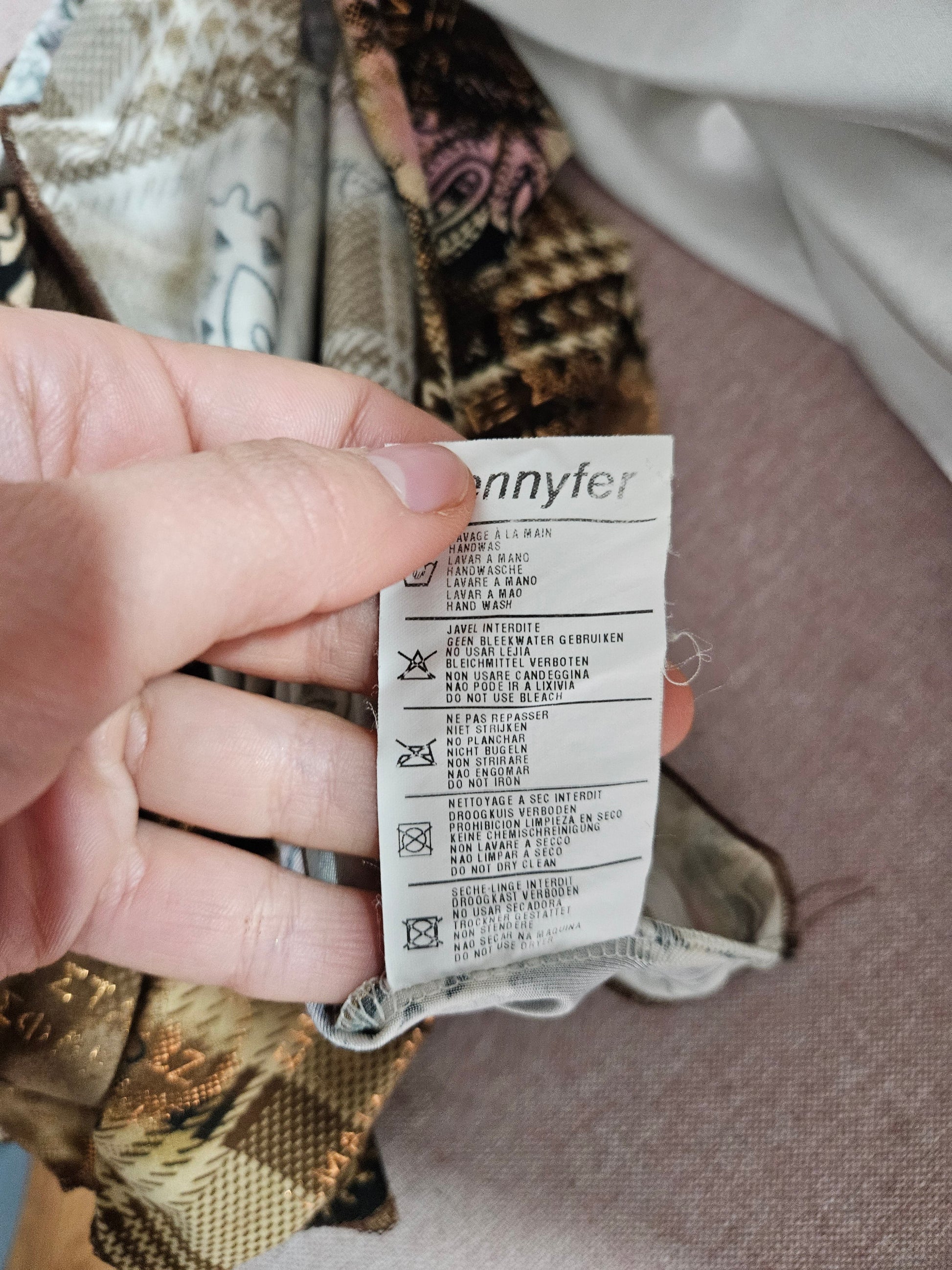 Entretien : Lavage à la main, Ne pas utiliser d’eau de Javel, Ne pas repasser, Ne pas nettoyer à sec, Ne pas sécher en machine.