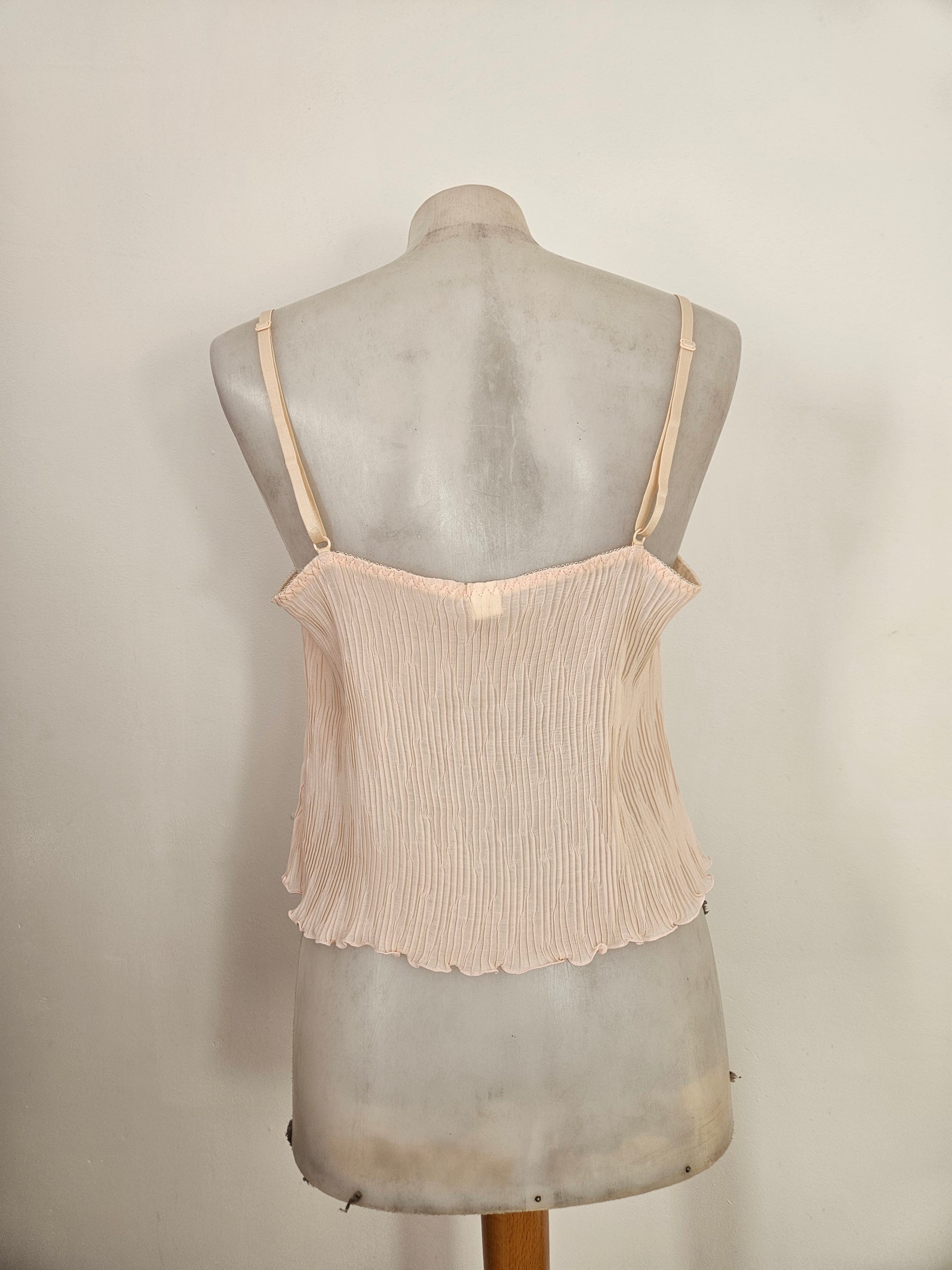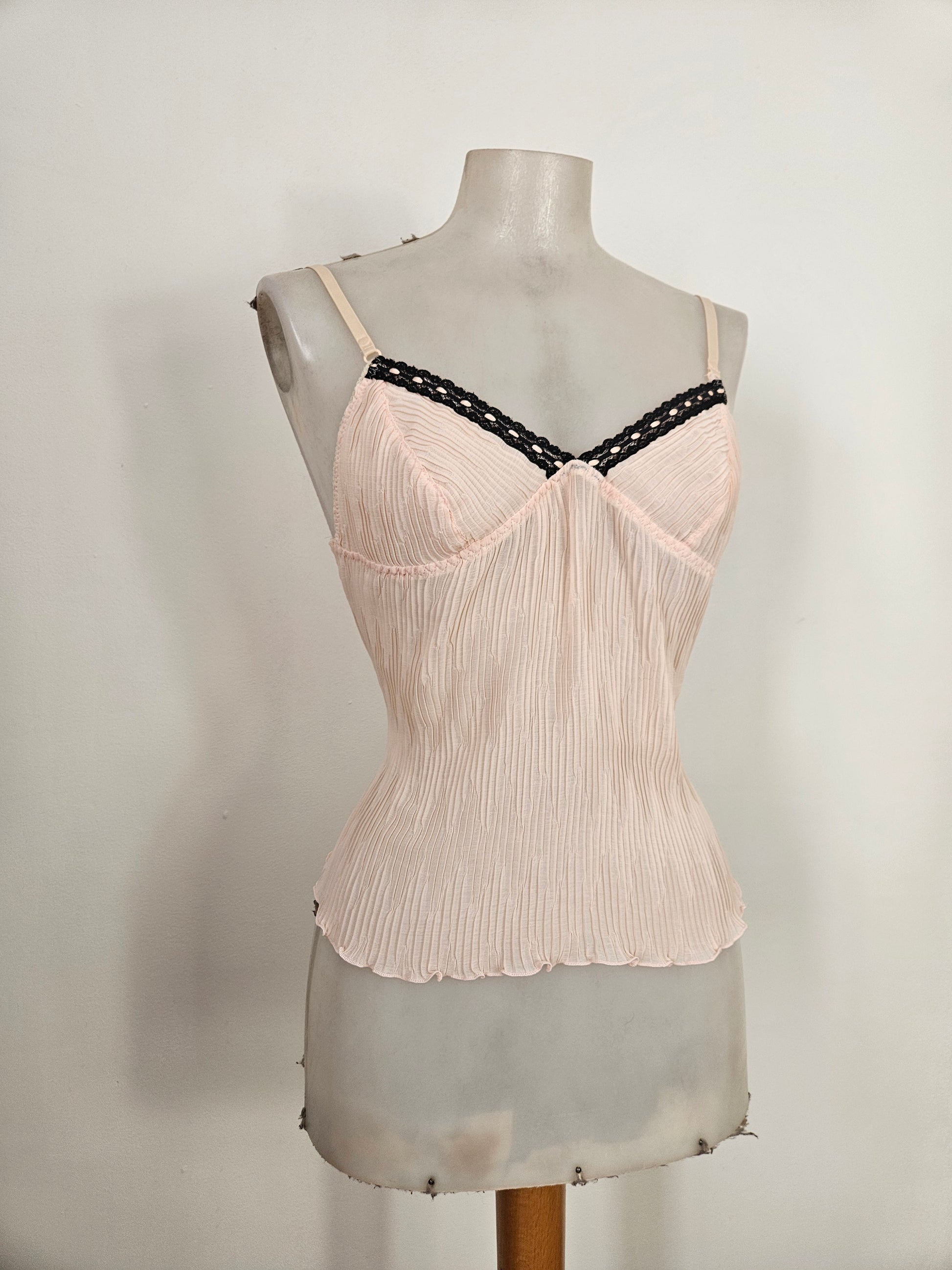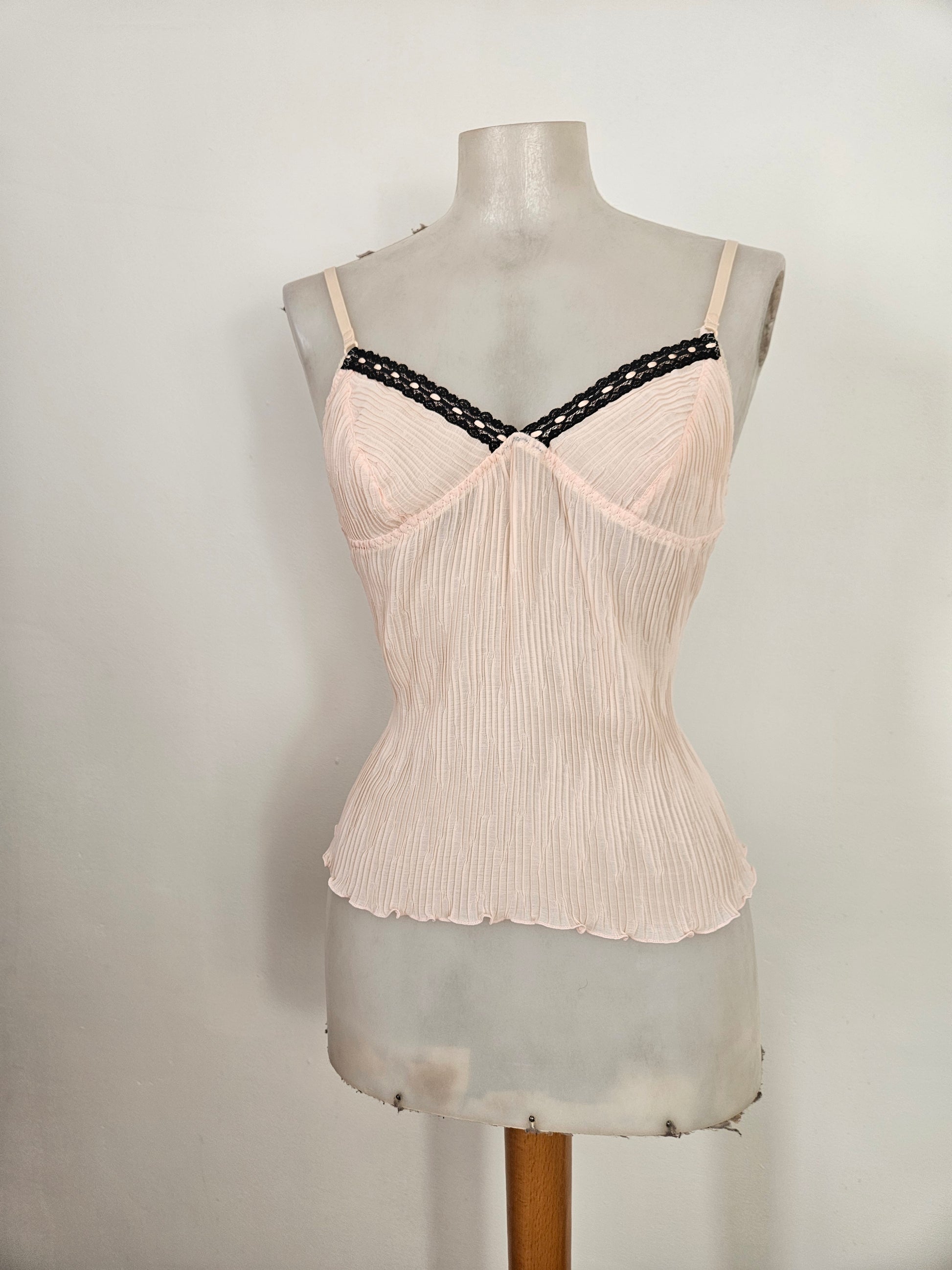 Haut en voile rose poudé. Avec un joli décolleté V orné de dentelle noir. Moulant au nvieau de la poitrine puis fluide au niveau du ventre. Non doublé, le haut est donc transparent. Matière extensible et transparente.
