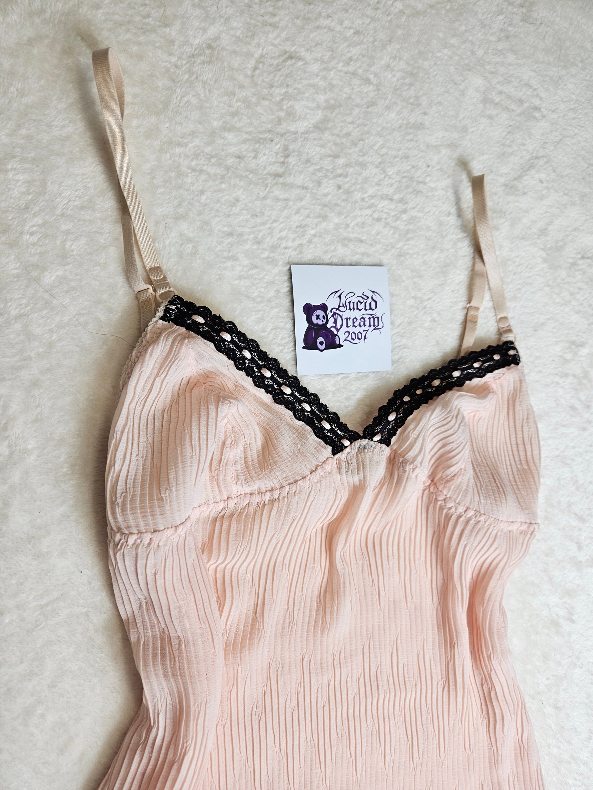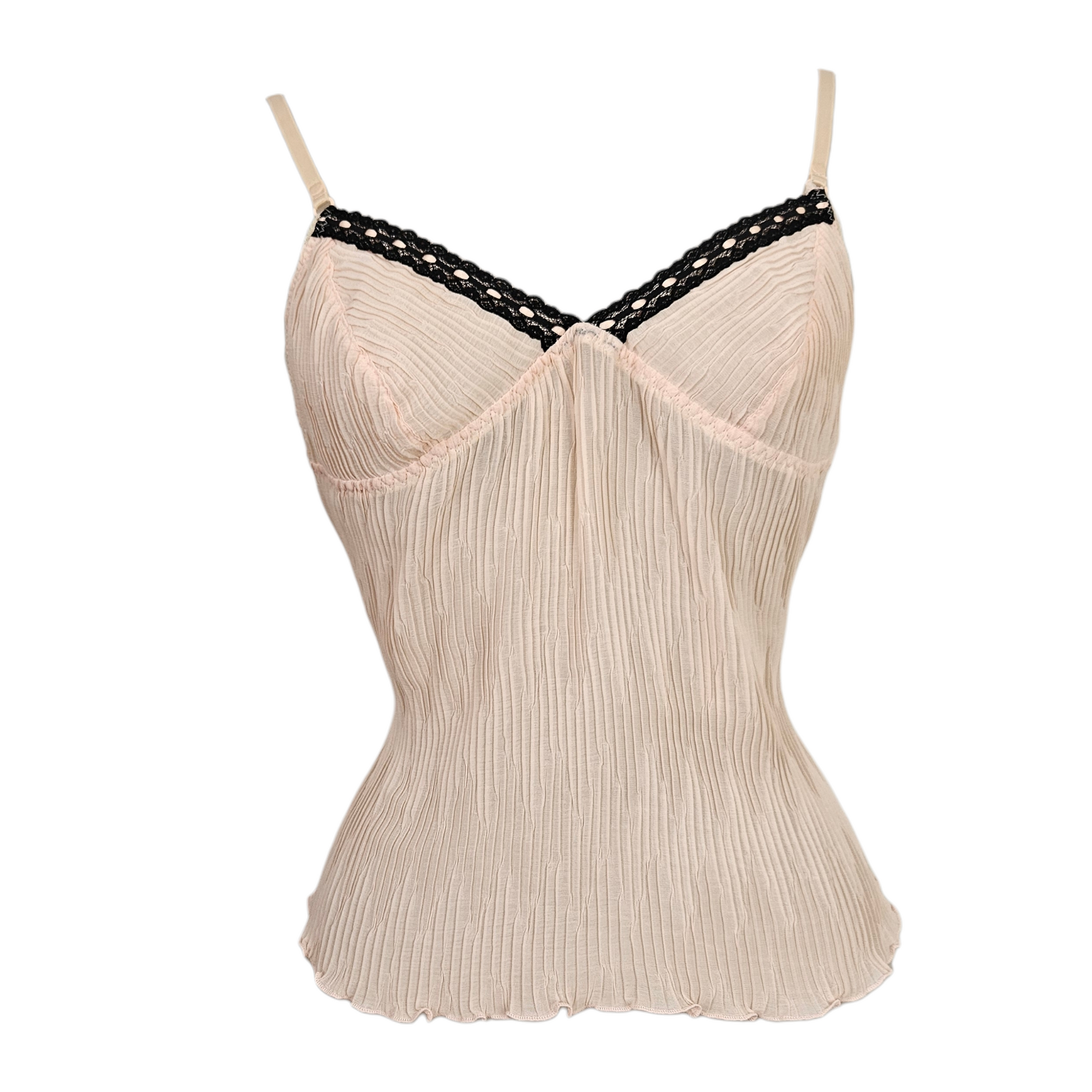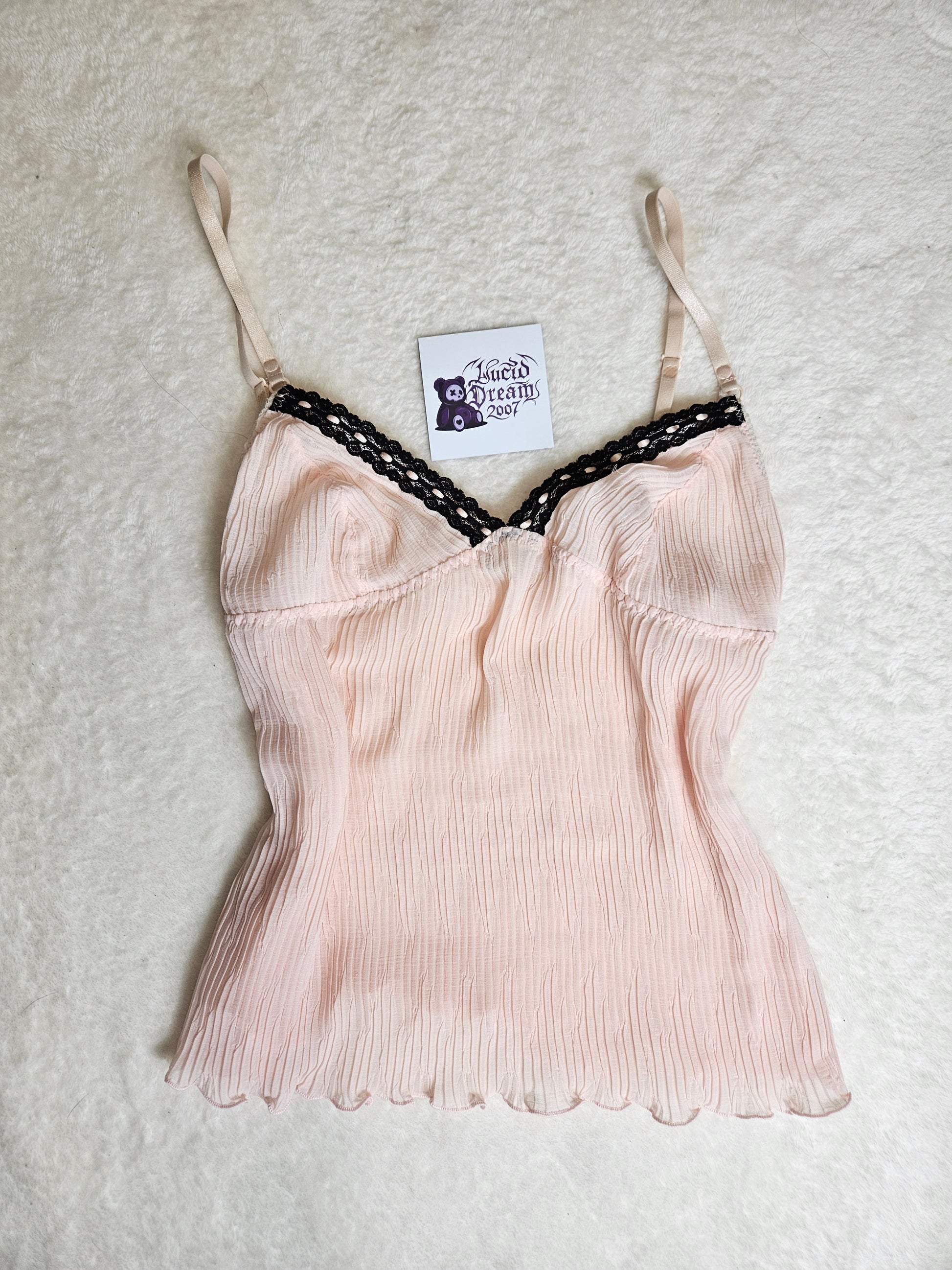 Haut en voile rose poudé. Avec un joli décolleté V orné de dentelle noir. Moulant au nvieau de la poitrine puis fluide au niveau du ventre. Non doublé, le haut est donc transparent. Matière extensible et transparente.