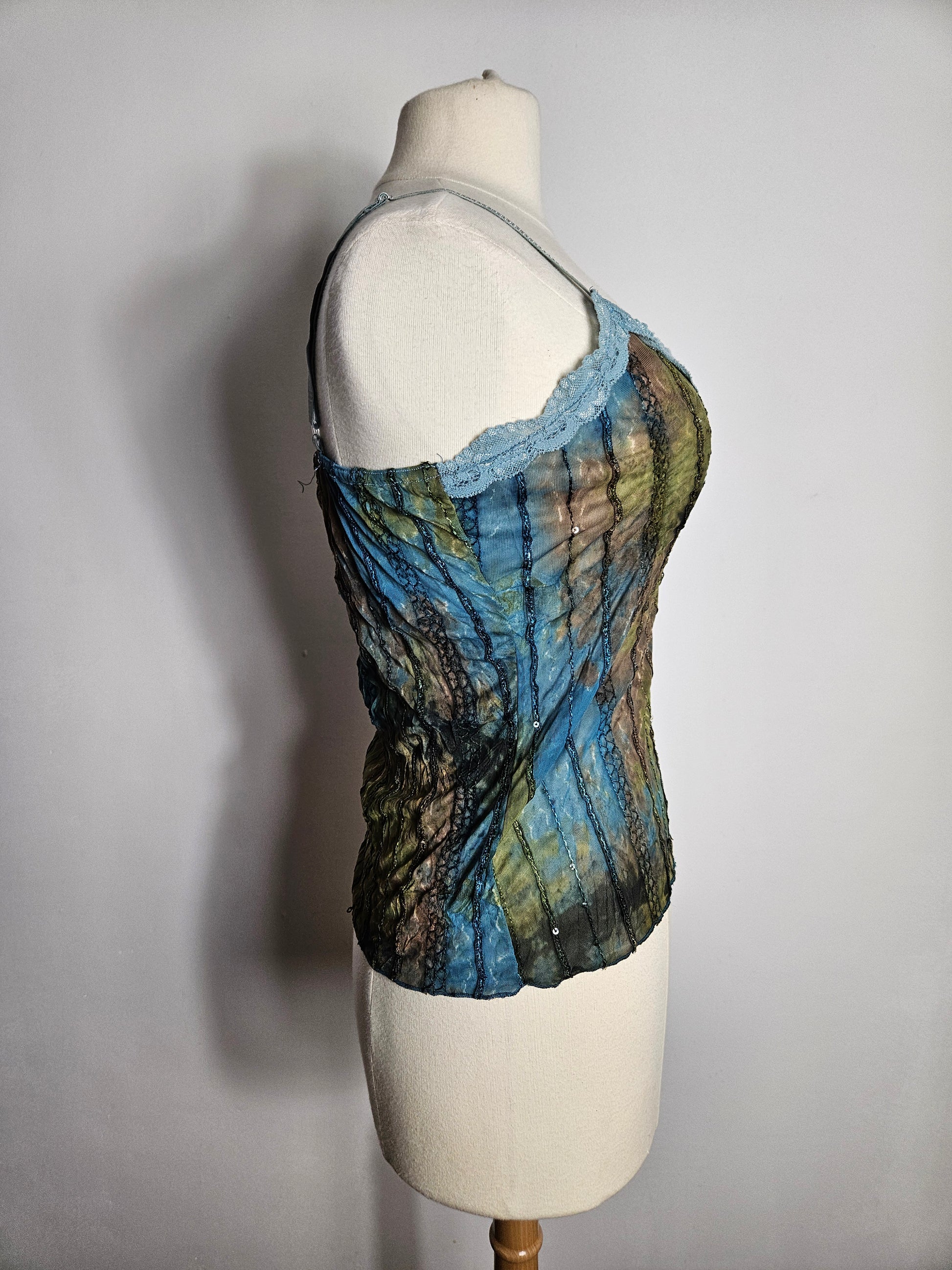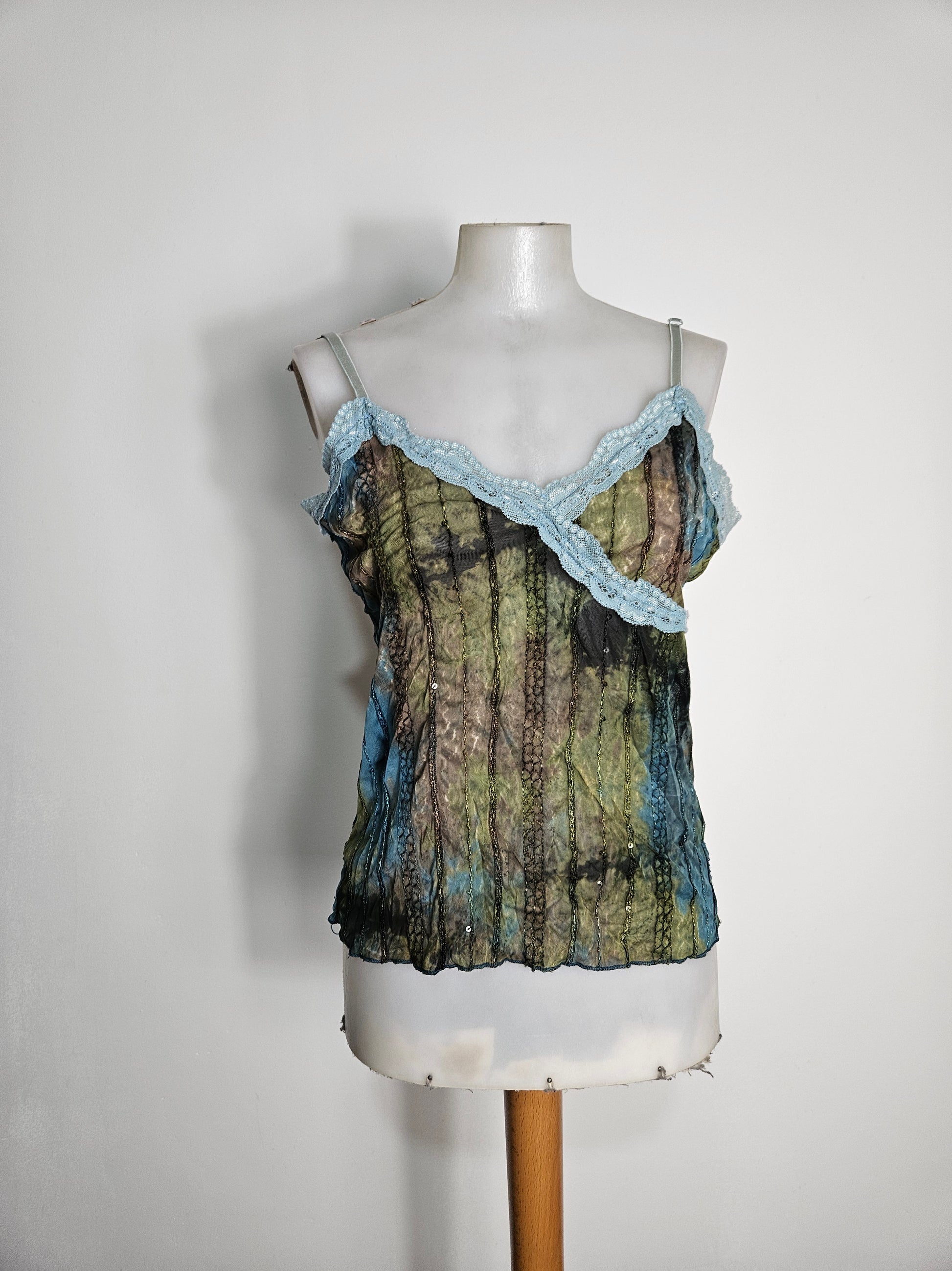 Top à fines bretelles en matière légère et semi-transparente. Coupe ajustée. Motif abstrait multicolore dans des tons verts, bleus et bruns. Détails de coutures verticales apparentes sur l’ensemble du tissu. Encolure croisée soulignée par une bordure en dentelle bleu clair. Ourlet droit. Transparent.