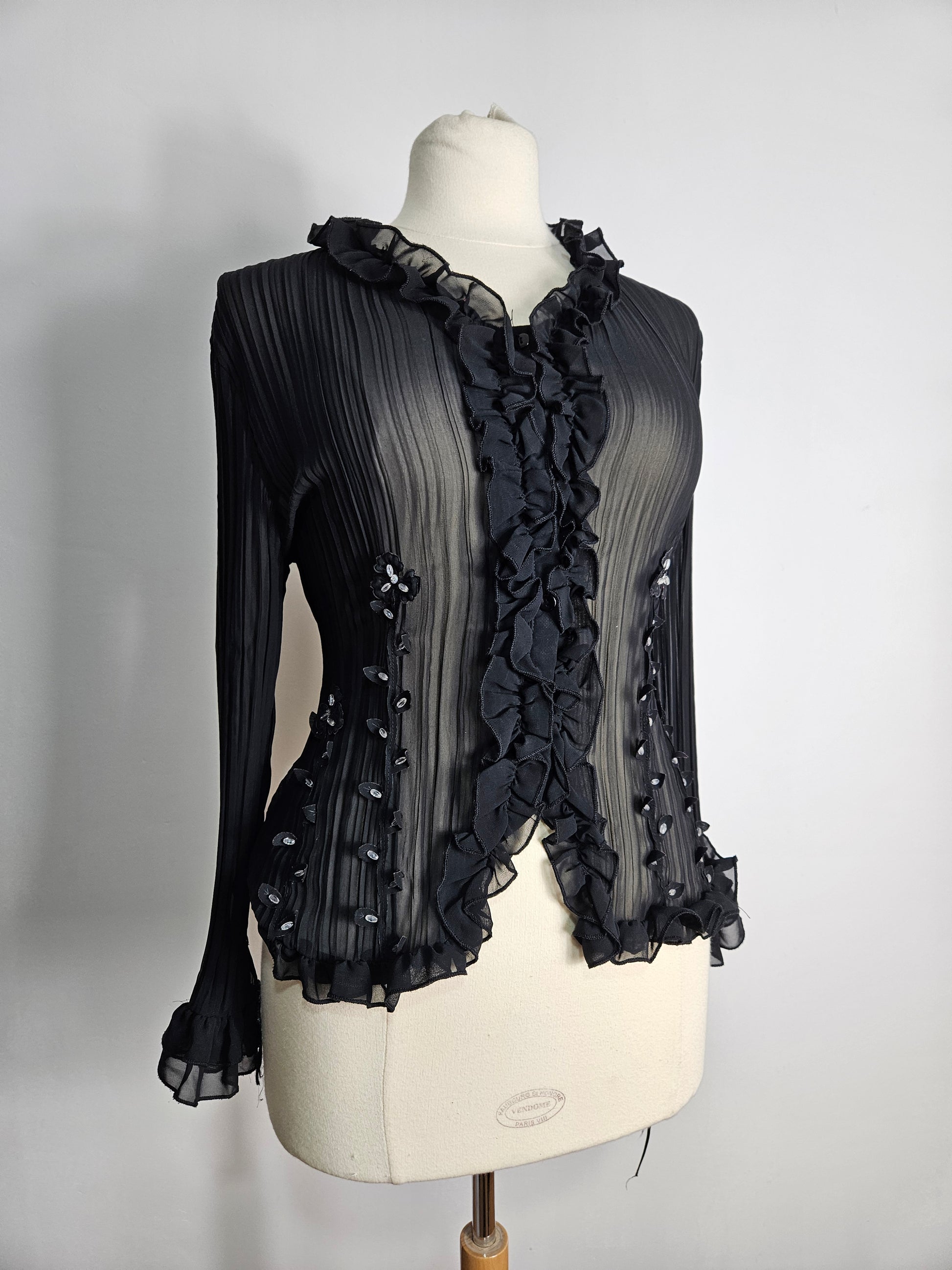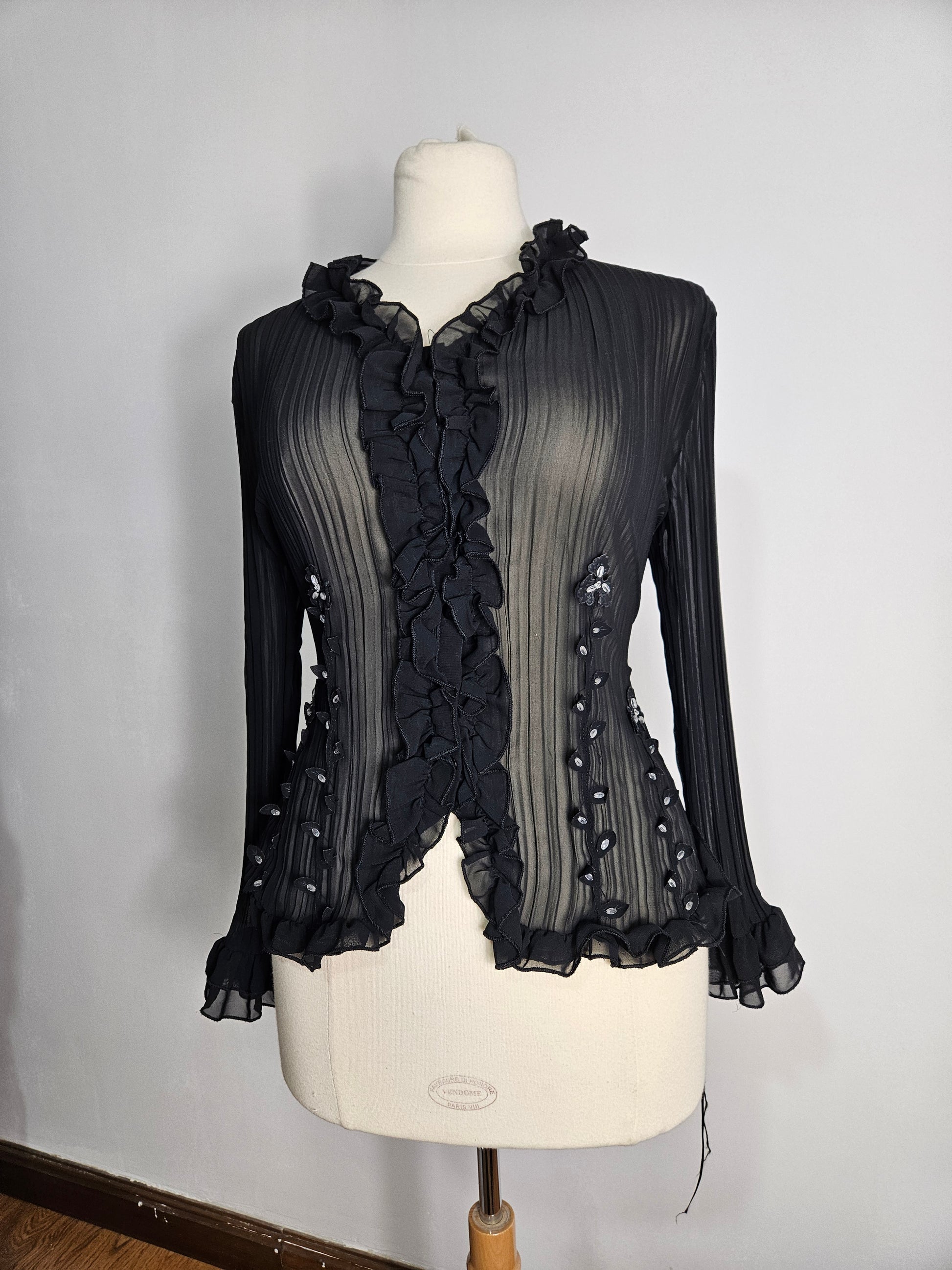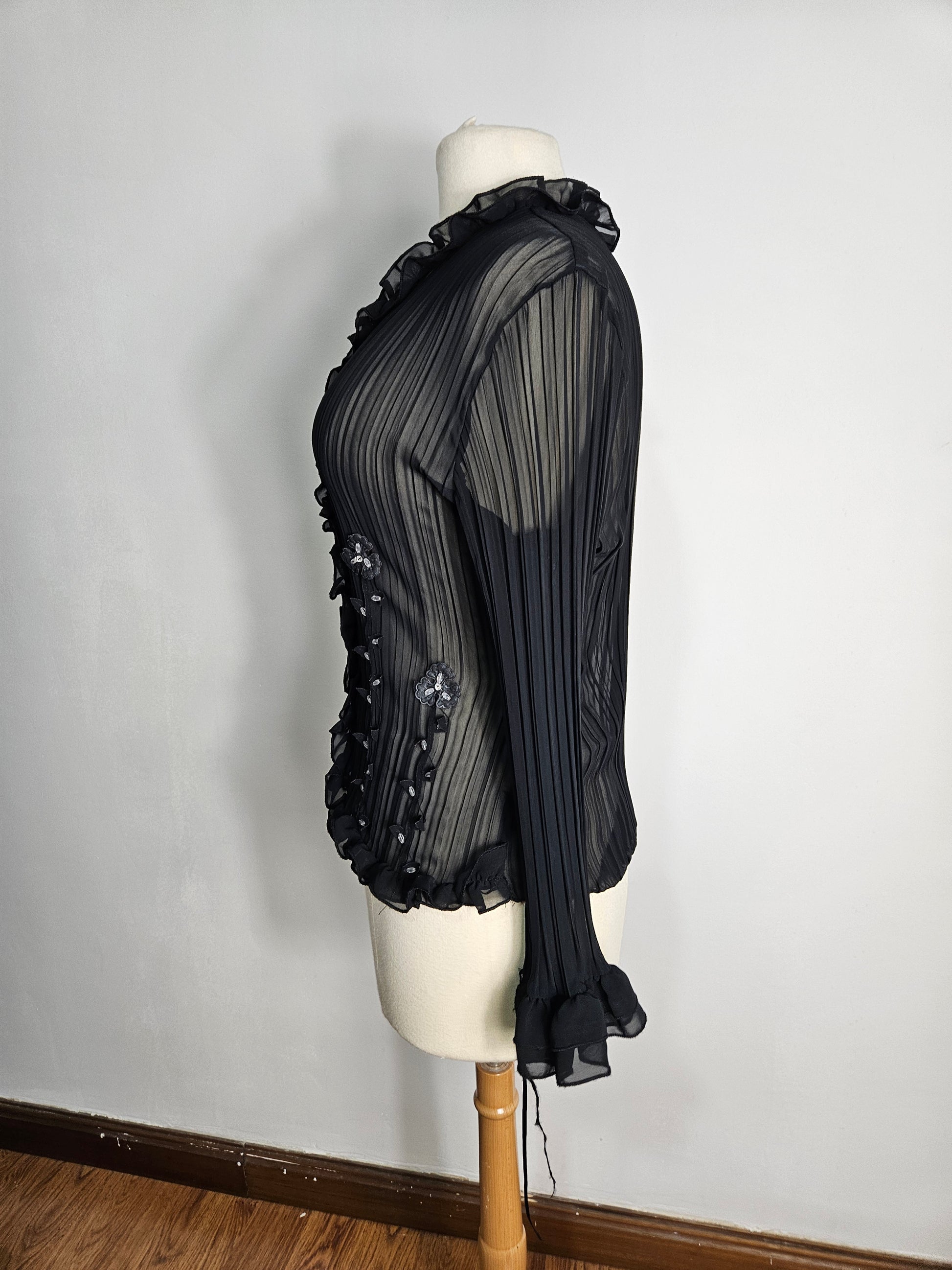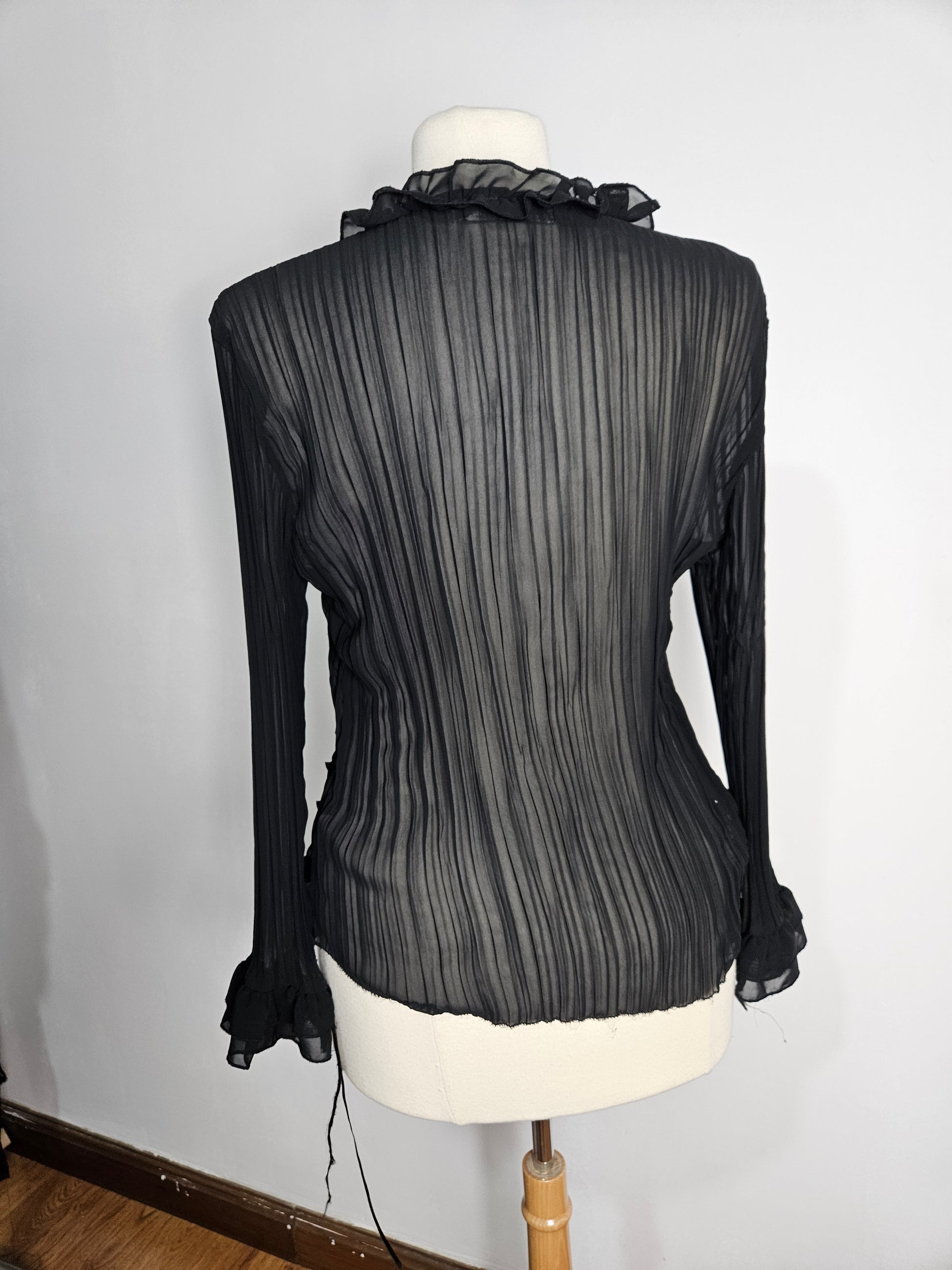 Haut de couleur noire à manches longues, confectionné dans une matière semi-transparente. Modèle plissé sur l’ensemble du tissu. Encolure ouverte sur le devant avec volants décoratifs verticaux et finitions volantées. Bas des manches et ourlet également soulignés de volants. Détails décoratifs appliqués sur les côtés.