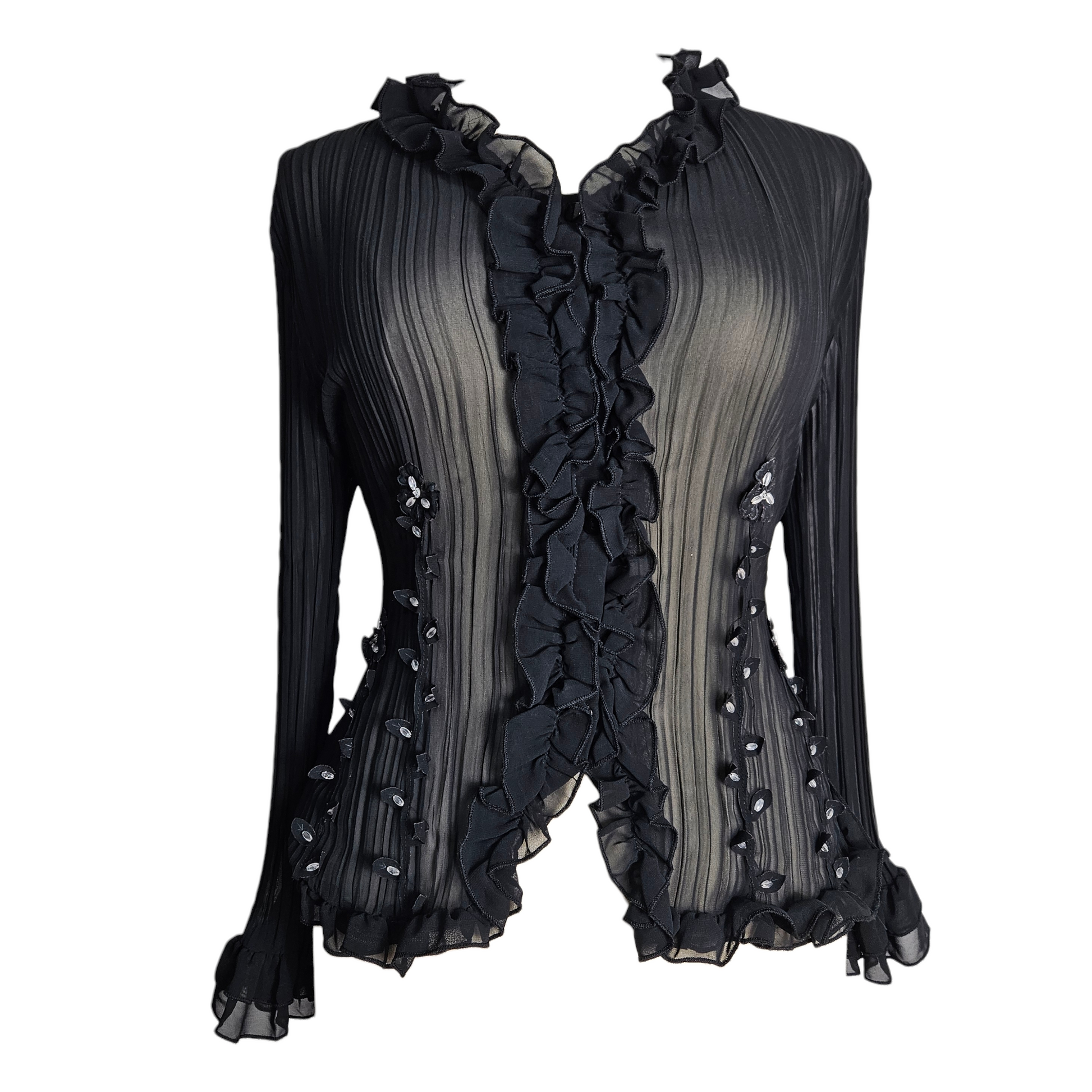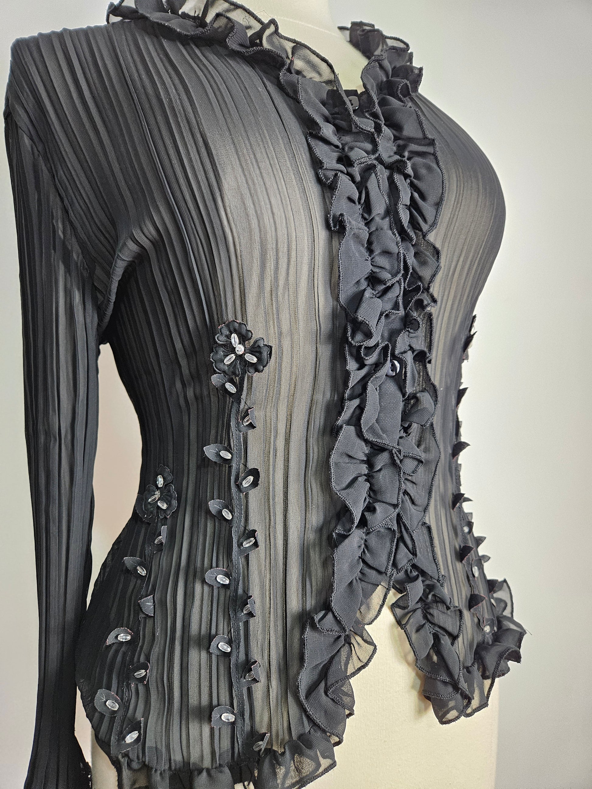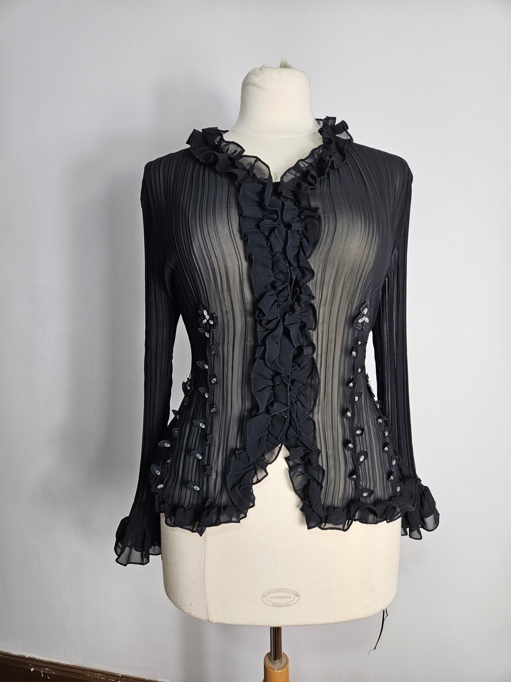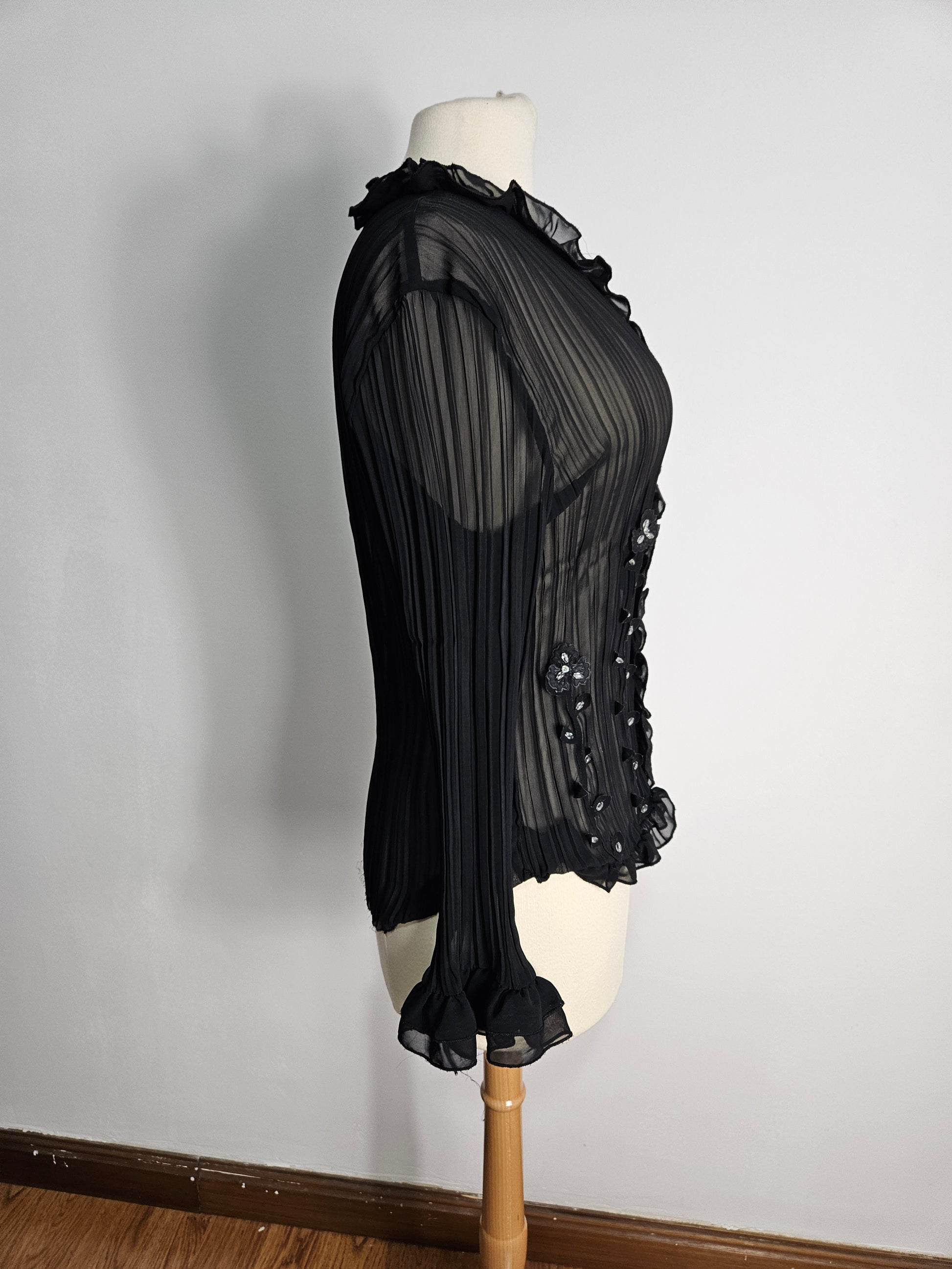 Haut de couleur noire à manches longues, confectionné dans une matière semi-transparente. Modèle plissé sur l’ensemble du tissu. Encolure ouverte sur le devant avec volants décoratifs verticaux et finitions volantées. Bas des manches et ourlet également soulignés de volants. Détails décoratifs appliqués sur les côtés.