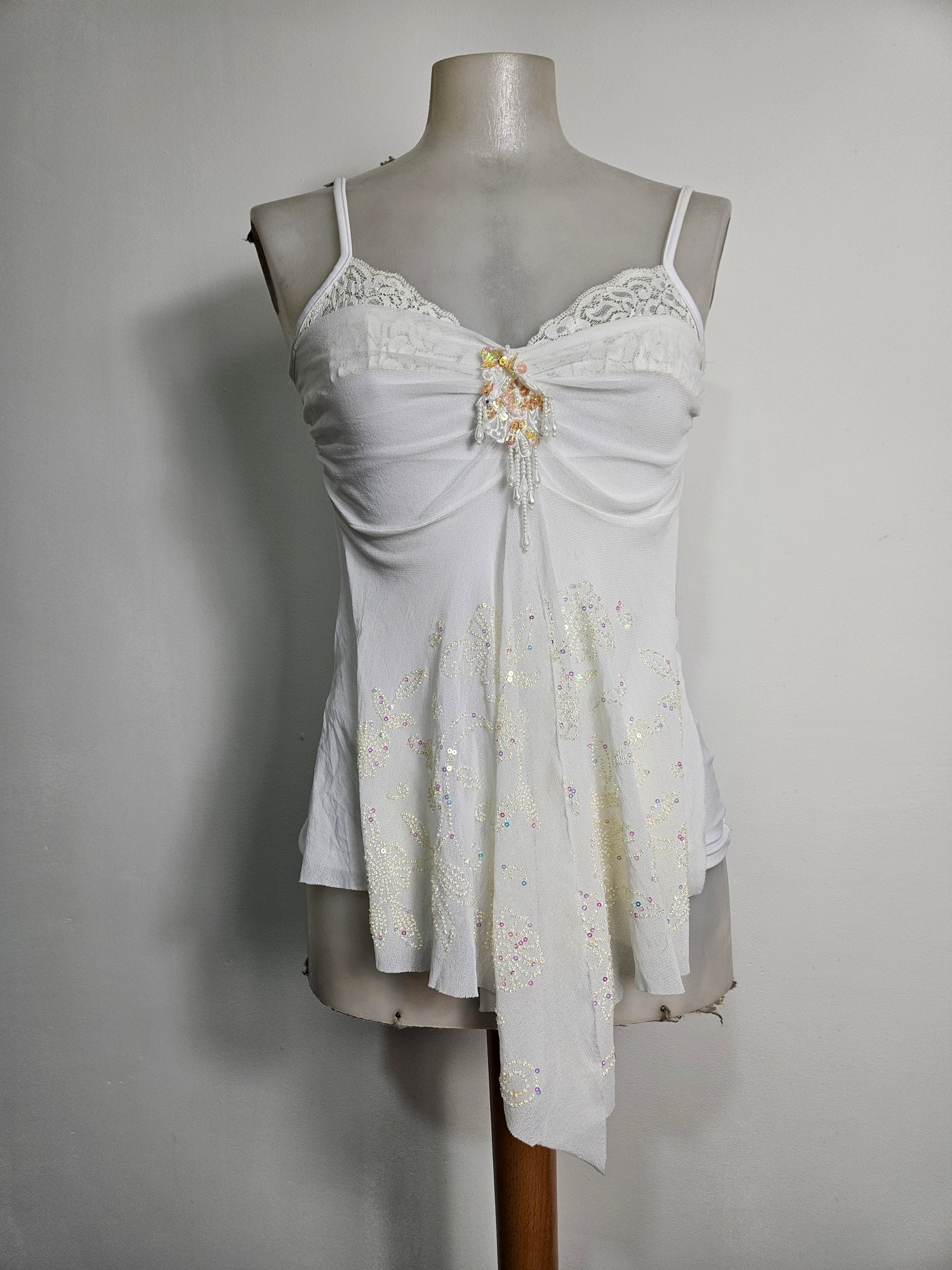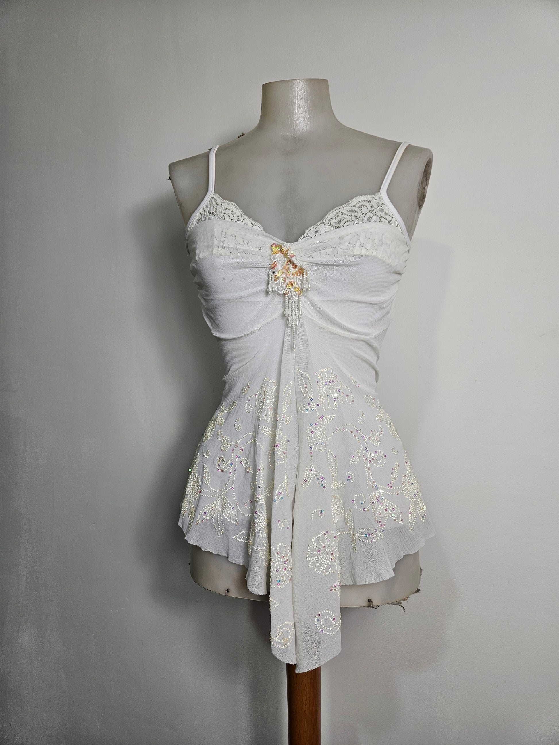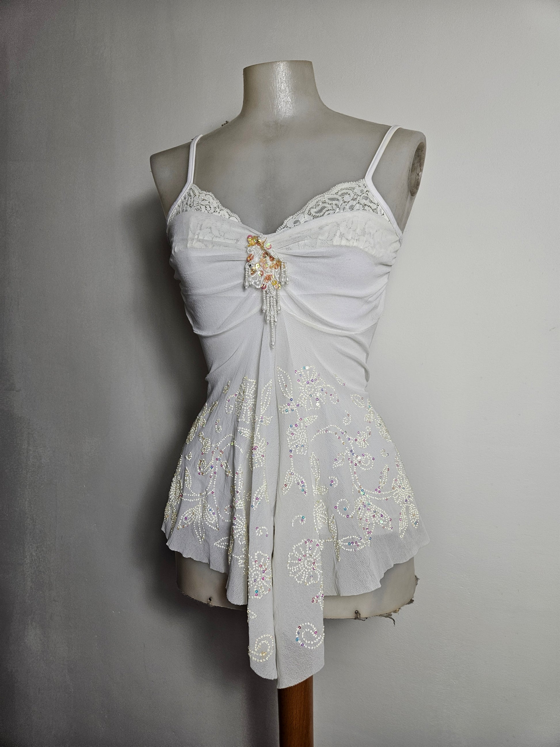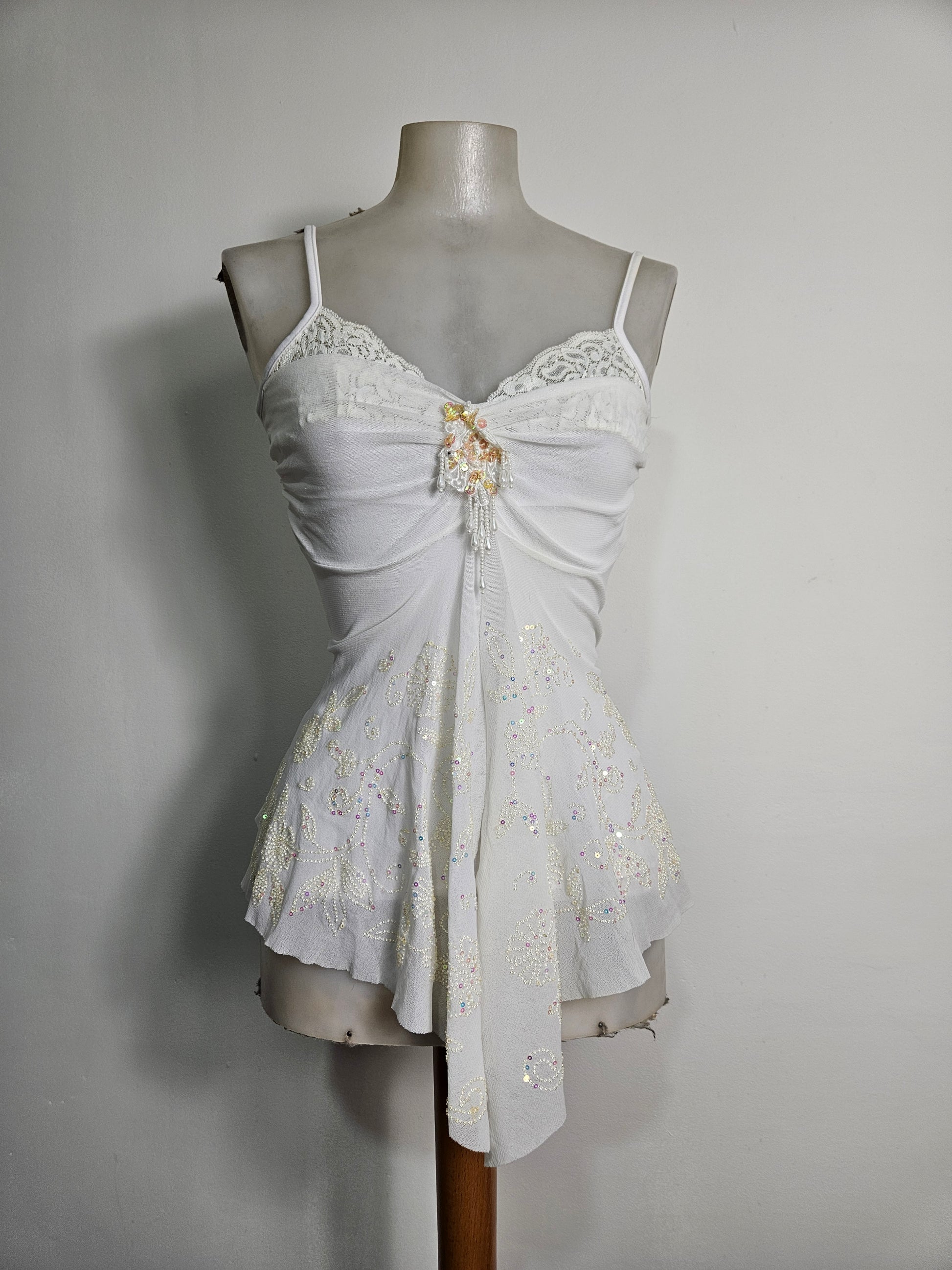 - Top blanc à fines bretelles, avec décolleté orné de dentelle et d’un bijou central décoratif à perles et sequins.