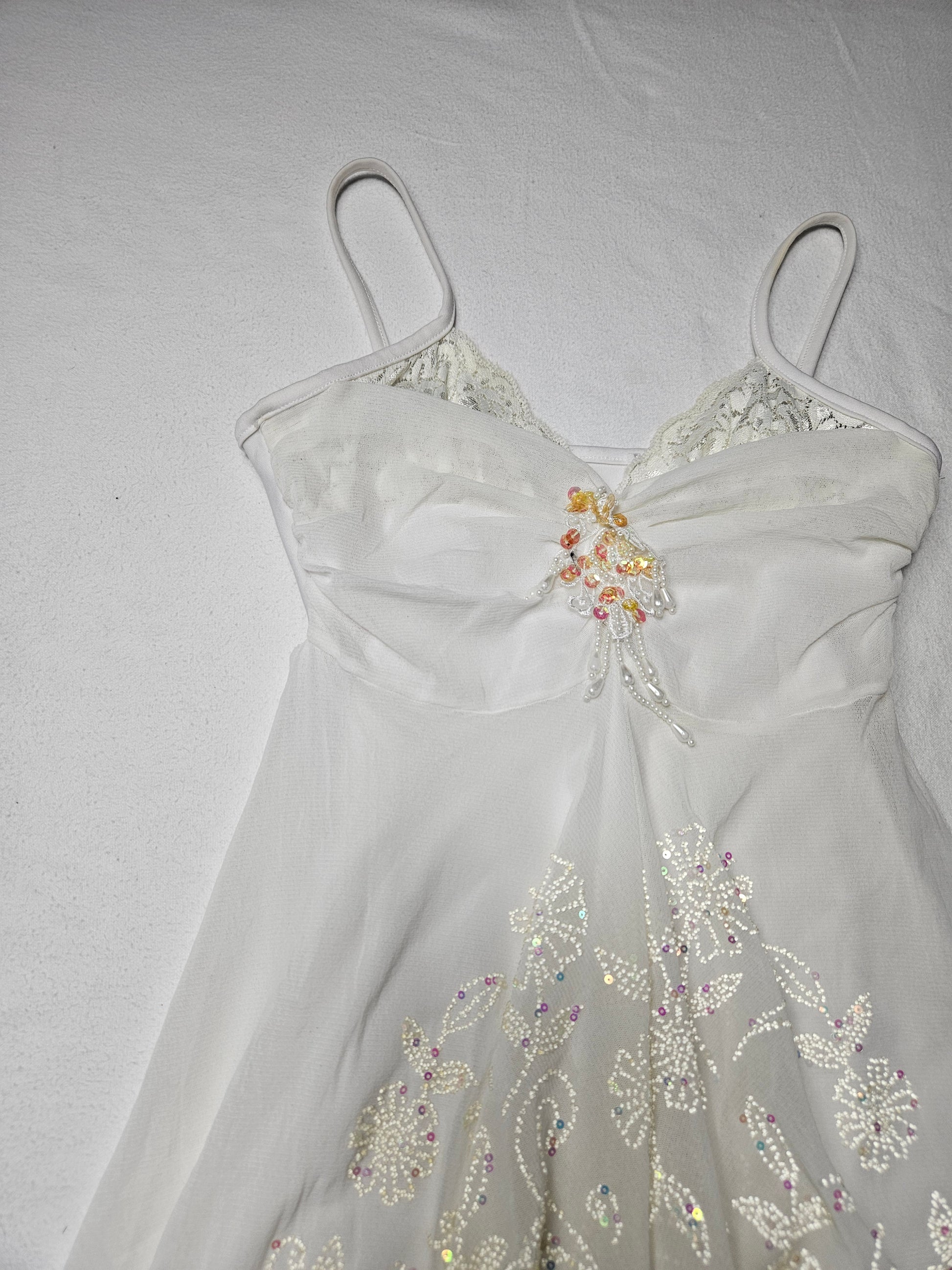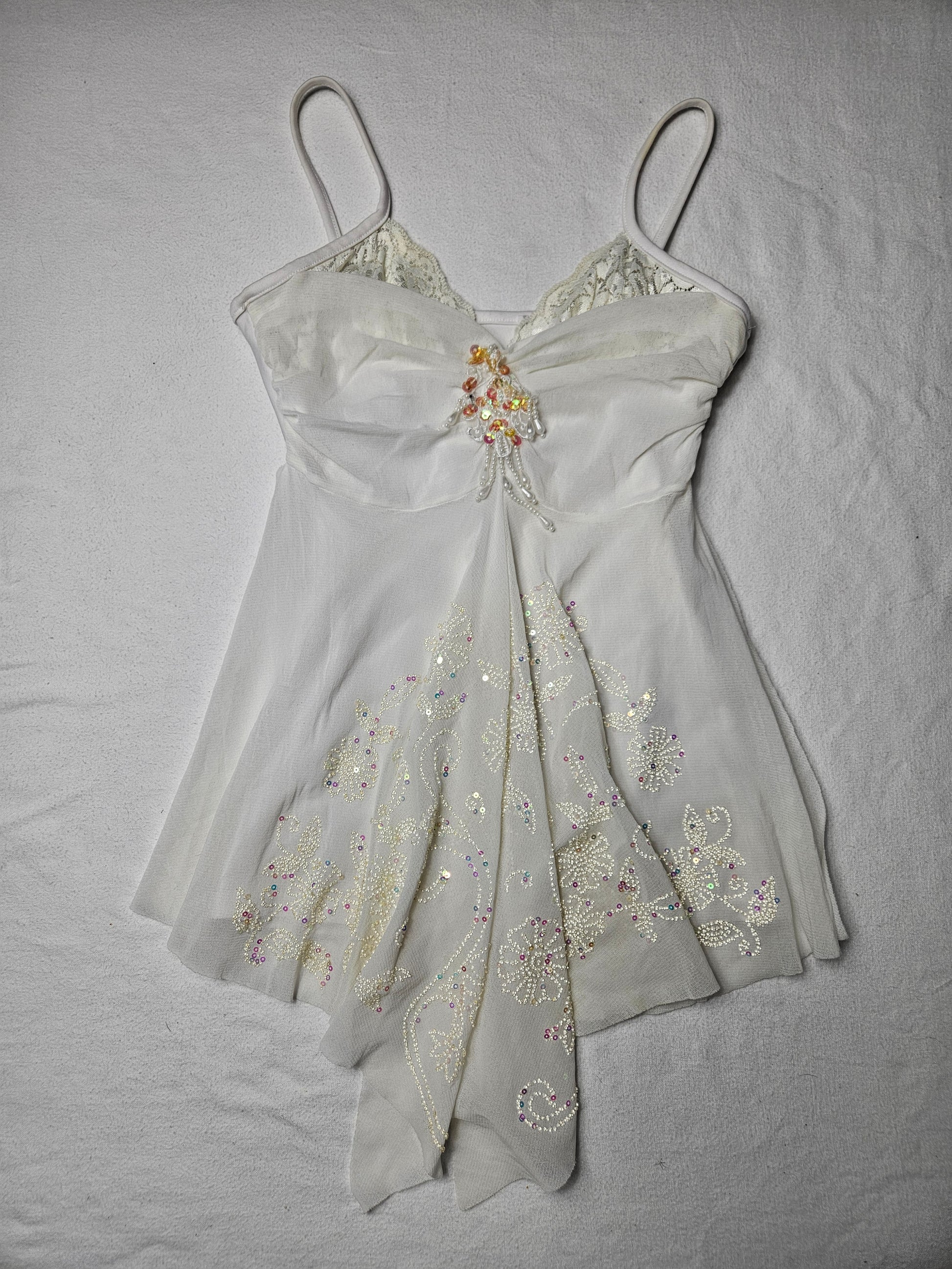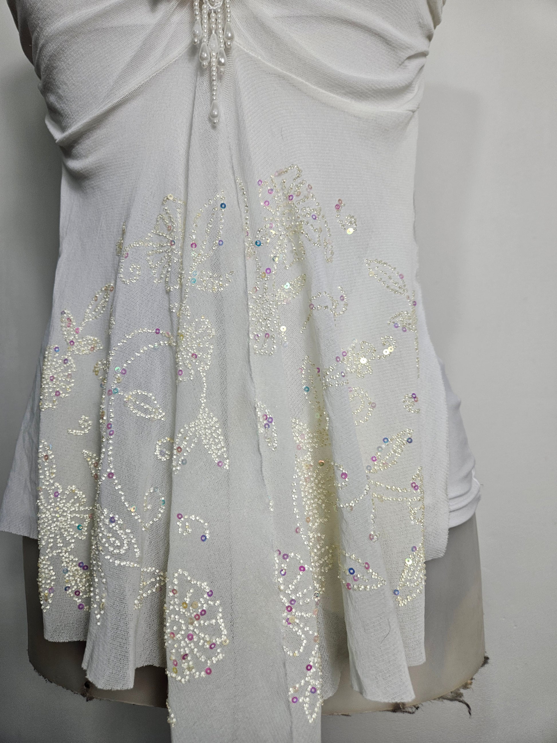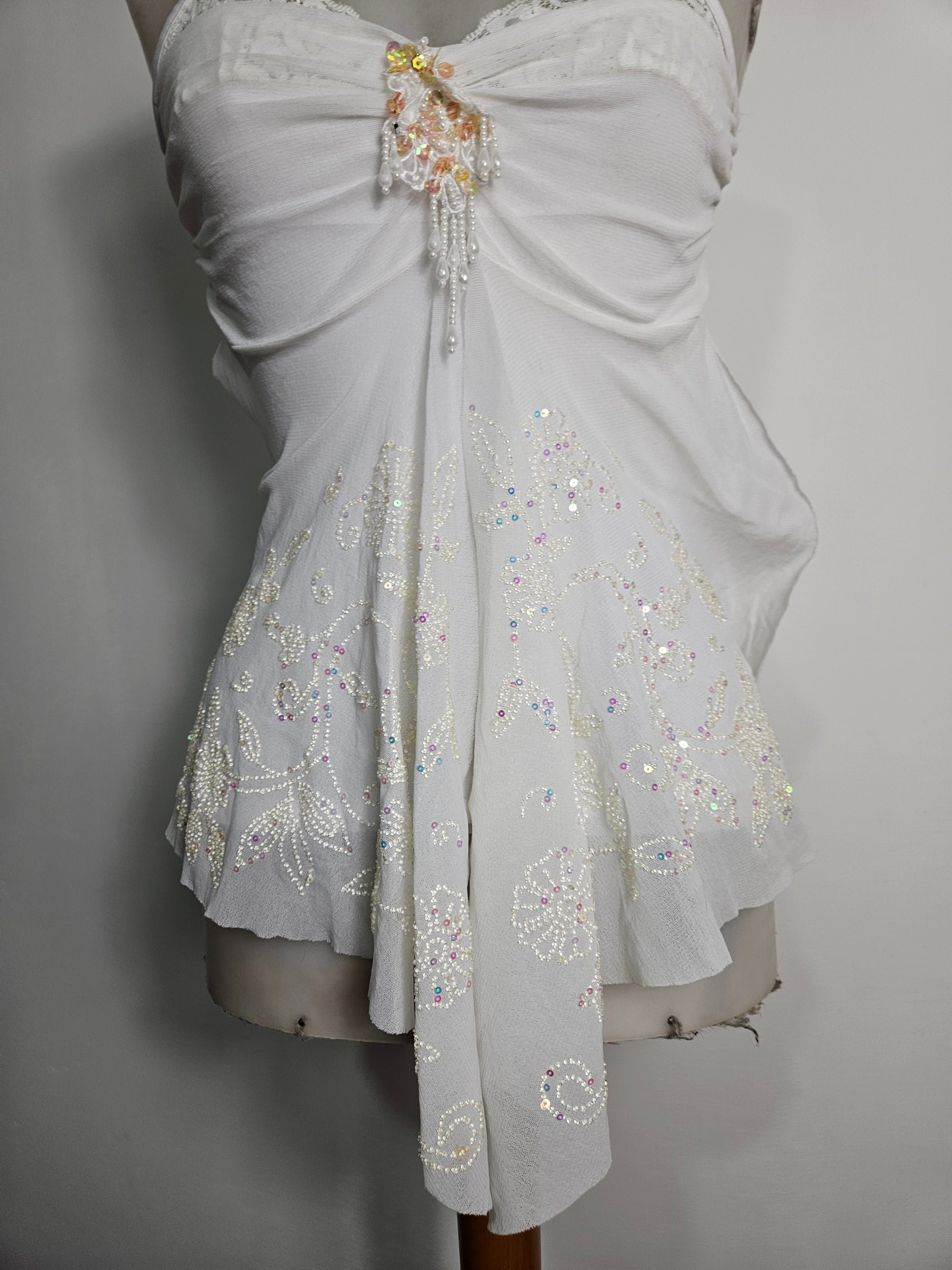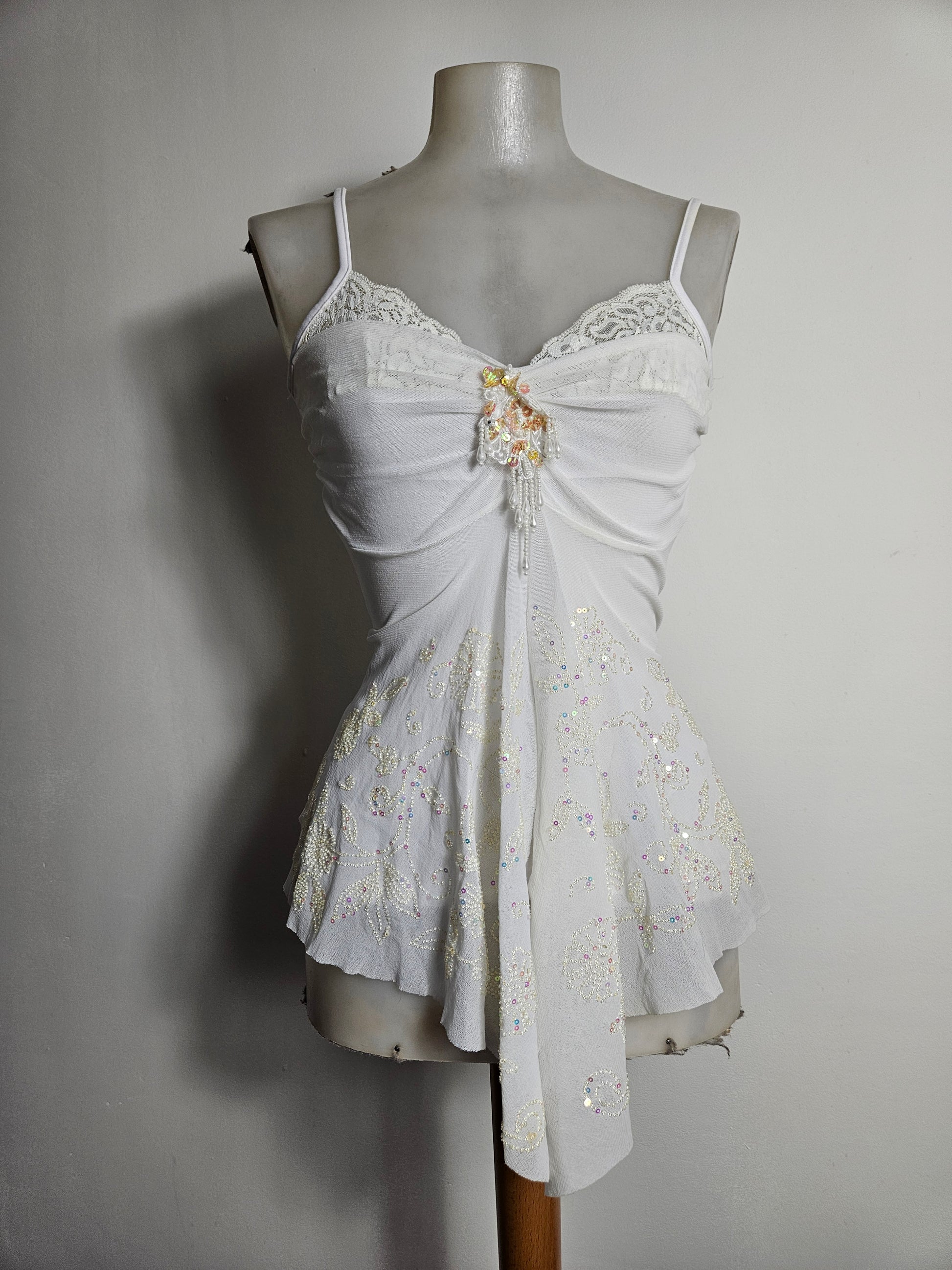 - Top blanc à fines bretelles, avec décolleté orné de dentelle et d’un bijou central décoratif à perles et sequins.