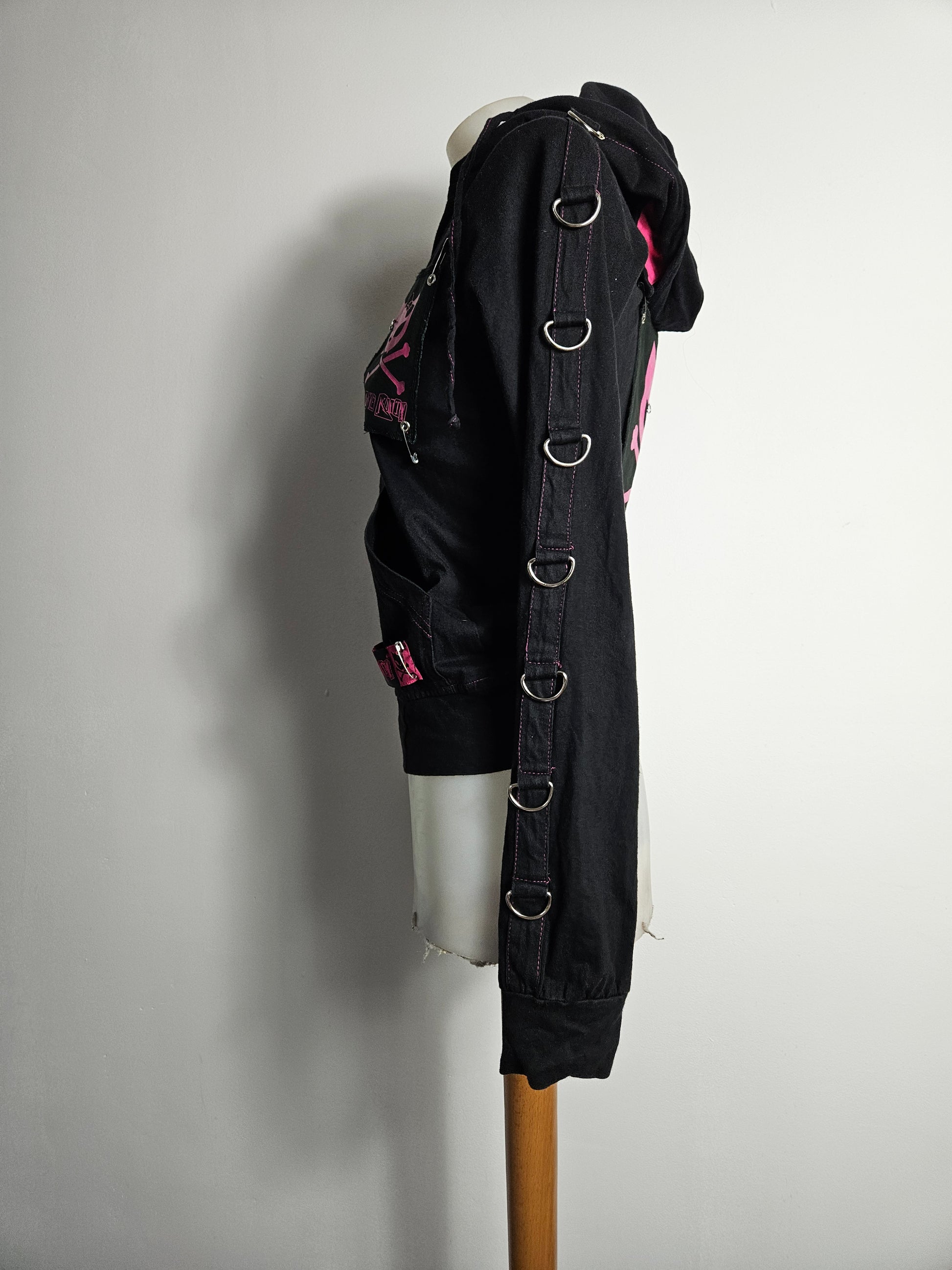 - Manches ornées d’anneaux métalliques et surpiqûres roses
