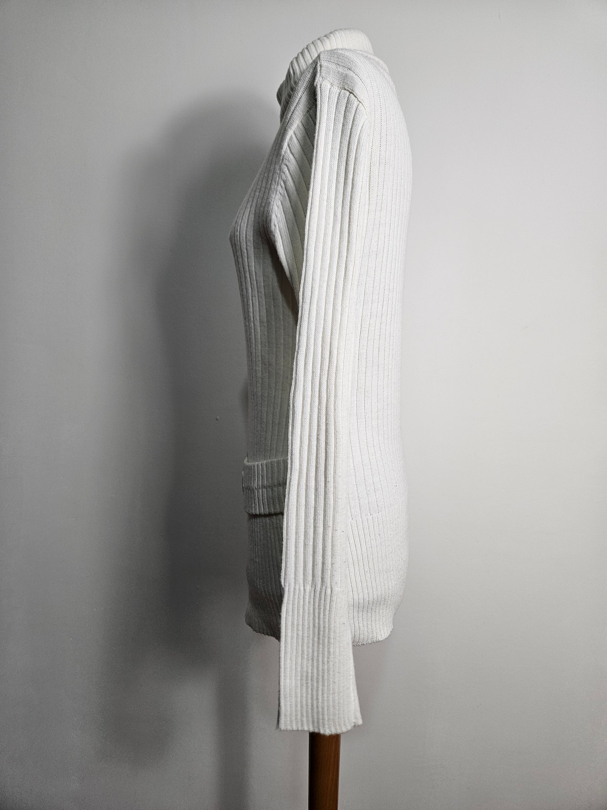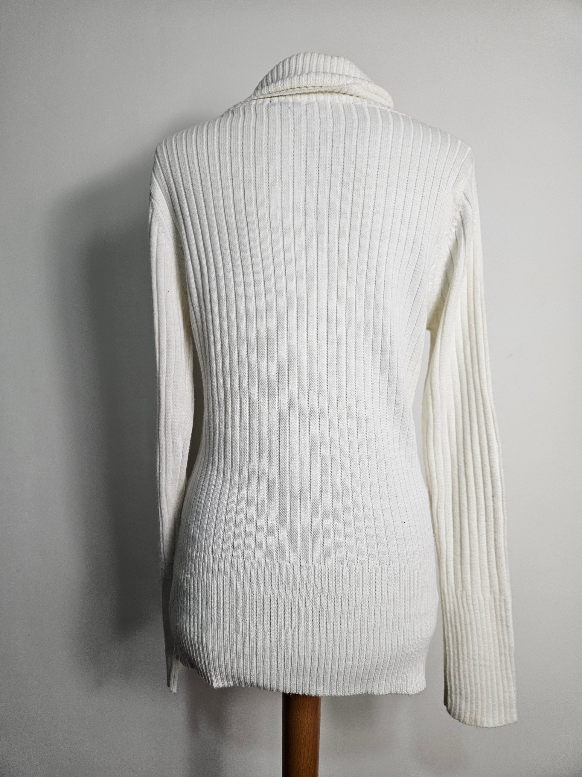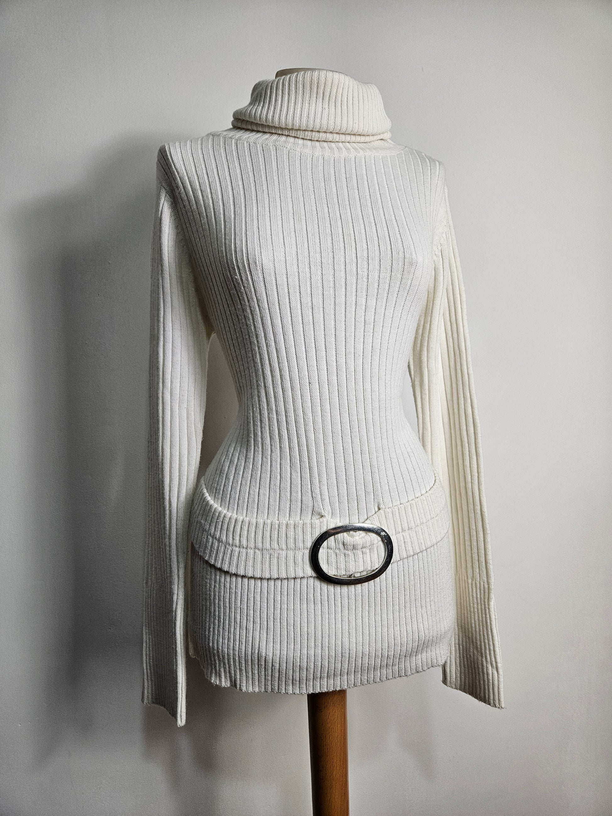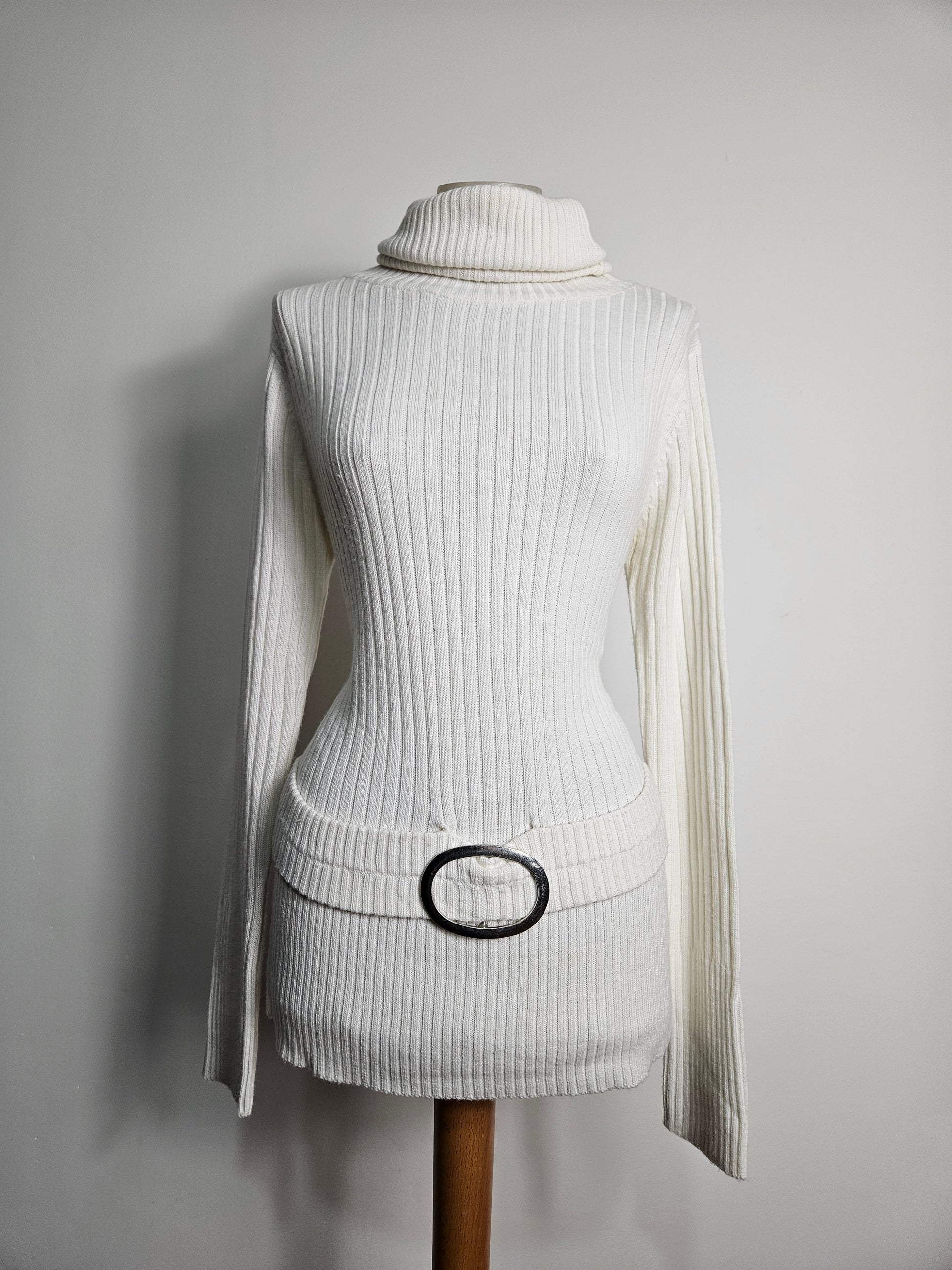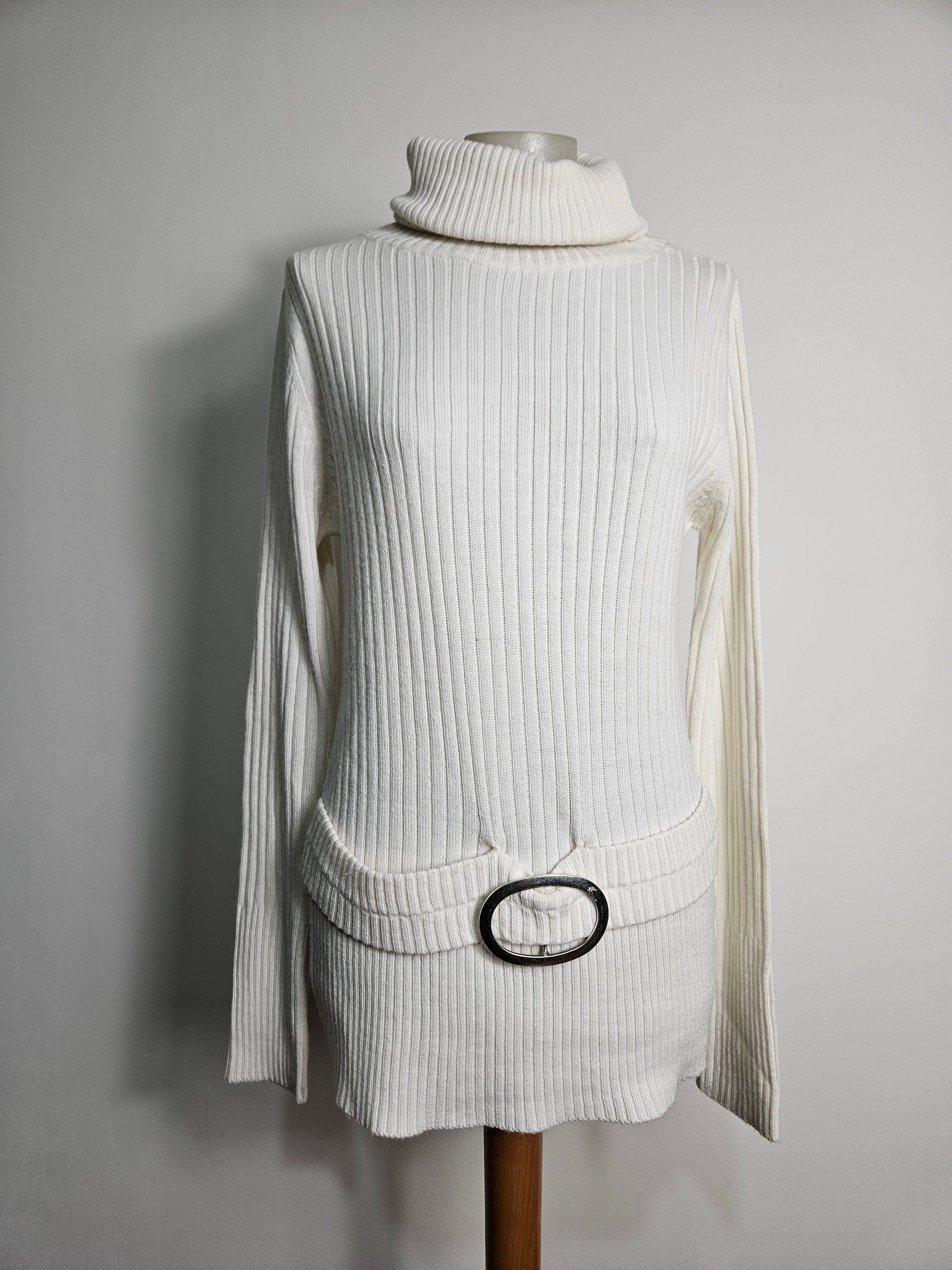 - Le pull possède une fausse ceinture à boucle ovale métallique.