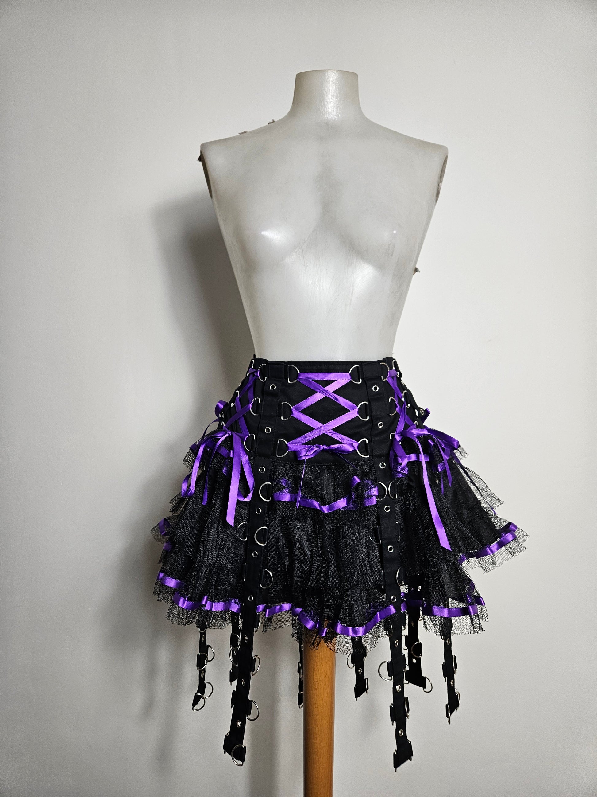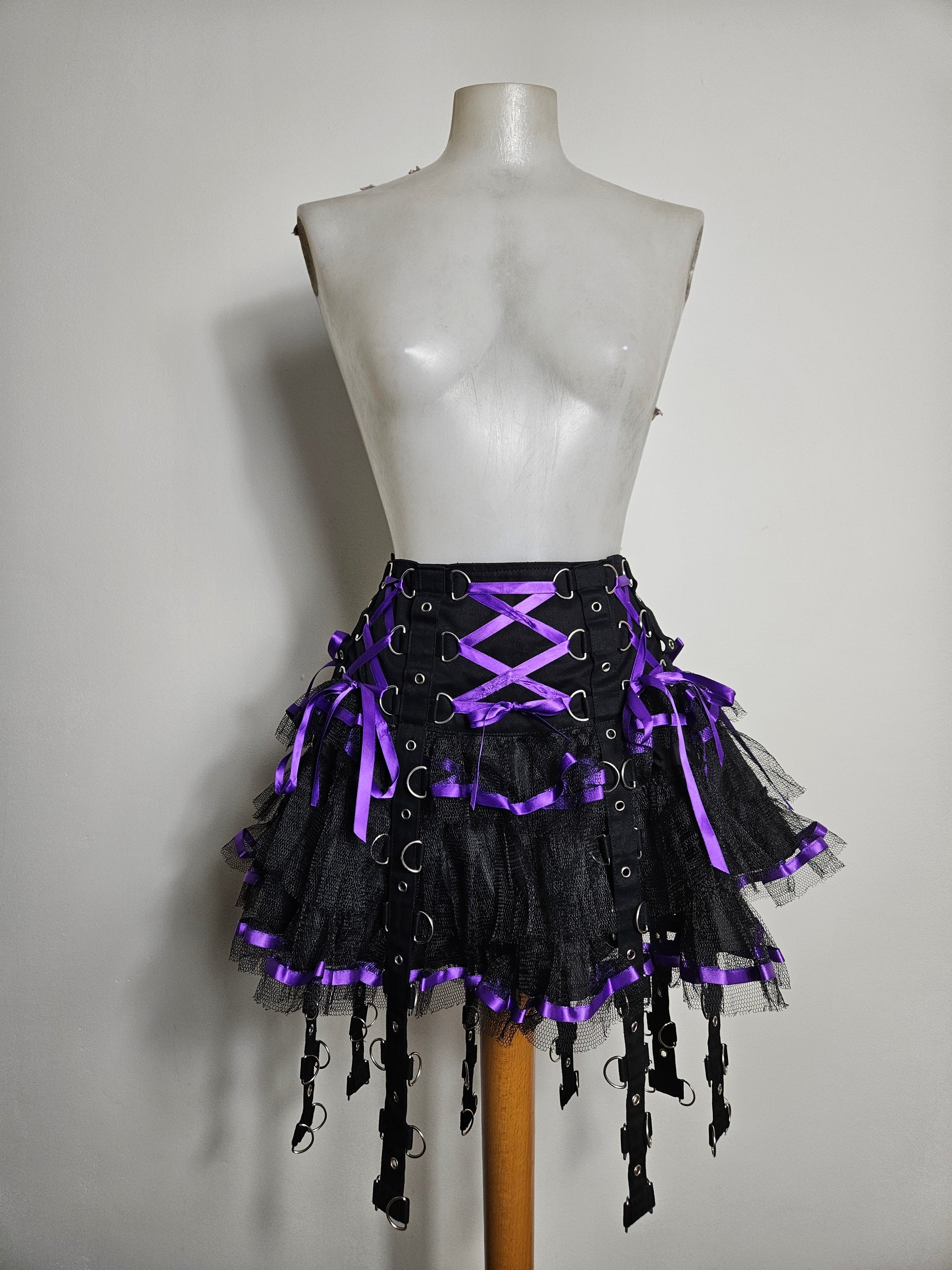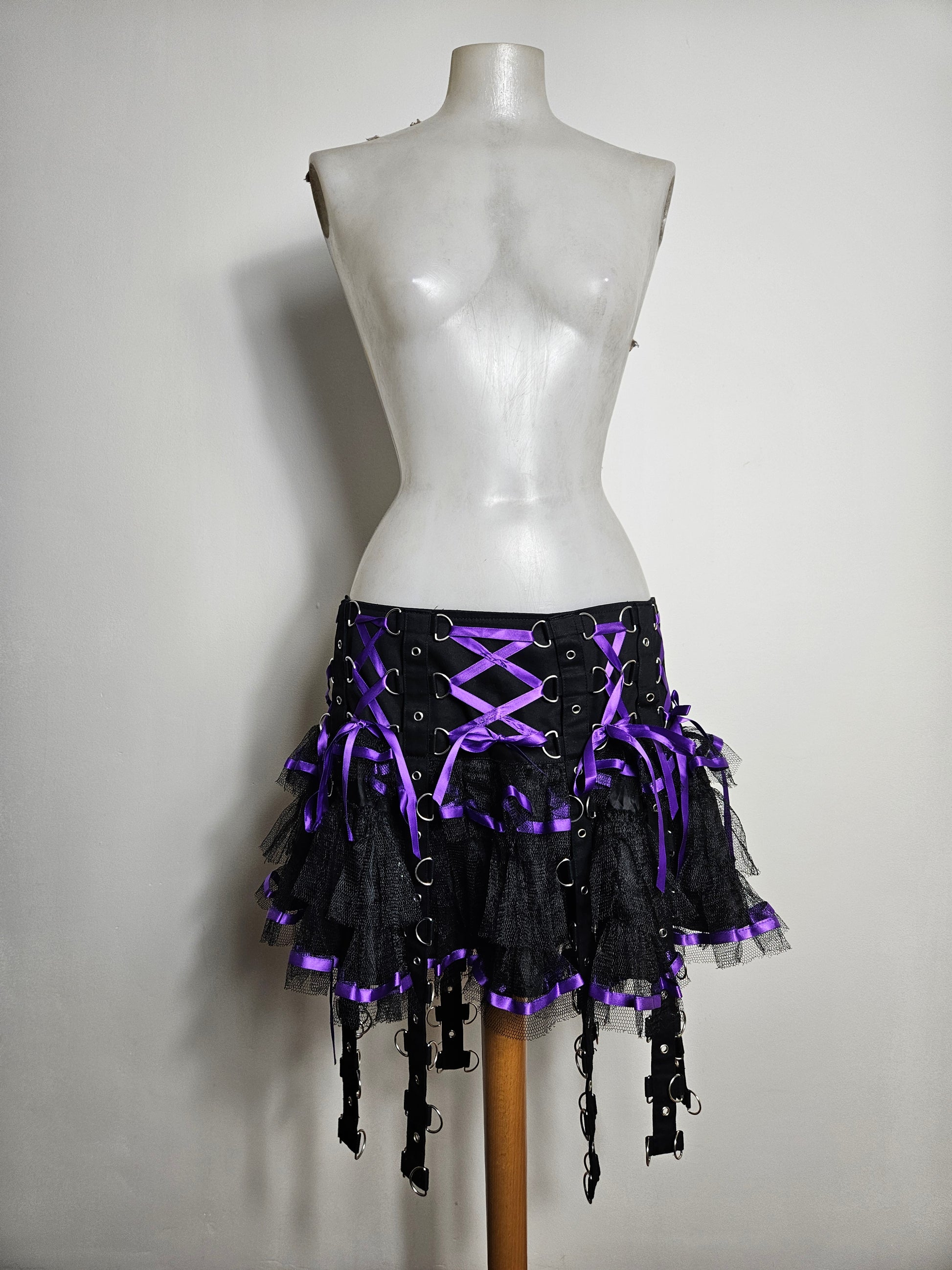- Ceinture à œillets métalliques et laçages satiné violet croisés sur le devant